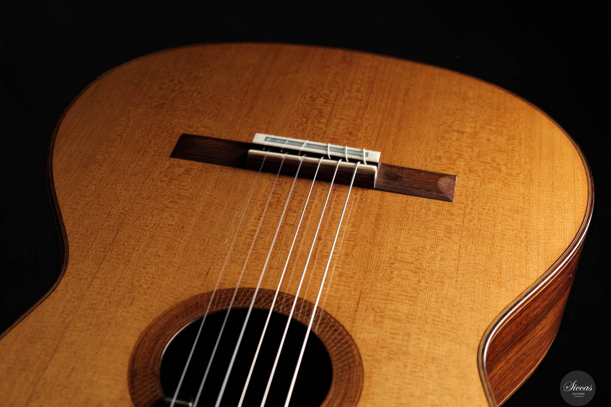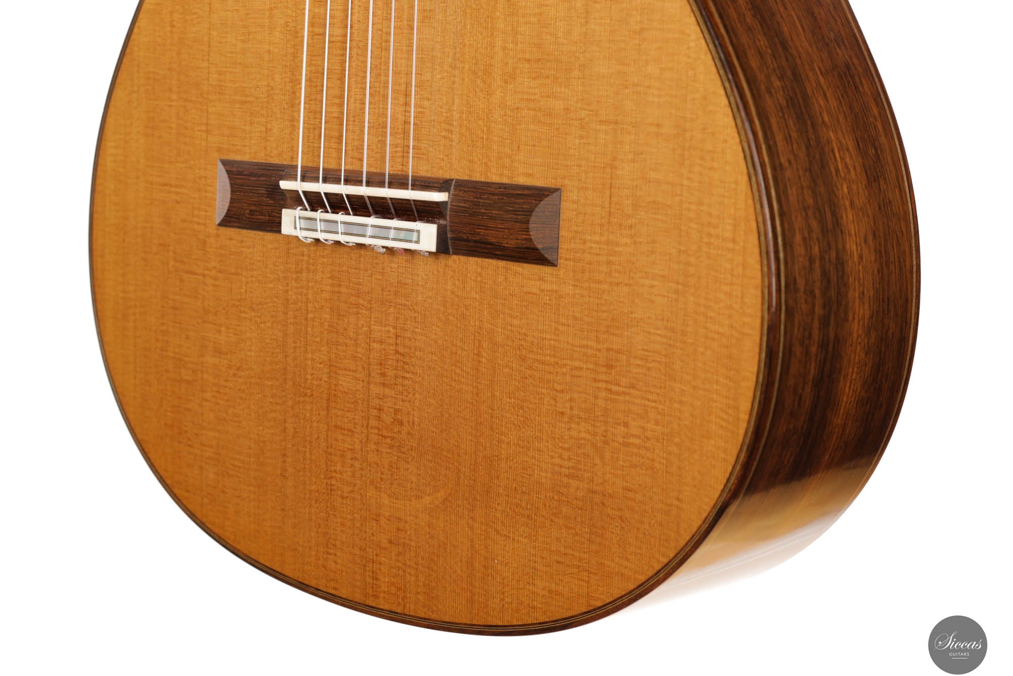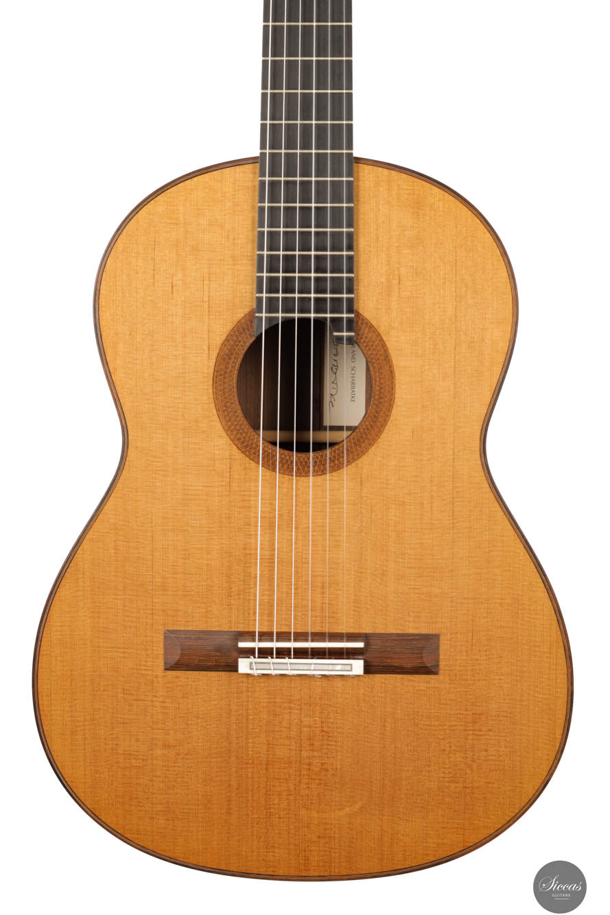 Die 2016 von Roland Scharbatke gefertigte Gitarre ist ein Meisterwerk, das Form und Funktion in einer Darstellung unvergleichlicher Handwerkskunst vereint. Sobald man auf diese Gitarre trifft, fordert ihr elegantes Design sofort Aufmerksamkeit, wobei Scharbatkes akribische Aufmerksamkeit sowohl auf ihre akustischen Eigenschaften als auch auf ihre ästhetische Anziehungskraft gezeigt wird. Vom minimalistischen Kopfstock und der einzigartigen Rosette bis hin zu den harmonischen Proportionen wurde jedes Element dieses Instruments durchdacht gestaltet und hebt es über ein bloßes Werkzeug für Musik in den Bereich der Kunstfertigkeit. Die Verwendung von erstklassigem Zedernholz für die Decke und indischem Palisander für Rücken und Seiten trägt nicht nur zur spektakulären Materialqualität des Instruments bei, sondern verbessert auch seine klangliche Reichhaltigkeit. Trotz der Tatsache, dass es sich um ein bereits geliebtes Stück handelt, bleibt diese Gitarre in sehr gutem Zustand, mit nur leichten Gebrauchsspuren ohne strukturelle Schäden, ein Zeugnis für ihre Haltbarkeit und die Qualität der Handwerkskunst, die in ihre Erstellung eingeflossen ist.