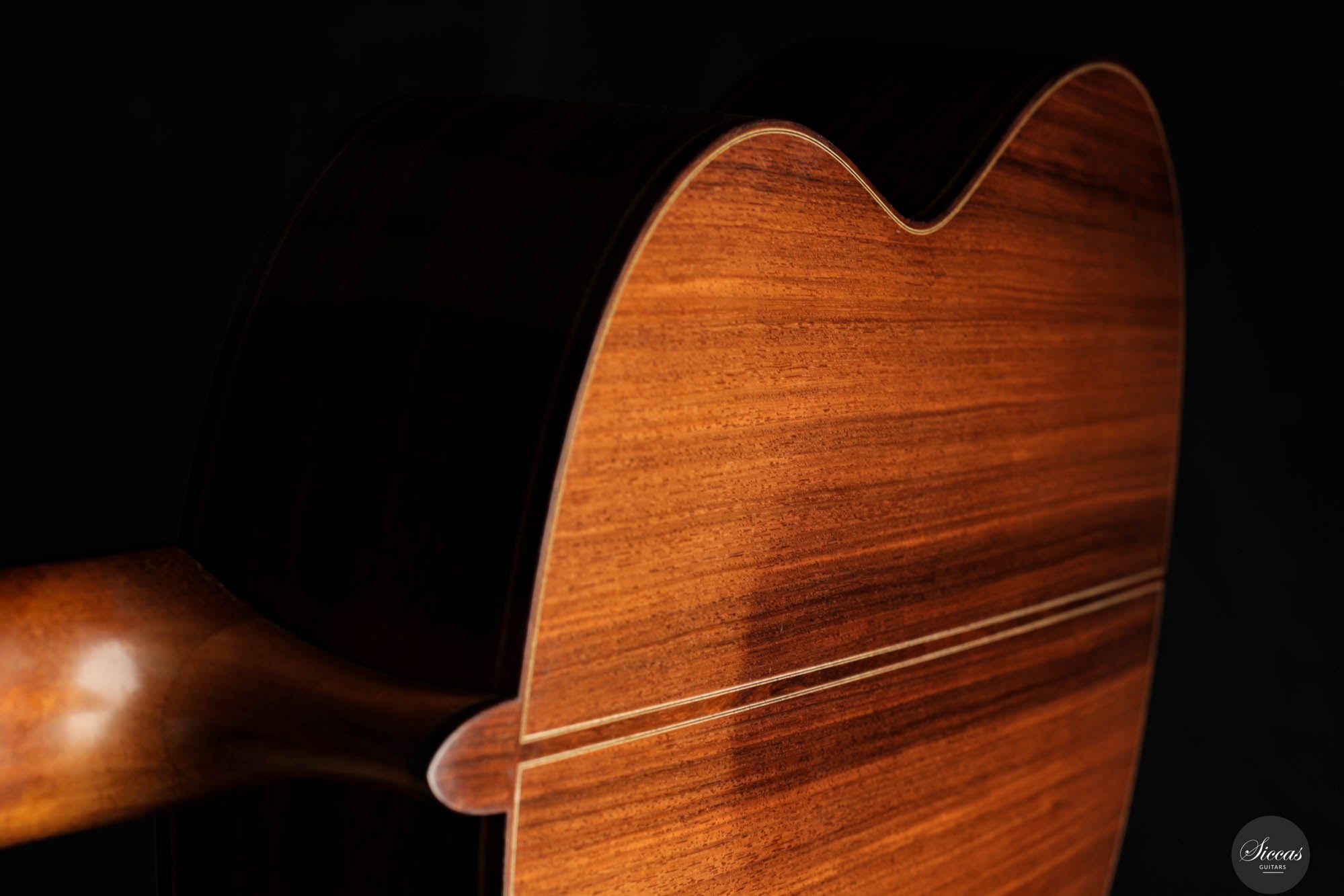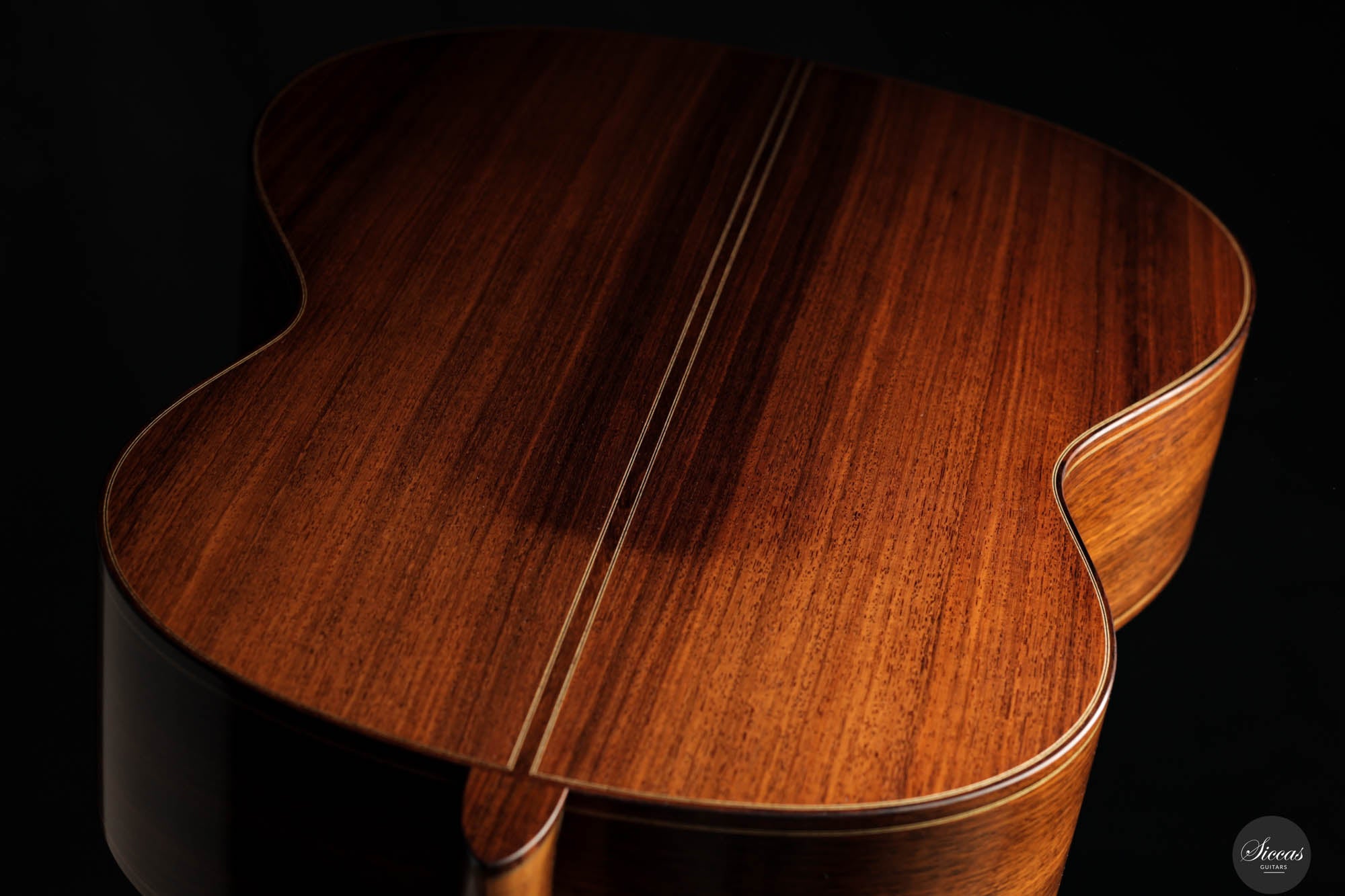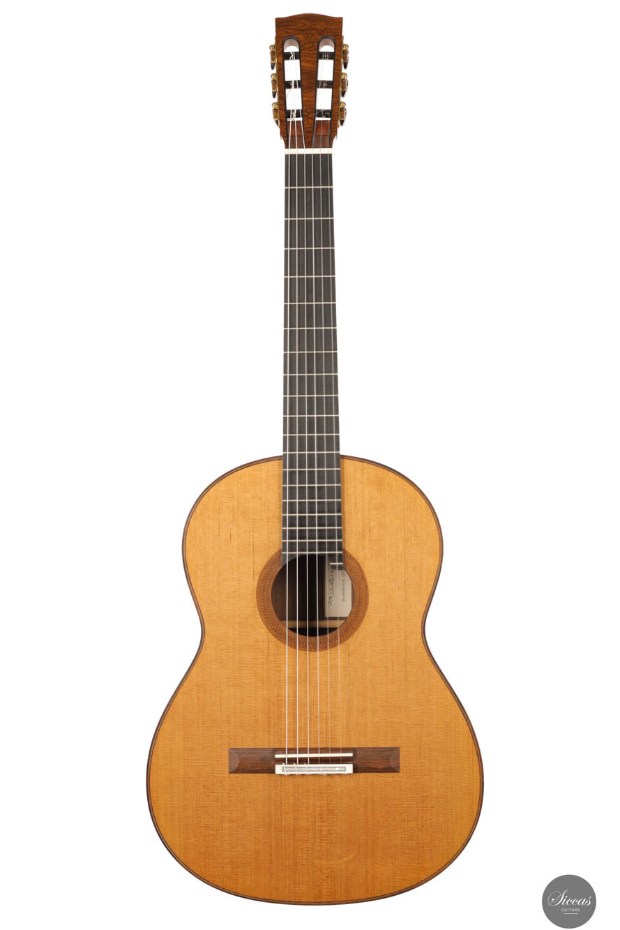 Die 2016 von Roland Scharbatke gefertigte Gitarre ist ein Meisterwerk, das Form und Funktion in einer Darstellung unvergleichlicher Handwerkskunst vereint. Sobald man auf diese Gitarre trifft, fordert ihr elegantes Design sofort Aufmerksamkeit, wobei Scharbatkes akribische Aufmerksamkeit sowohl auf ihre akustischen Eigenschaften als auch auf ihre ästhetische Anziehungskraft gezeigt wird. Vom minimalistischen Kopfstock und der einzigartigen Rosette bis hin zu den harmonischen Proportionen wurde jedes Element dieses Instruments durchdacht gestaltet und hebt es über ein bloßes Werkzeug für Musik in den Bereich der Kunstfertigkeit. Die Verwendung von erstklassigem Zedernholz für die Decke und indischem Palisander für Rücken und Seiten trägt nicht nur zur spektakulären Materialqualität des Instruments bei, sondern verbessert auch seine klangliche Reichhaltigkeit. Trotz der Tatsache, dass es sich um ein bereits geliebtes Stück handelt, bleibt diese Gitarre in sehr gutem Zustand, mit nur leichten Gebrauchsspuren ohne strukturelle Schäden, ein Zeugnis für ihre Haltbarkeit und die Qualität der Handwerkskunst, die in ihre Erstellung eingeflossen ist.