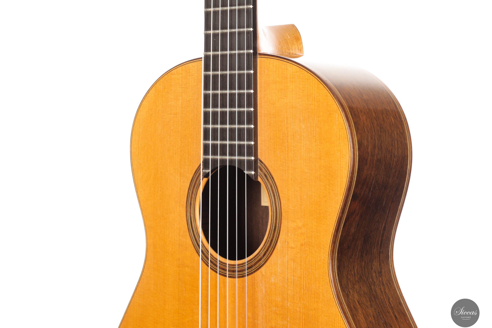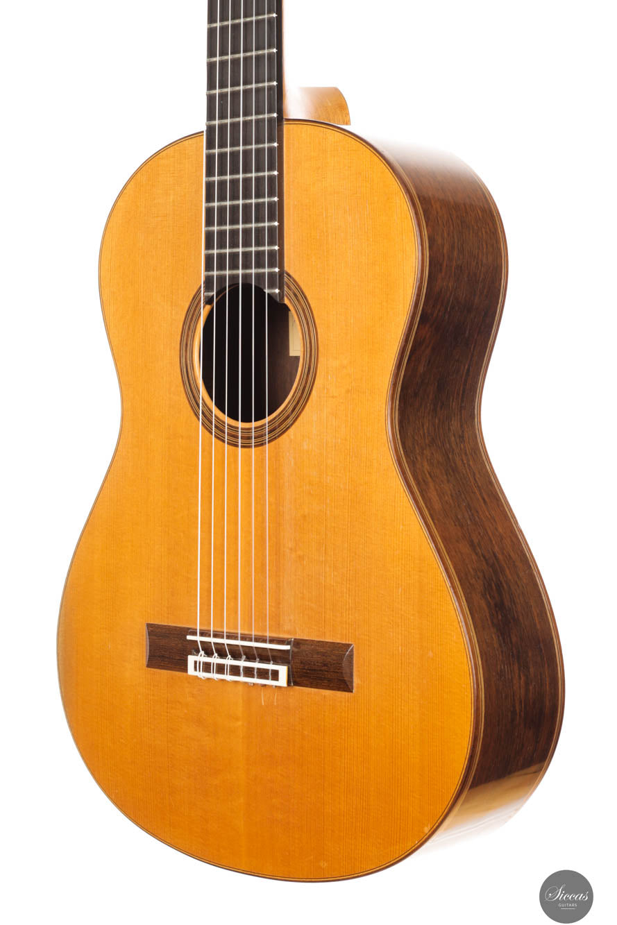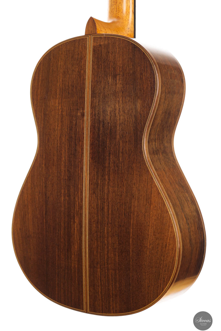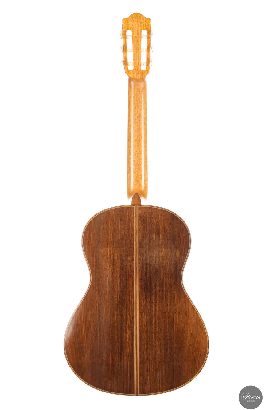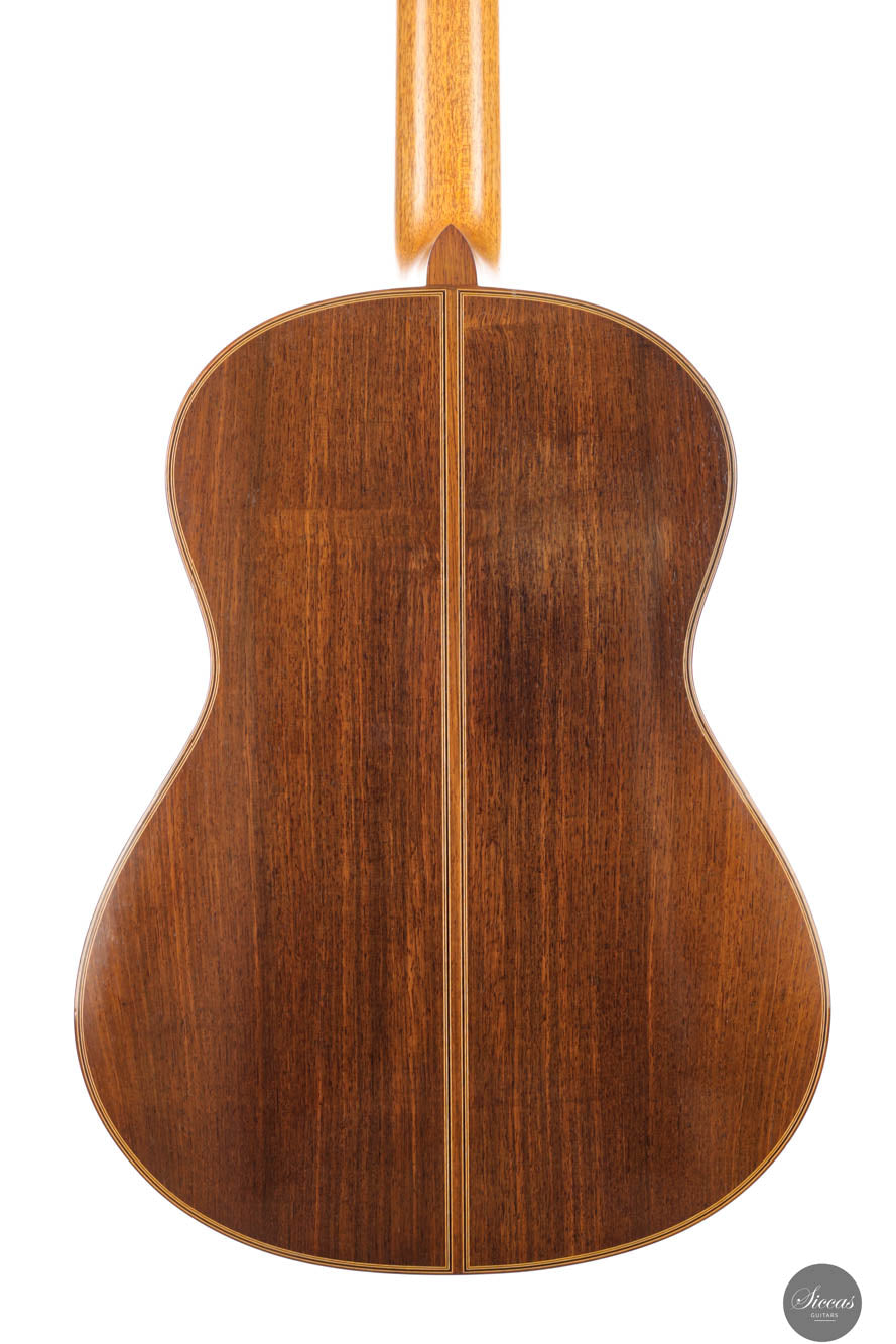 Dieses bemerkenswerte Instrument verbindet das reiche Erbe der spanischen Tradition mit der Präzision deutscher Ingenieurskunst und spiegelt Rolfs Status als einer der herausragendsten deutschen Gitarrenbauer wider. Es zeigt seine tiefe akustische Expertise und bietet beeindruckende Kraft, Spielbarkeit und eine verfeinerte Klangpalette. Die Höhen sind geschmeidig und äußerst reaktionsschnell, während der Korpus aus brasilianischem Palisander von seltener und außergewöhnlicher Qualität gefertigt ist, die heute nur schwer zu finden ist. In gutem Zustand zeigt die Gitarre Zeichen regelmäßigen Spielens, was ihren Charakter und Charme verstärkt. Die Kopfplatte weist zwei nicht durchgehende Risse auf, die rein kosmetisch sind und weder die strukturelle Integrität noch die Leistung der Gitarre beeinträchtigen.