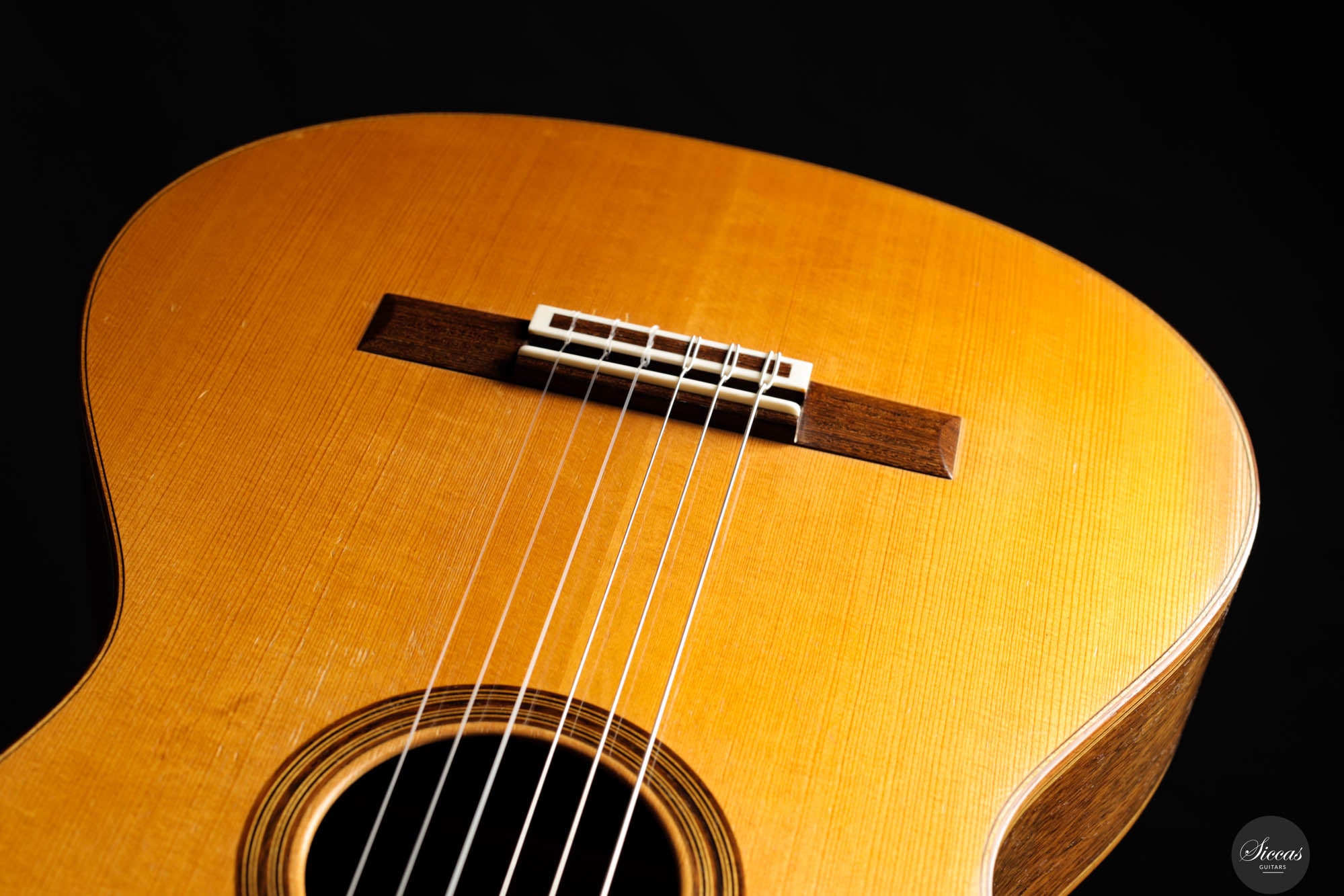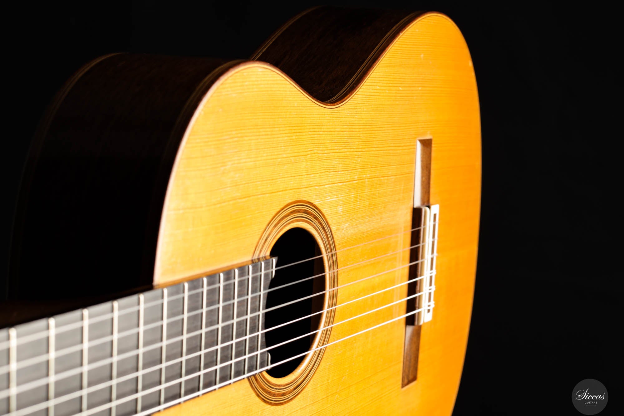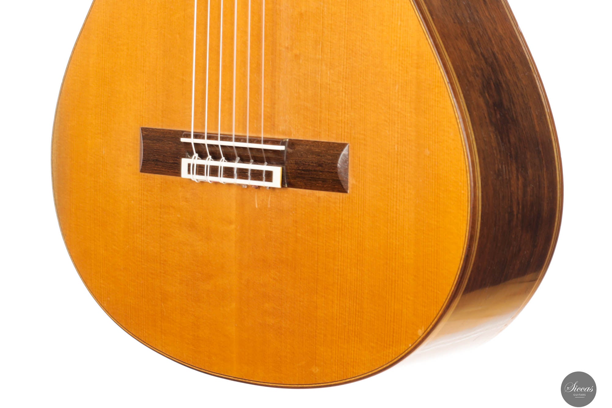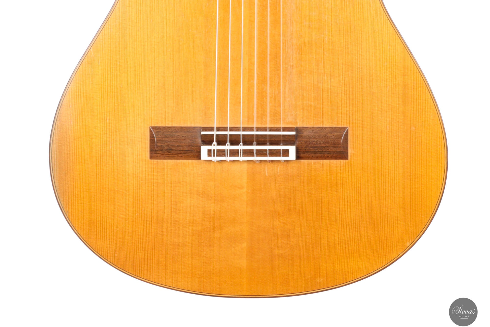 Dieses bemerkenswerte Instrument verbindet das reiche Erbe der spanischen Tradition mit der Präzision deutscher Ingenieurskunst und spiegelt Rolfs Status als einer der herausragendsten deutschen Gitarrenbauer wider. Es zeigt seine tiefe akustische Expertise und bietet beeindruckende Kraft, Spielbarkeit und eine verfeinerte Klangpalette. Die Höhen sind geschmeidig und äußerst reaktionsschnell, während der Korpus aus brasilianischem Palisander von seltener und außergewöhnlicher Qualität gefertigt ist, die heute nur schwer zu finden ist. In gutem Zustand zeigt die Gitarre Zeichen regelmäßigen Spielens, was ihren Charakter und Charme verstärkt. Die Kopfplatte weist zwei nicht durchgehende Risse auf, die rein kosmetisch sind und weder die strukturelle Integrität noch die Leistung der Gitarre beeinträchtigen.