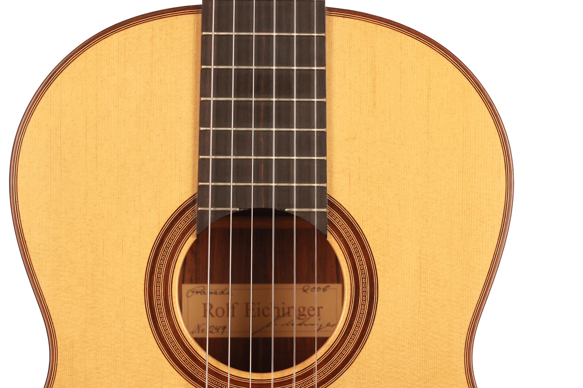 Rolf Eichinger was born on 10 September 1944 in Stuttgart. As a young man he studied industrial design. As he became more and more interested in guitar playing, he turned out to be an excellent guitarist and worked as a guitar teacher at Stuttgart’s music school for several years. On extensive journeys and stays in Spain, especially Andalusia, he learned the language and made friends with some of Granada's best guitar builders, e.g. Antonio Marin Montero or Jose Lopez Bellido. Rolf always brought guitars back to Germany from his travels for his students. The demand increased so much that he decided to open a guitar shop. In 1997 Rolf decided to move to Granada, where in his opinion the most outstanding contemporary masters of guitar making lived, and from where he had gained the great inspiration for his own work in order to establish himself as a luthier there. In 2007 he fell seriously ill with cancer and moved to Salobrena on the south coast of Andalusia. There he died on 18 September 2009. During his time as a guitar builder Rolf Eichinger built about 300 instruments.