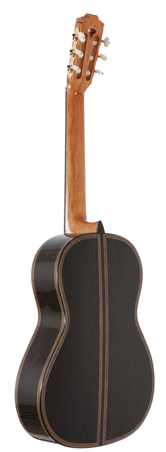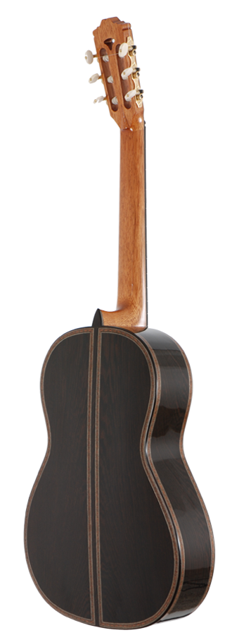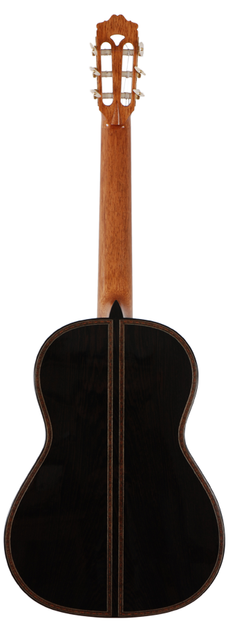 The top of this precious guitar is made of cedar, the purflings consist of wenge wood, which was also used to construct the guitar’s back and ribs. The bracing which can be found on the inner side of the guitar’s back is made of cedar, whereas on the top’s side a mixture of cedar and spruce bracings can be detected. The wood shavings used for the purflings are mosaics which consist of maple which was stained with natural dyes. The composition of different mosaic motifs was done by Roy Fankhänel following the example of Francisco Simplicio. Inlays on nut and bridge consist of bone. The guitar is coated with shellac (high-gloss closed porous). The tuning system by Rubner have a teflon bearing (tuners and tuning pegs consist of artificial ivory).