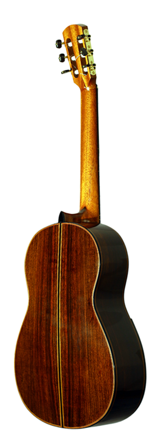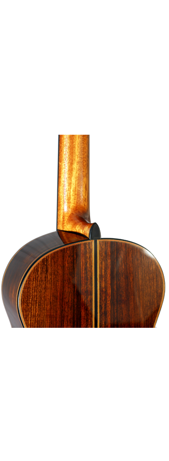 Roy Fankhänel has created a real sound sensation by building this guitar. Nonetheless, it is not only the sound which is special and excellent, it is also the guitar’s aesthetics and its whole fabrication. The top consists of finely grained spruce, embellished with a noble shellac polish. The top’s purfling and the rosette with the skillfully and filigree arranged herringbone pattern increase the value of this guitar even more. The back has two parts which are connected to each other by the use of a dark ebony inlay. The purflings on the guitar’s back consist of an ebony inlay on the outside and whitish and light brown inlays on the inside. Those inlays do not only run along the outer frame of the back, but also along the ebony inlay, which connects the two parts of the back, so that both halves are framed. The back itself is made of East Indian rosewood. The neck, as well as the head, consists of mahogany. However, the head has an added cover of ebony on its front-side. As a supporting aid for the guitarist, Roy Fankhänel has installed an armrest, which blends in perfectly with the overall design.