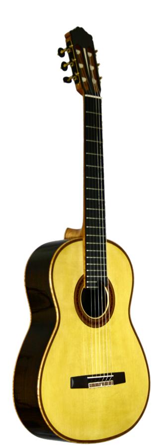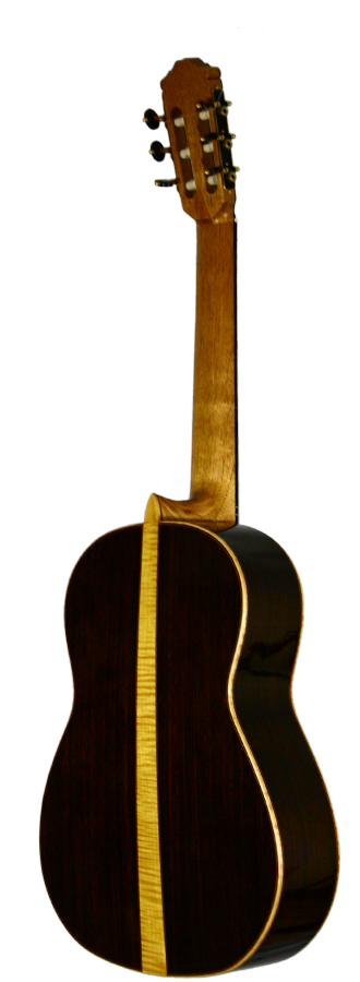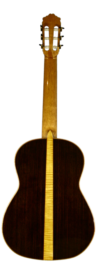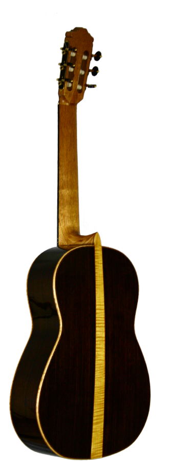 Sound, aesthetics and the excellent fabrication characterize the guitars constructed by Roy Fankhänel. The top consists of finely grained alpine spruce which is embellished with a shellac polish. The top’s frame is made of figured maple which is skillfully gentrified on the inner side with filigree inlays. The rosette consists of mosaic motifs and is made up of longitudinal wood shavings. The back has two parts, which are connected to each other by the use of a maple inlay. The purflings on the guitar’s back consist of a red inlay which is bordered on the in- and outside by light-coloured inlays. Those inlays do not only run along the outer frame of the back, but also along the maple inlay in the middle of the back, so that both halves are framed. The back itself consists of East Indian rosewood. Neck and head are made of cedro, whereby the head has an added cover of East Indian rosewood on its front-side. The machine heads are from Baljak.