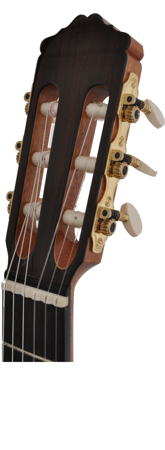 This guitar, built by Roy Fankhänel in 2011, was based on a Francisco Simplicio model. Nevertheless, Roy Fankhänel has brought in many of his own ideas in the construction of this model, like for example his self-designed bracing system. Also the rosette is based on his own mosaik motif with varicolored veneers. The Neck-Body connection follows the Spanish way of construction of Josè Romanillos whereby the head is connected with the guitar’s neck by a conical mortise joint. The guitar has a strongly arched back of 10 mm on a length of 600 mm. The crossbars are supported by brackets. The guitar is coated with shellac (high-gloss closed porous) and has mechanics by Rubner.