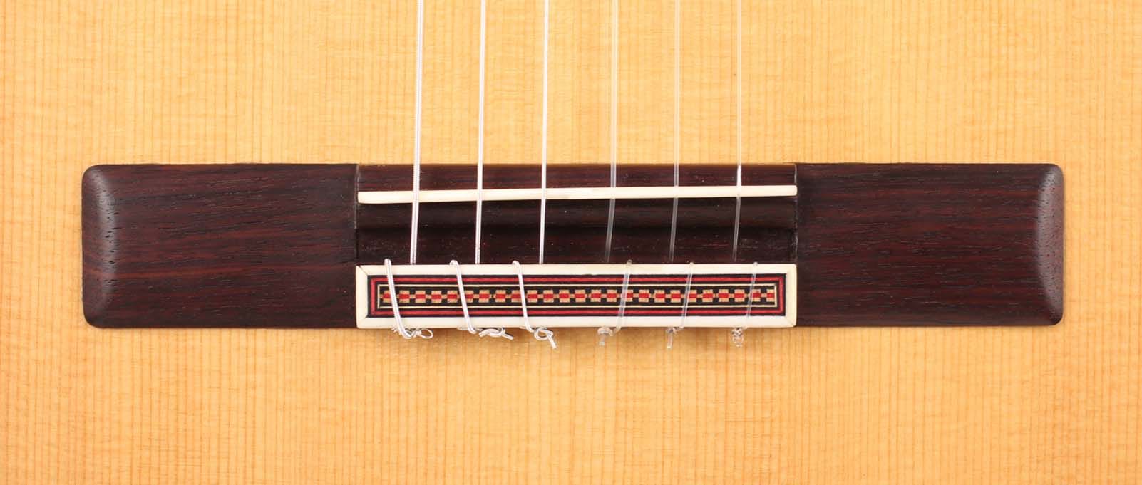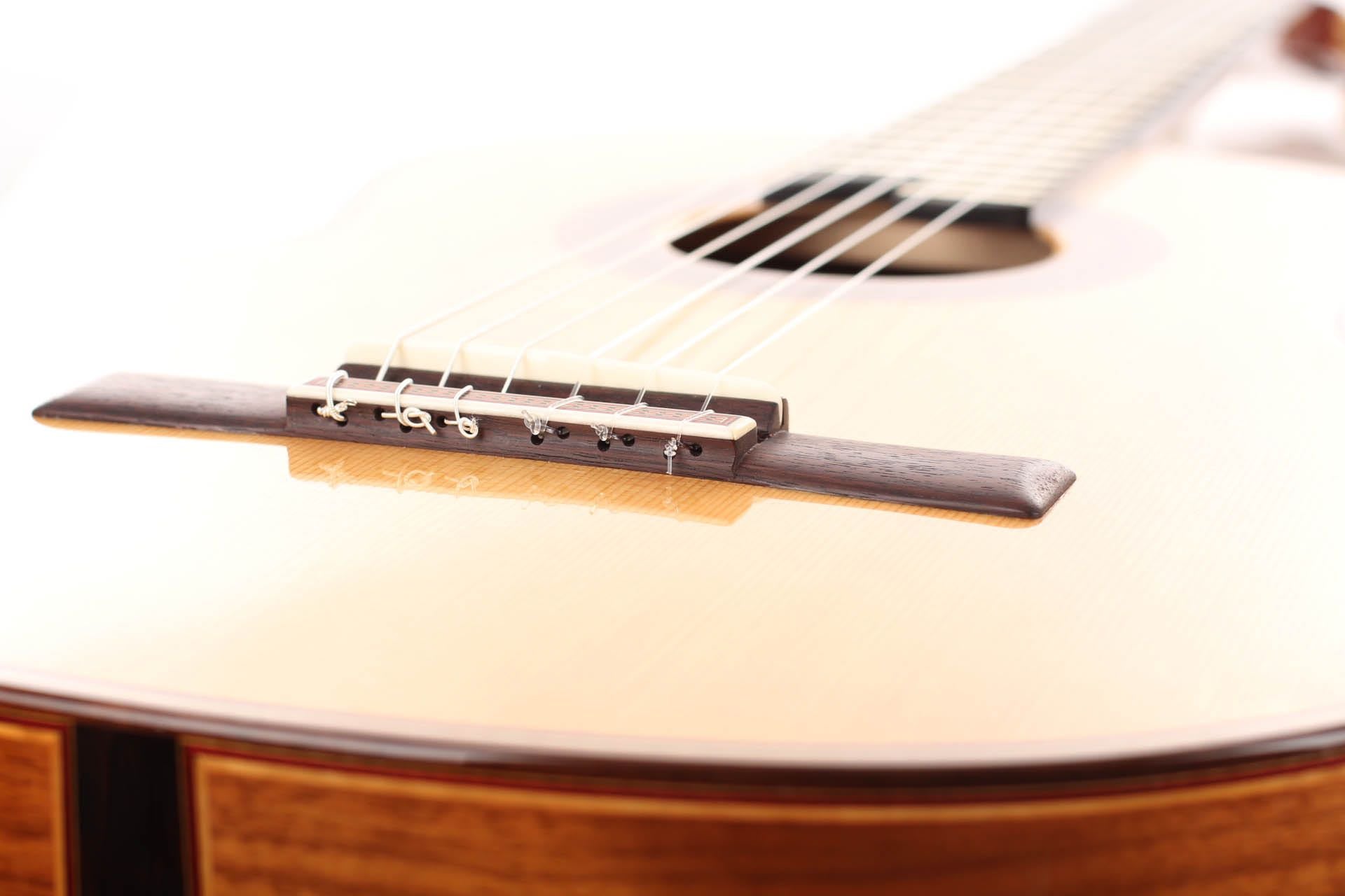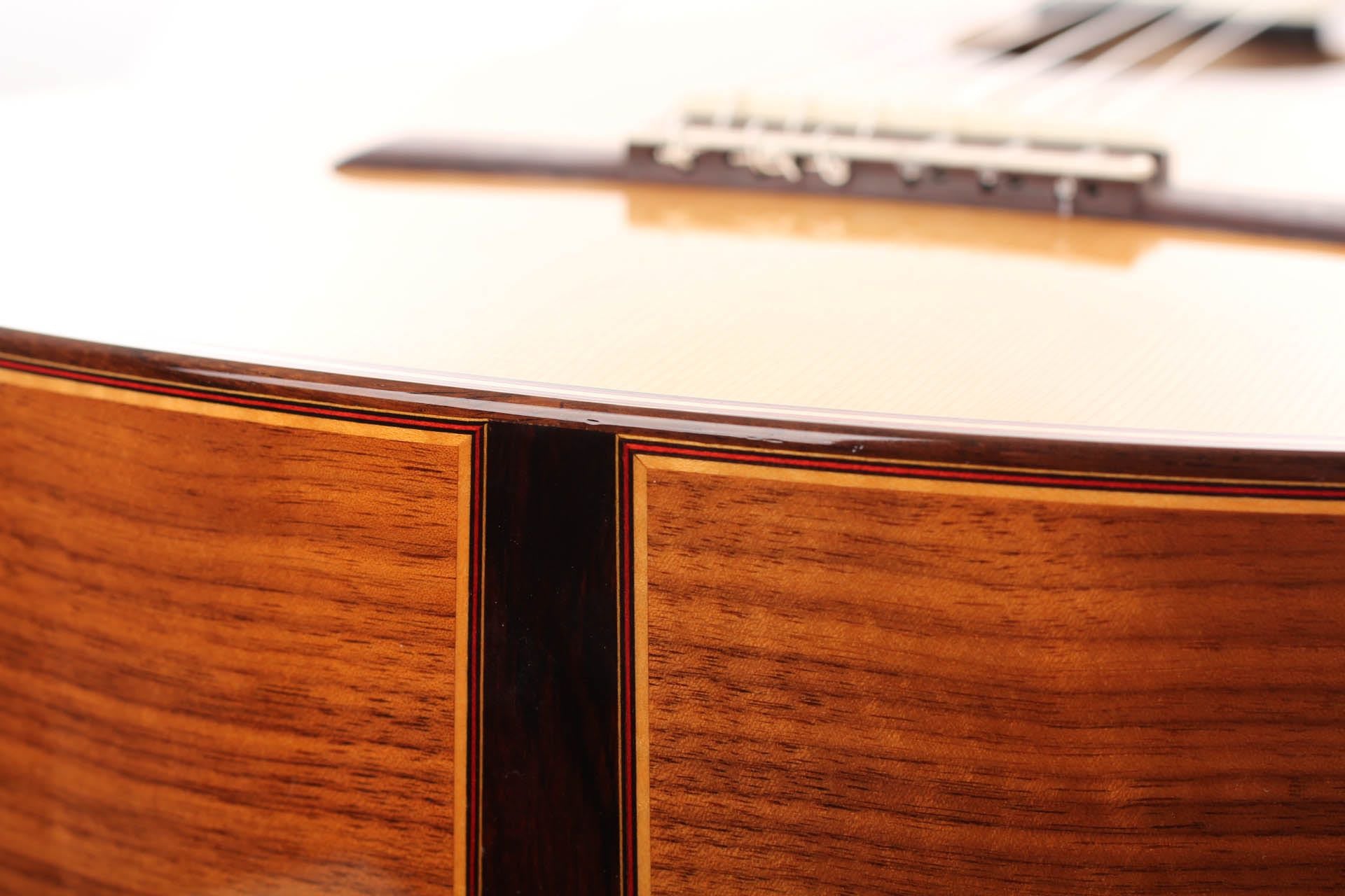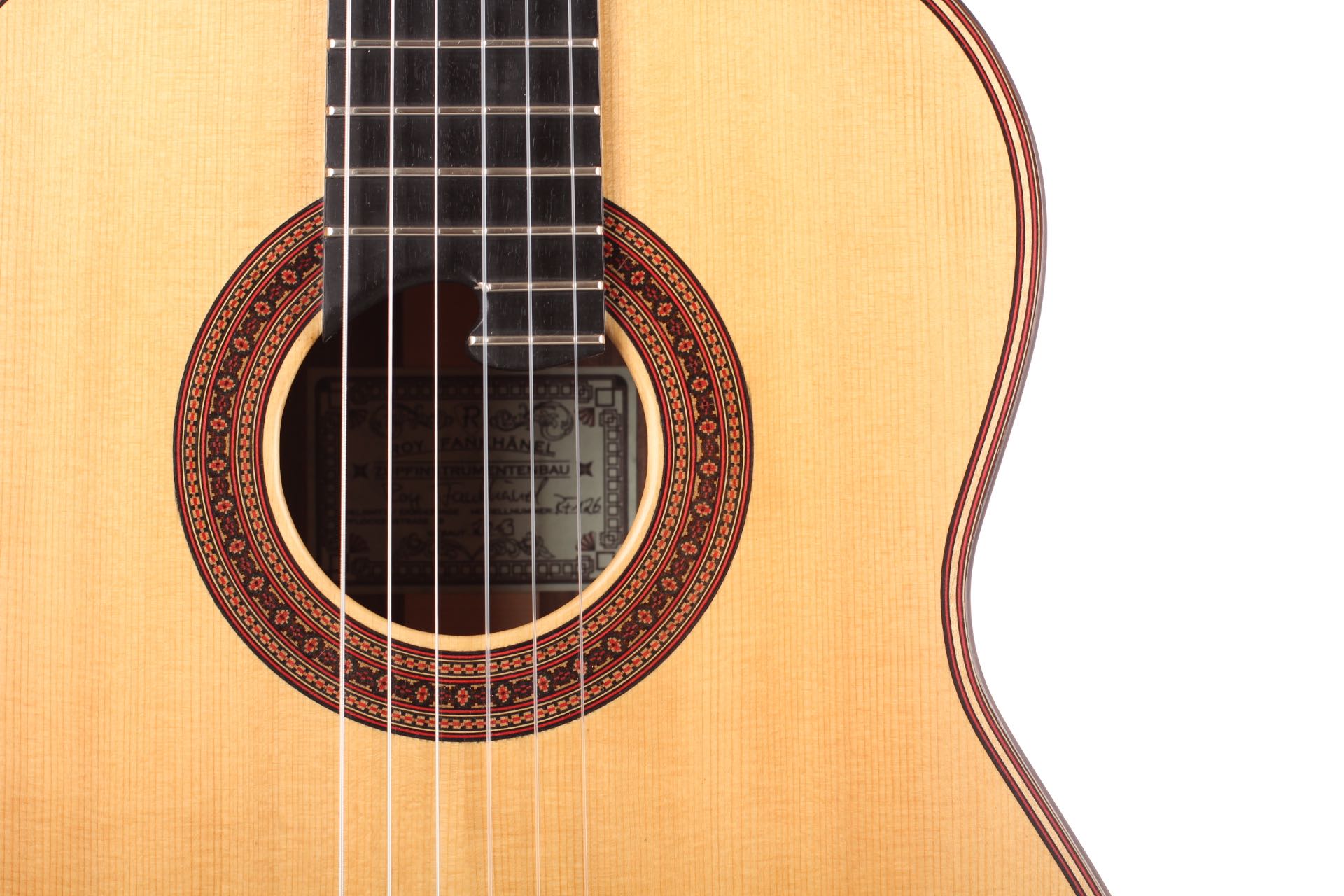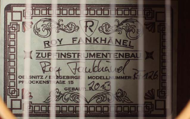 Sound, aesthetics and the excellent craftsmanship characterize the guitars constructed by Roy Fankhänel. The top is made of fine Alpine spruce and has a French polish finish. The top’s binding is made of flamed maple and rosewood. The rosette consists of mosaic and floral motifs. The back has two parts, which are connected to each other by the use of an Indian rosewood inlay. The back itself and the sides are made of Walnut wood. The tuning machines are made by Exagon. This guitar is used and has some signs on the top.