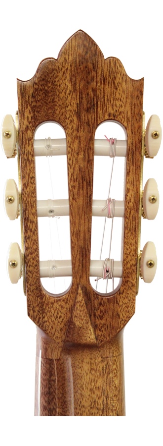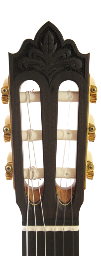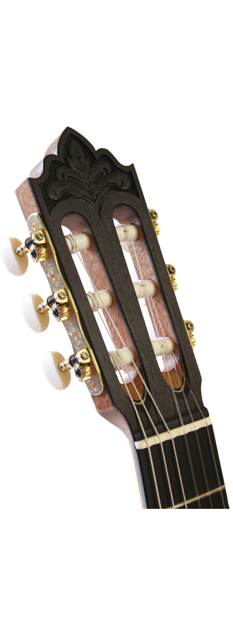 This beautiful guitar was developed in cooperation with „Siccas Guitars“. This guitar-type is a special edition which is only and exclusively available at “Siccas Guitars”. It has a variety of special features which can be found in this manner only on this guitar. The decorative elements like rosette and ornaments around the edge were specifically designed, and give the instrument a more traditional look. The head has a crown with carvings, which were especially created for this guitar. The bridge with its 12-hole-drilling fits perfectly into the overall picture of the guitar and is additionally decorated with a beautiful mother of pearl surrounding at its tie block. Eye-catching are also the purflings made of ovangkol, which stress the precious character of the guitar.