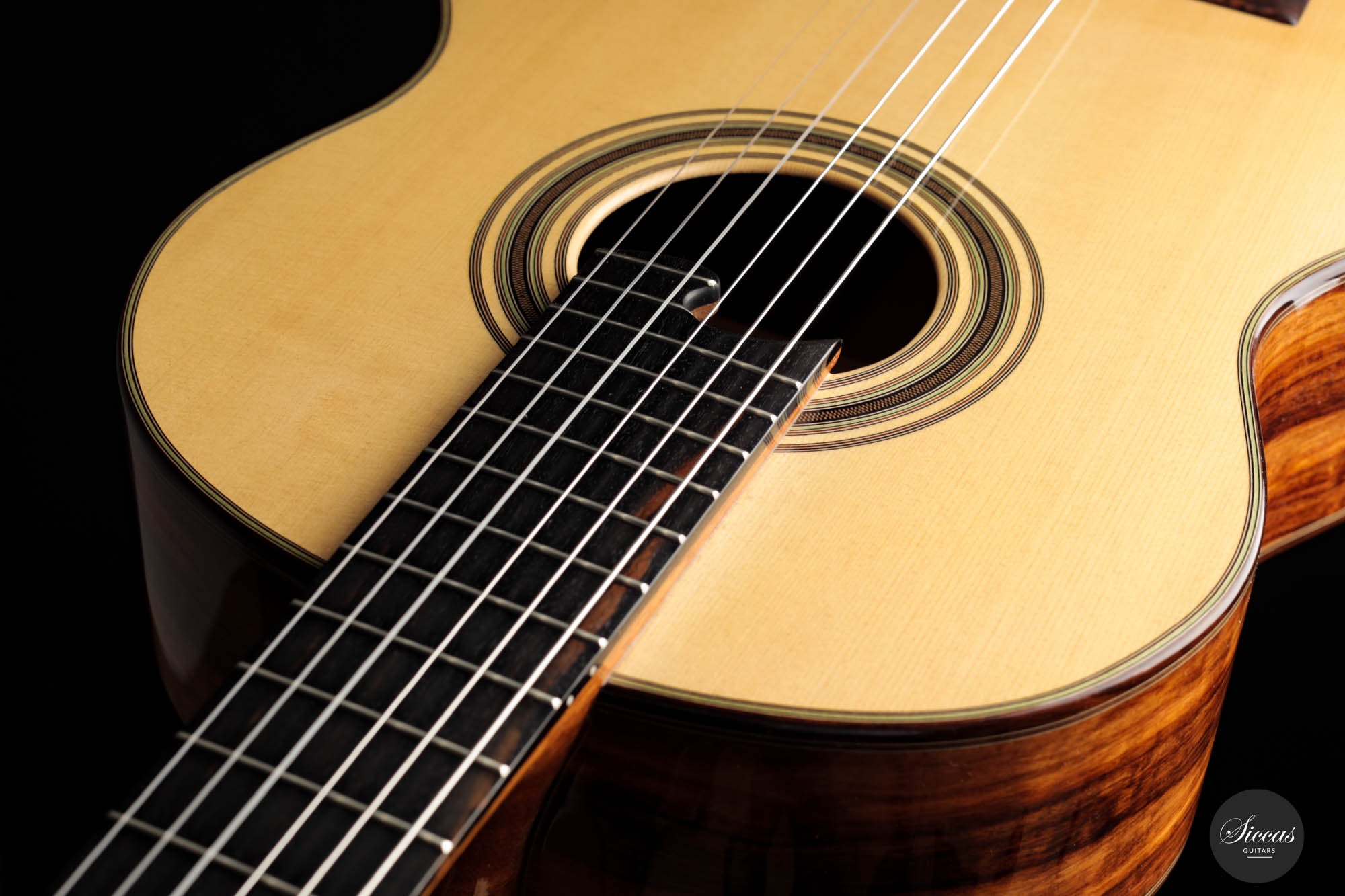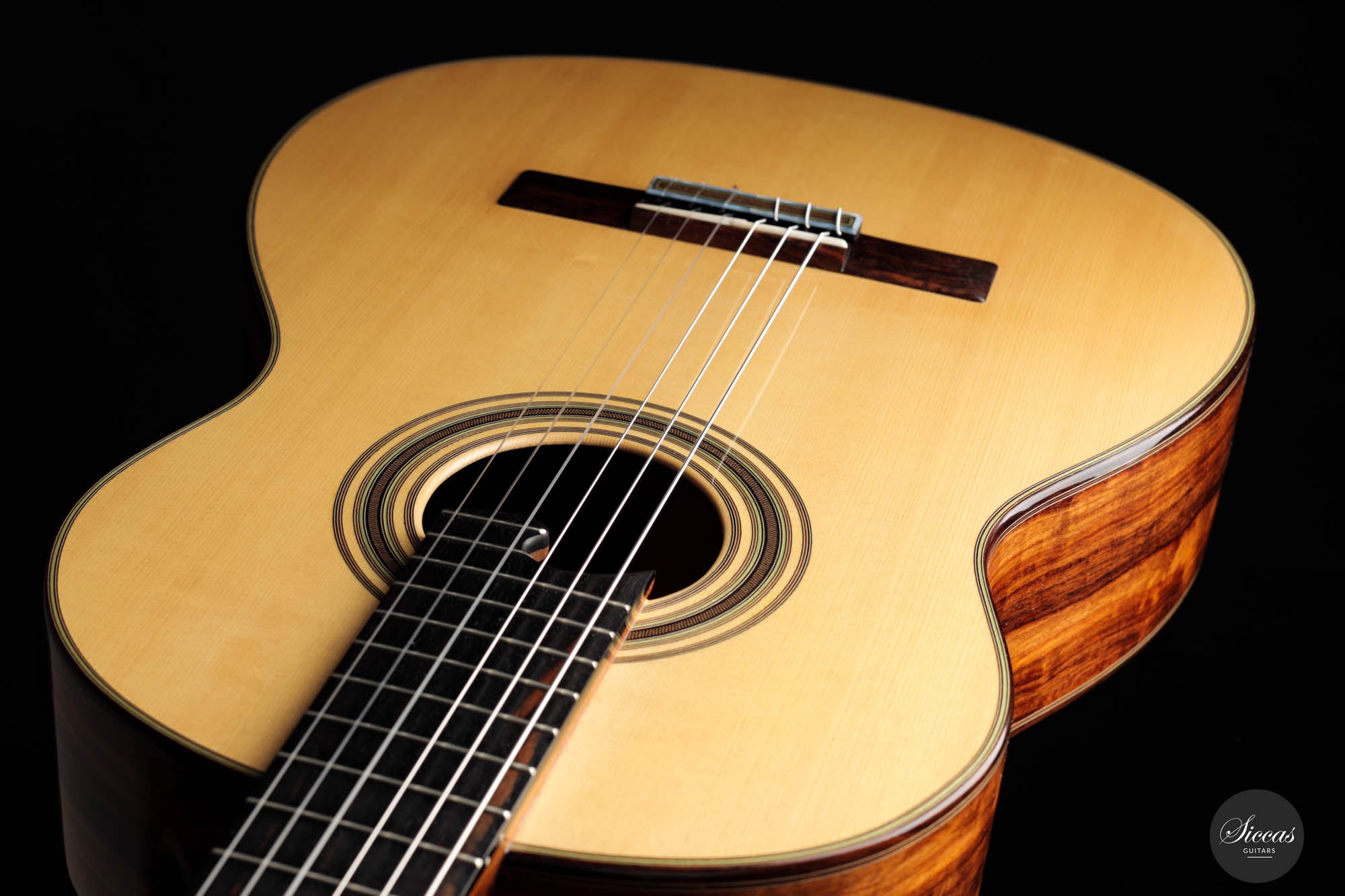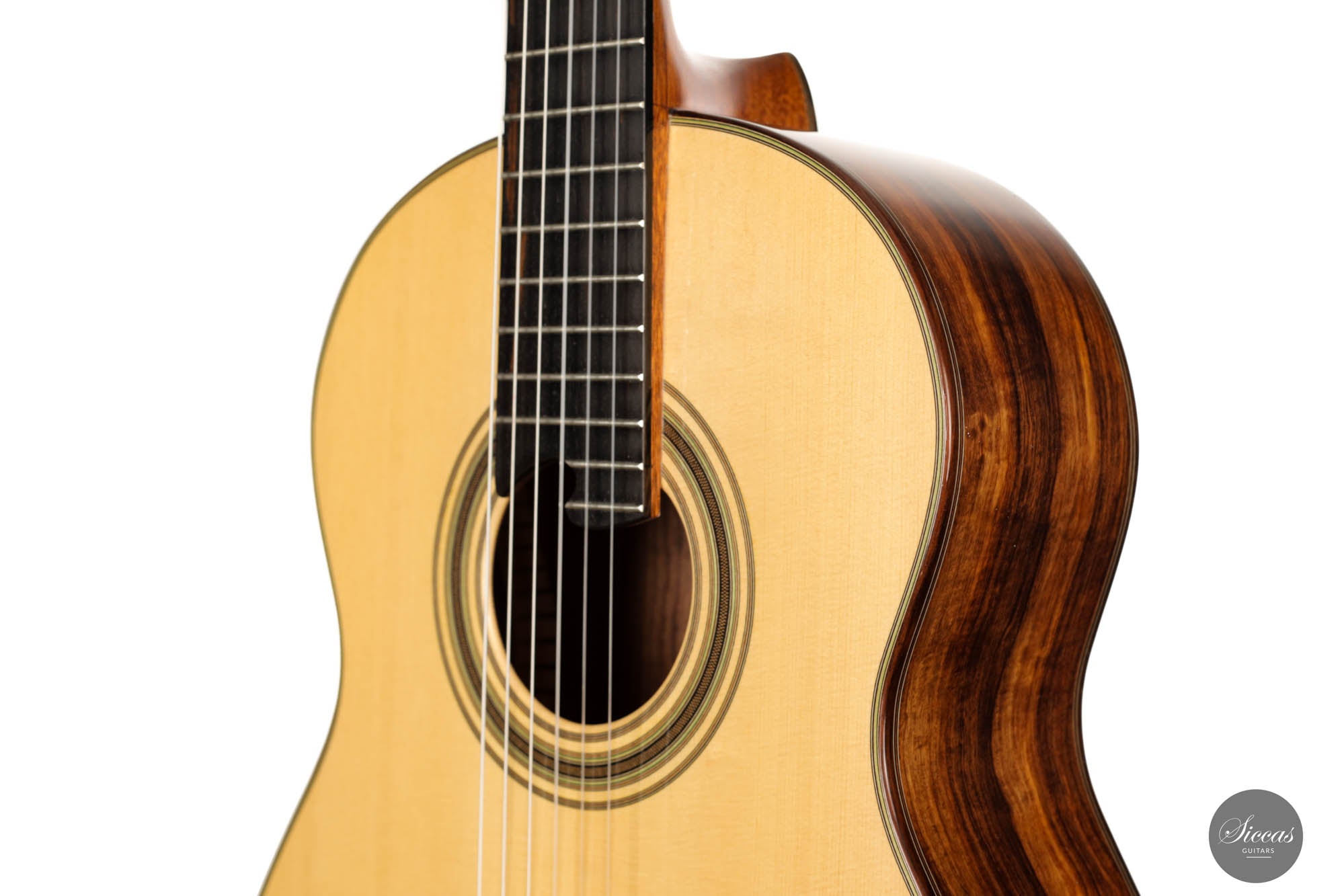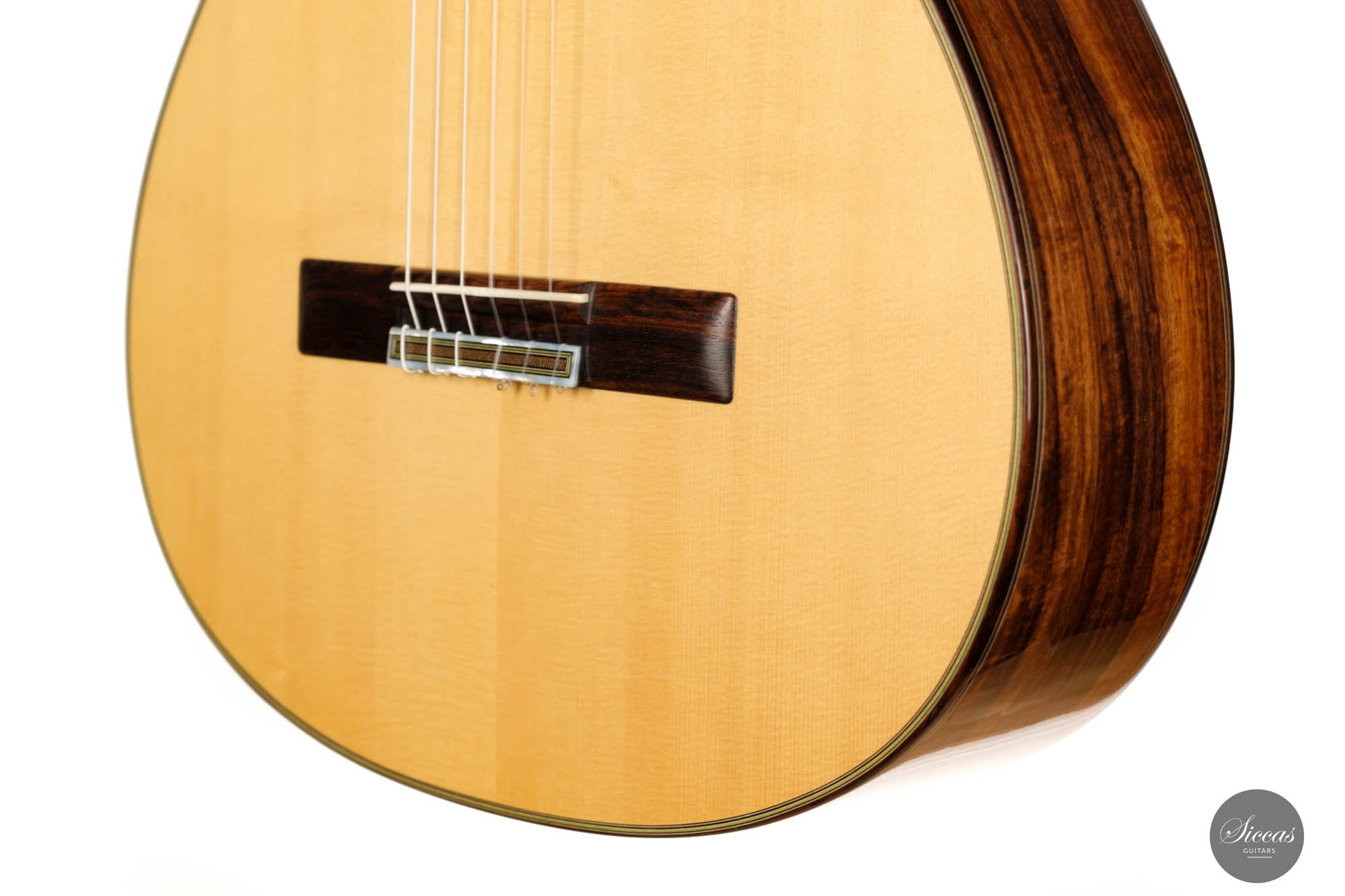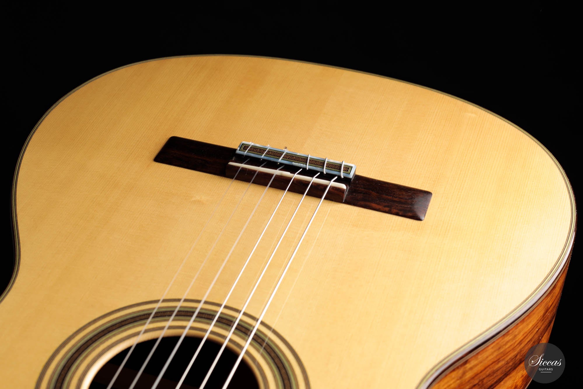 Das erste auffällige Element dieser Gitarre sind die speziell entworfenen Dekorationsmotive. Die Rosette und die Verzierungen, die die Bindung schmücken, sind sorgfältig gearbeitet und verleihen dem Instrument eine Aura von traditionellem Charme und zeitloser Eleganz. Die Brücke, gefertigt aus indischem Rosenholz, ist ein Zeugnis für feines Handwerk. Ihre 12-Loch-Bohrung harmoniert nahtlos mit der allgemeinen Ästhetik des Instruments.