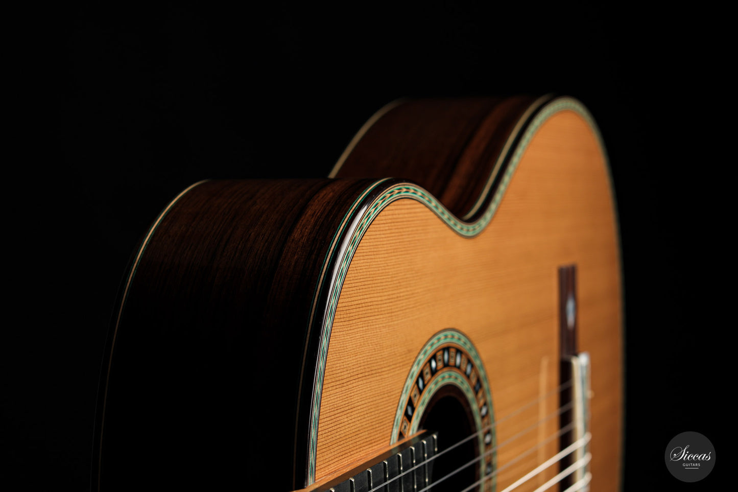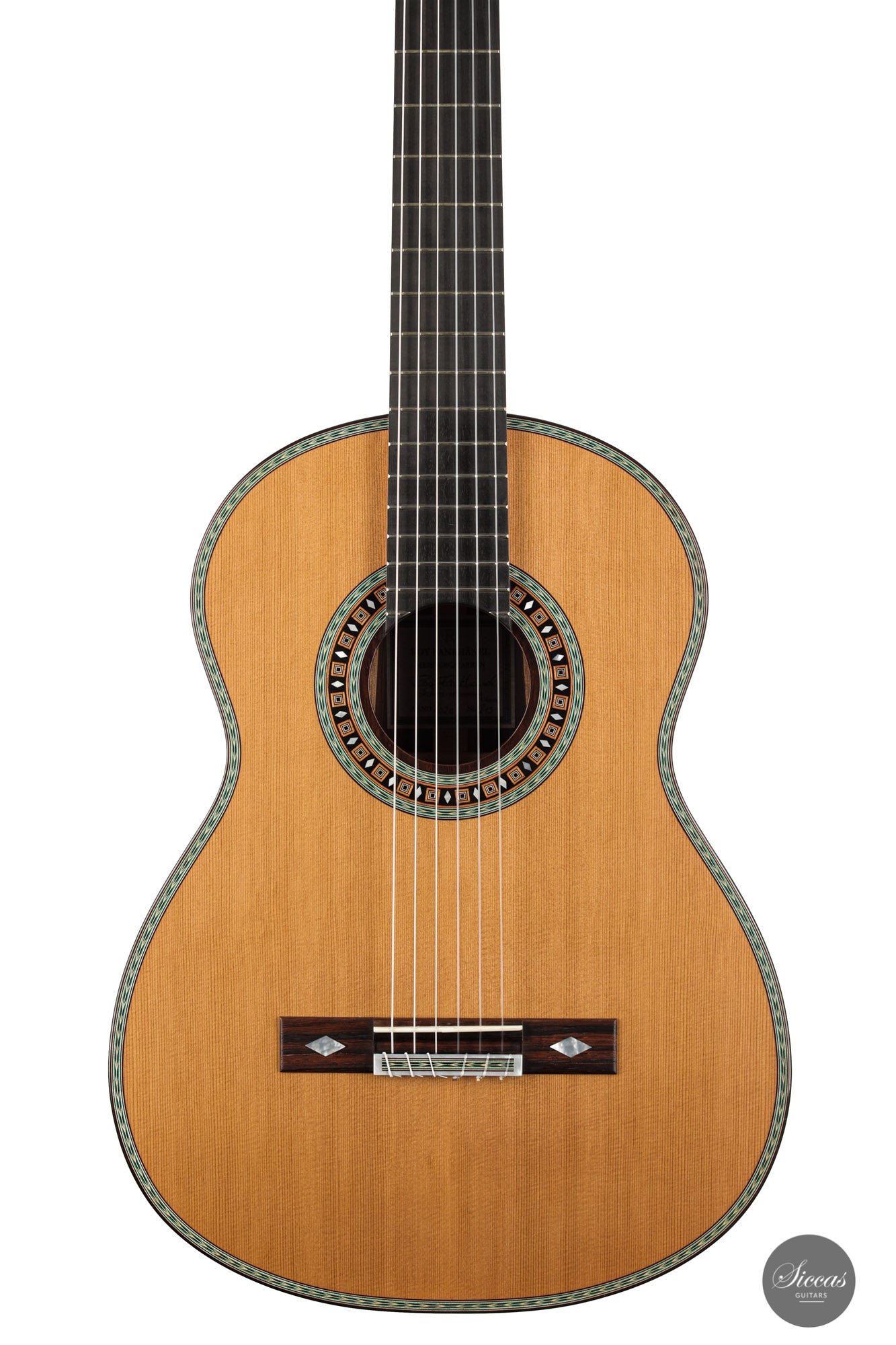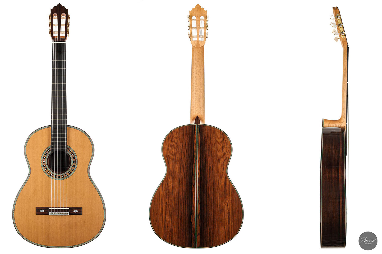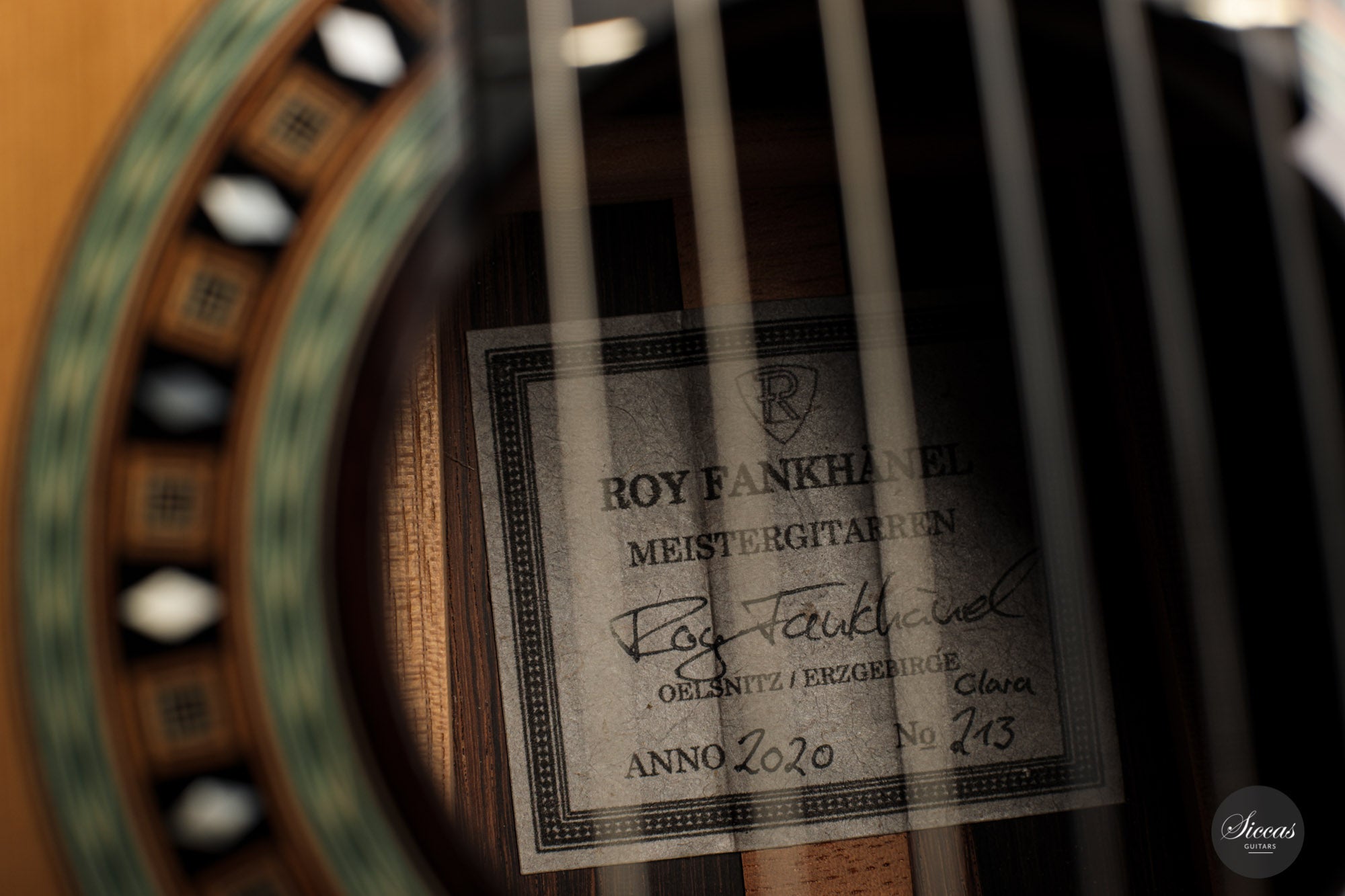 This beautiful guitar is Roy Fankhänel’s new model “Clara”, developed in early 2020. Roy has made some changes in the construction method to produce a guitar with even more projection and volume, as well as an elegant and elaborate appearance. This instrument has a special back bracing and triple sides. Nevertheless, the weight has not increased, and this lightweight guitar is very comfortable to handle. Numerous inlays, especially on the bridge and on the rosette, give it an imposing and well-conceived overall look that shows a strong influence of Spanish tradition.