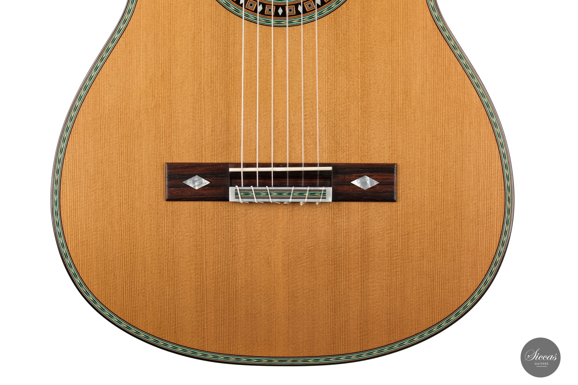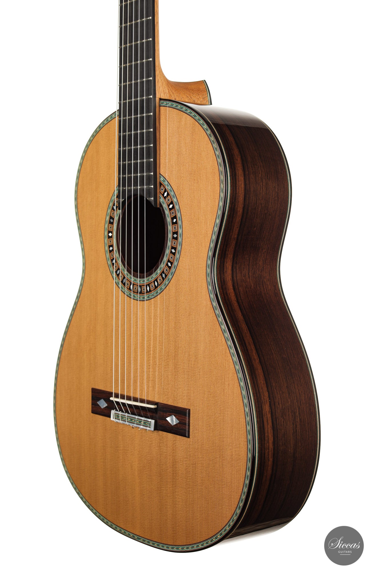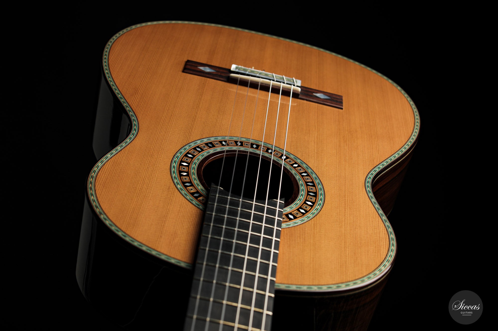 This beautiful guitar is Roy Fankhänel’s new model “Clara”, developed in early 2020. Roy has made some changes in the construction method to produce a guitar with even more projection and volume, as well as an elegant and elaborate appearance. This instrument has a special back bracing and triple sides. Nevertheless, the weight has not increased, and this lightweight guitar is very comfortable to handle. Numerous inlays, especially on the bridge and on the rosette, give it an imposing and well-conceived overall look that shows a strong influence of Spanish tradition.
