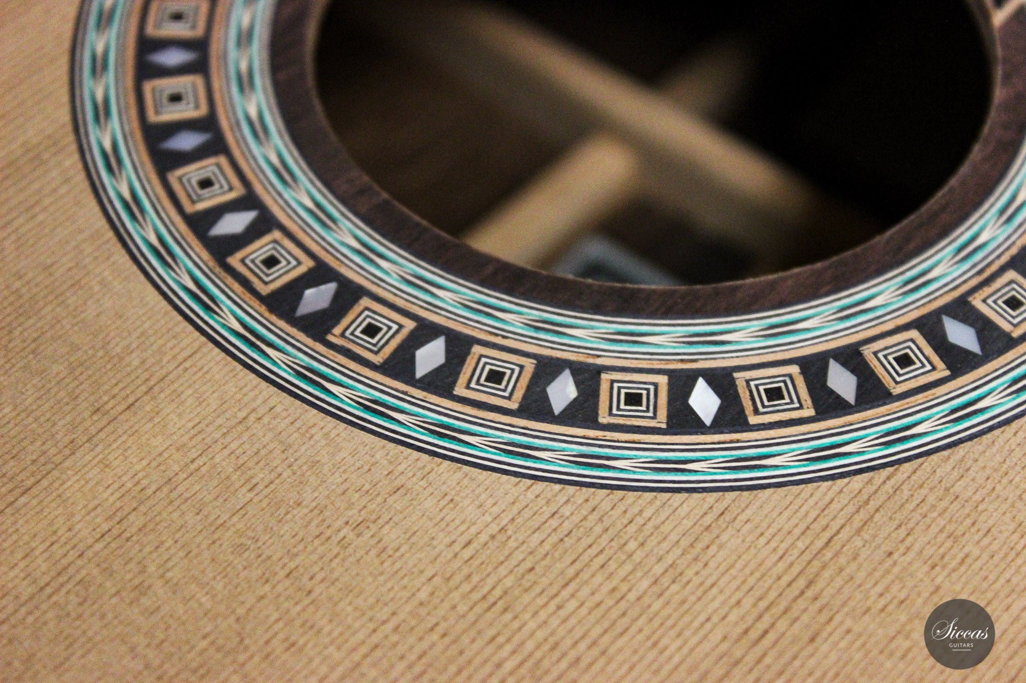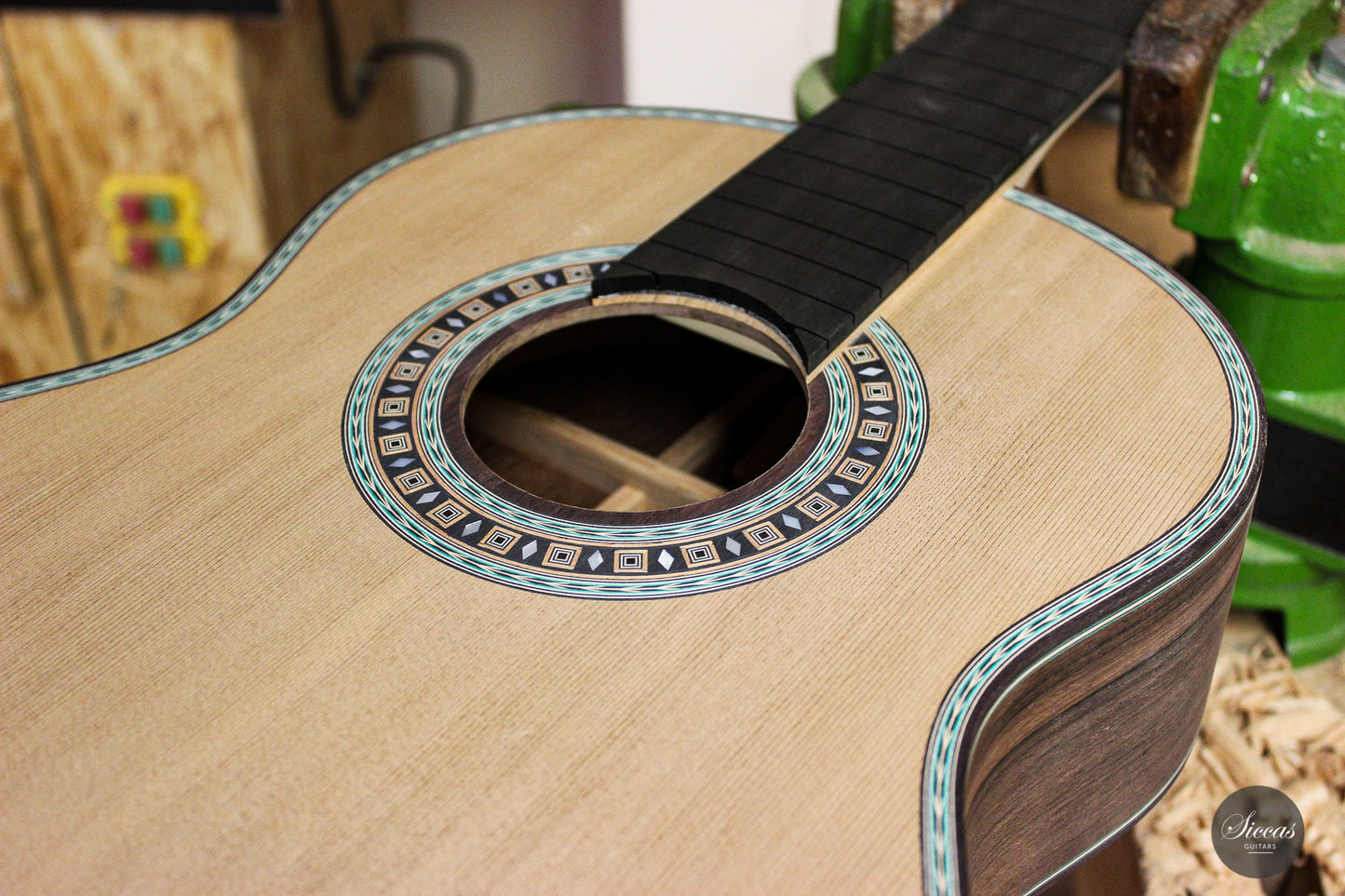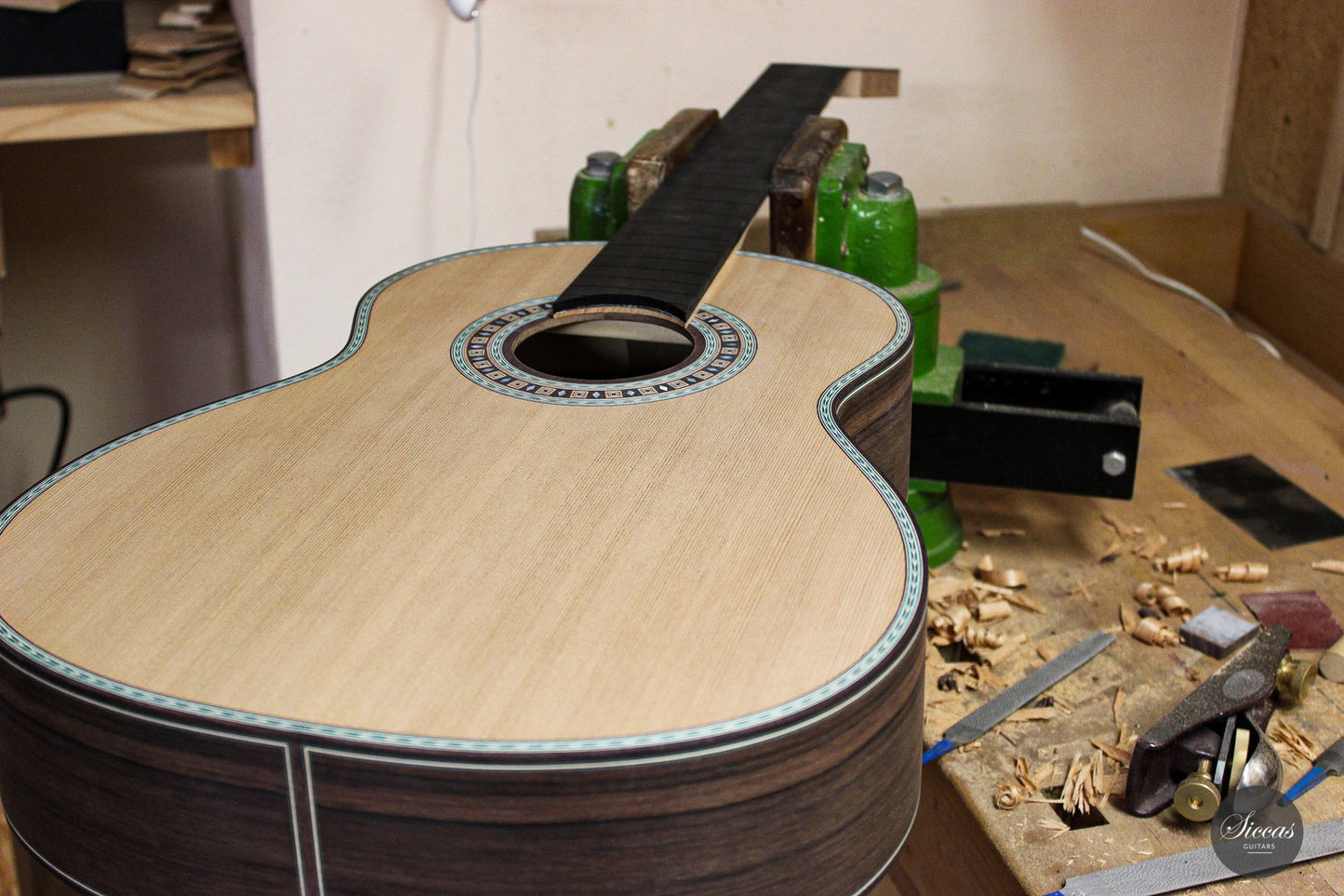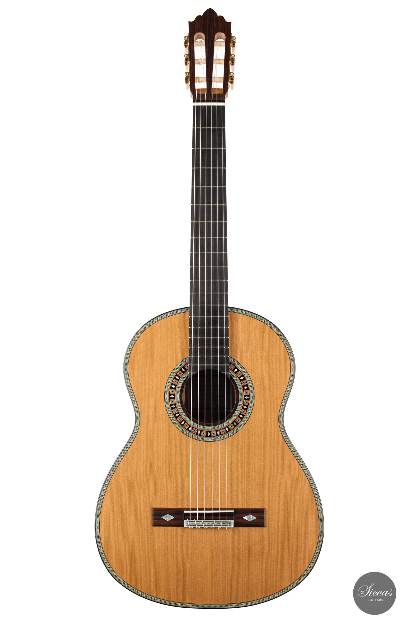 This beautiful guitar is Roy Fankhänel’s new model “Clara”, developed in early 2020. Roy has made some changes in the construction method to produce a guitar with even more projection and volume, as well as an elegant and elaborate appearance. This instrument has a special back bracing and triple sides. Nevertheless, the weight has not increased, and this lightweight guitar is very comfortable to handle. Numerous inlays, especially on the bridge and on the rosette, give it an imposing and well-conceived overall look that shows a strong influence of Spanish tradition.