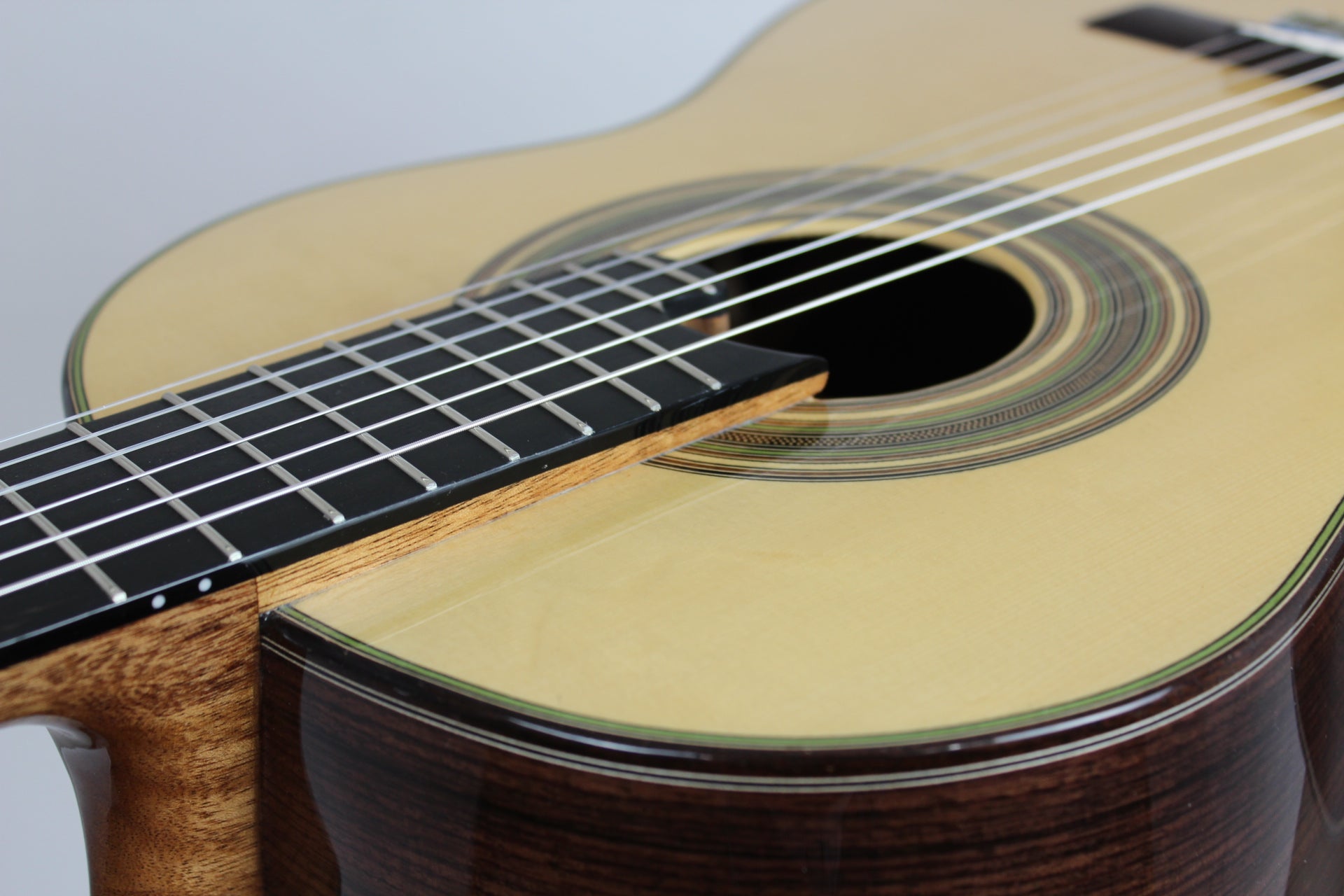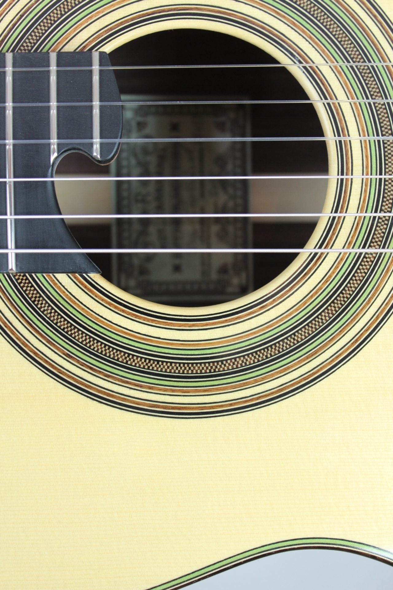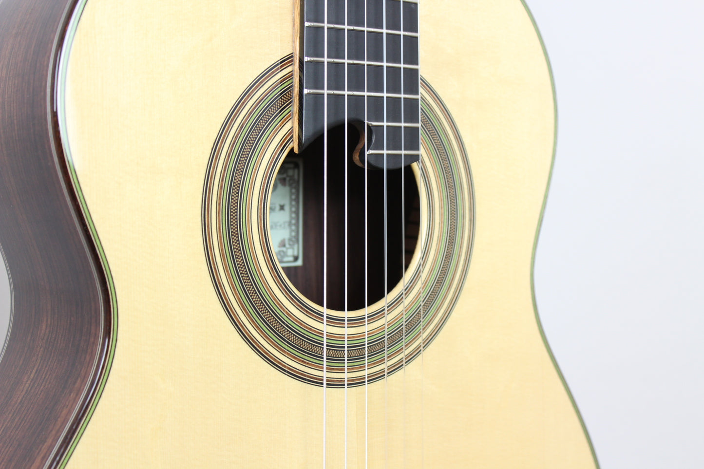 This beautiful guitar was developed in cooperation with Siccas Guitars. This guitar-type is a special edition which is only and exclusively available at Siccas Guitars. It has a variety of special features which can be found in this manner only on this guitar. The decorative elements like rosette and ornaments around the edge were specifically designed, and give the instrument a more traditional look. The bridge with its 12-hole-drilling fits perfectly into the overall picture of the guitar. Eye-catching are also the purflings made of ovangkol, which stress the precious character of the guitar. The raised fingerboard facilitates playing in the high registers and improves the sound in this area noticeable. Back and sides are made of Indian rosewood and the top is made of spruce. The tuning machines are by Alessi.