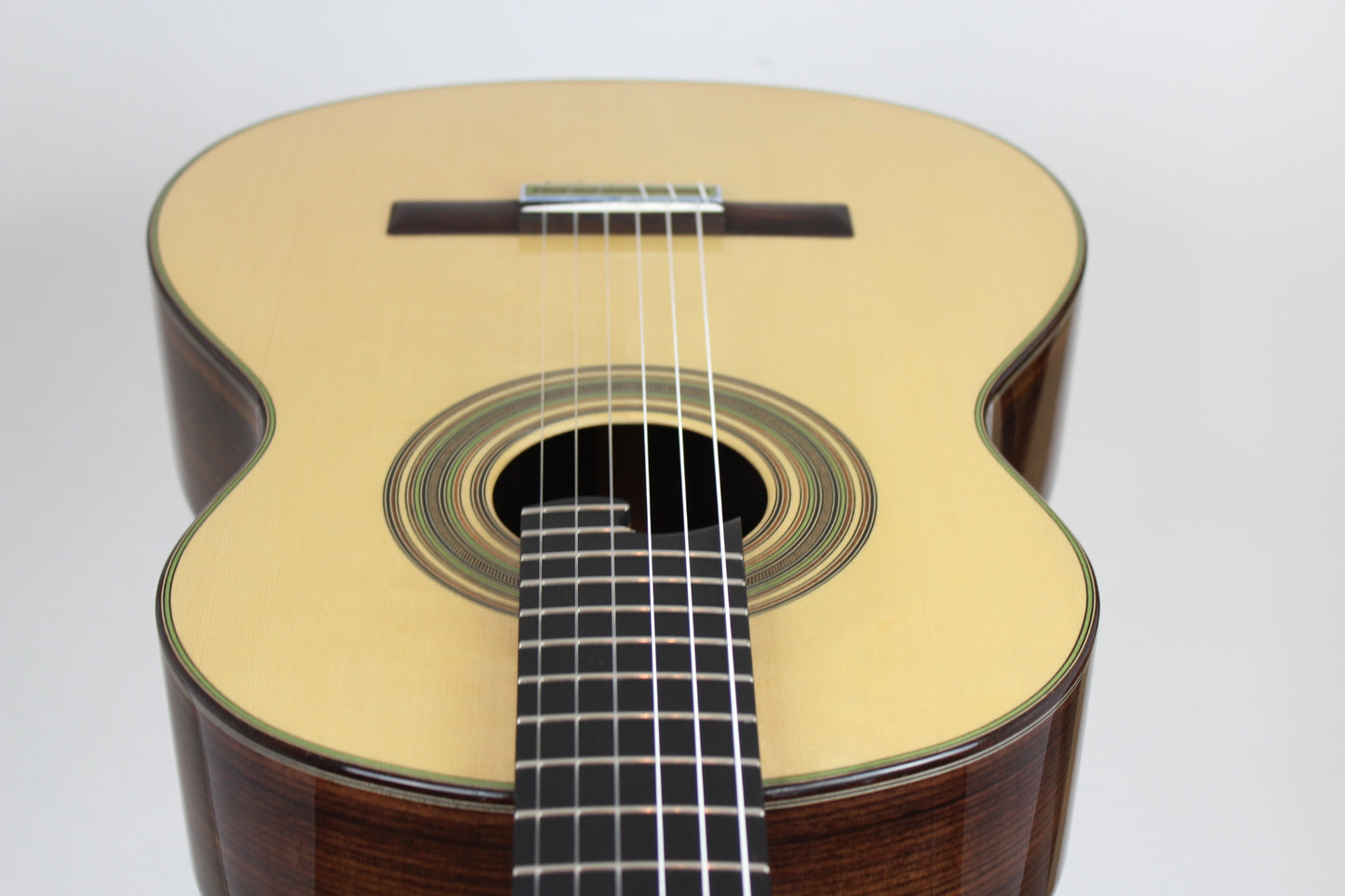 Die klassische Gitarre mit ihren weichen Nylonsaiten und ihrem charakteristischen Timbre ist zum Symbol der Kammermusik, der spanischen Tradition und des Konzertrepertoires geworden. Ihre moderne Form prägte Antonio de Torres im 19. Jahrhundert, indem er den Standard für Korpus, Fächerbeleistung und die 65-Zentimeter-Mensur setzte, die bis heute verwendet werden. Instrumente dieser Kategorie eröffnen eine reiche Palette von den feinen romantischen Miniaturen Tárregas bis zu den majestätischen Konzerten Rodrigos. Hier finden Sie Gitarren, die historische Kontinuität bewahren und zugleich zu neuen Interpretationen anregen.Alle Produkte der Kollektion ansehen -