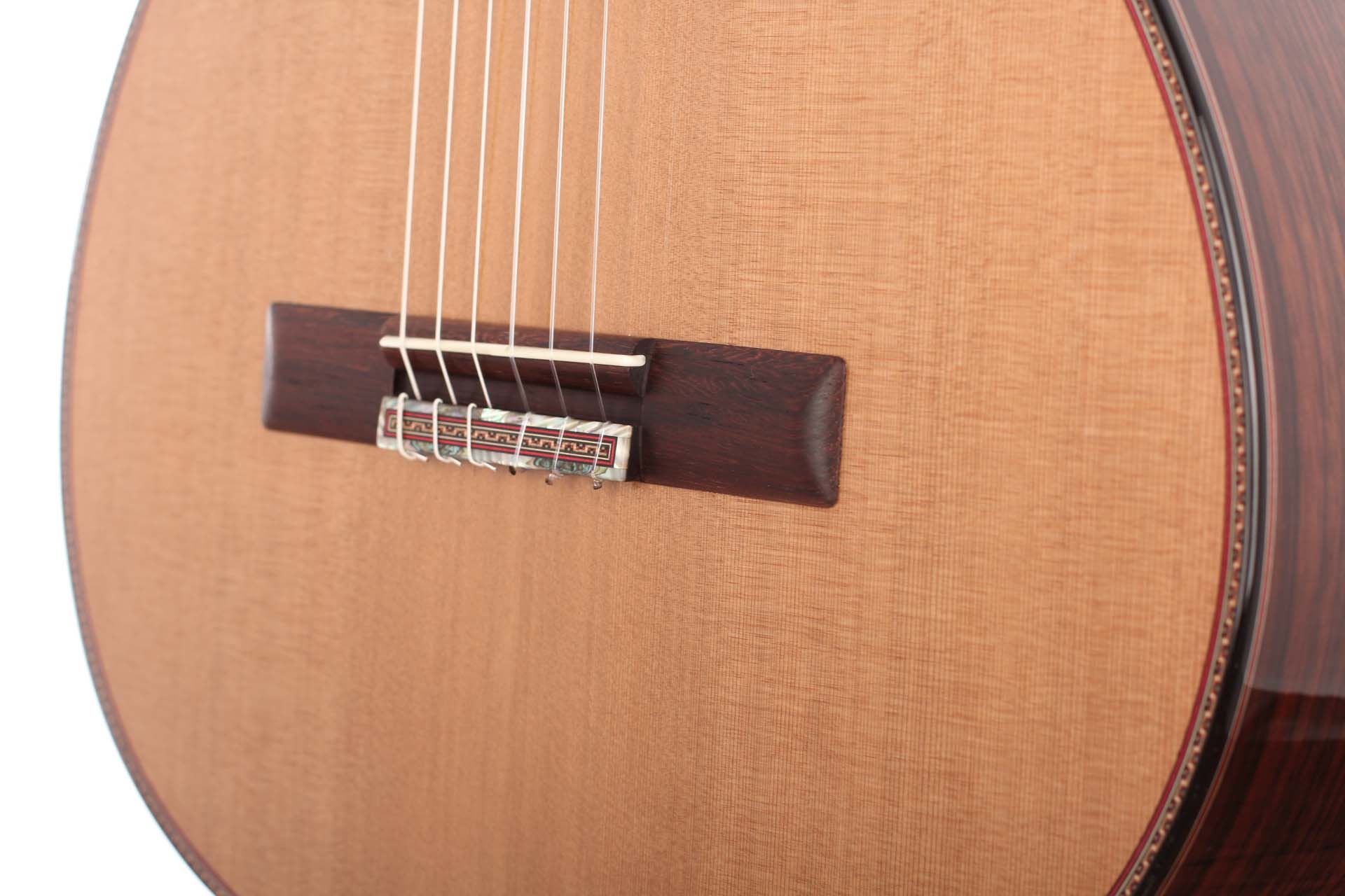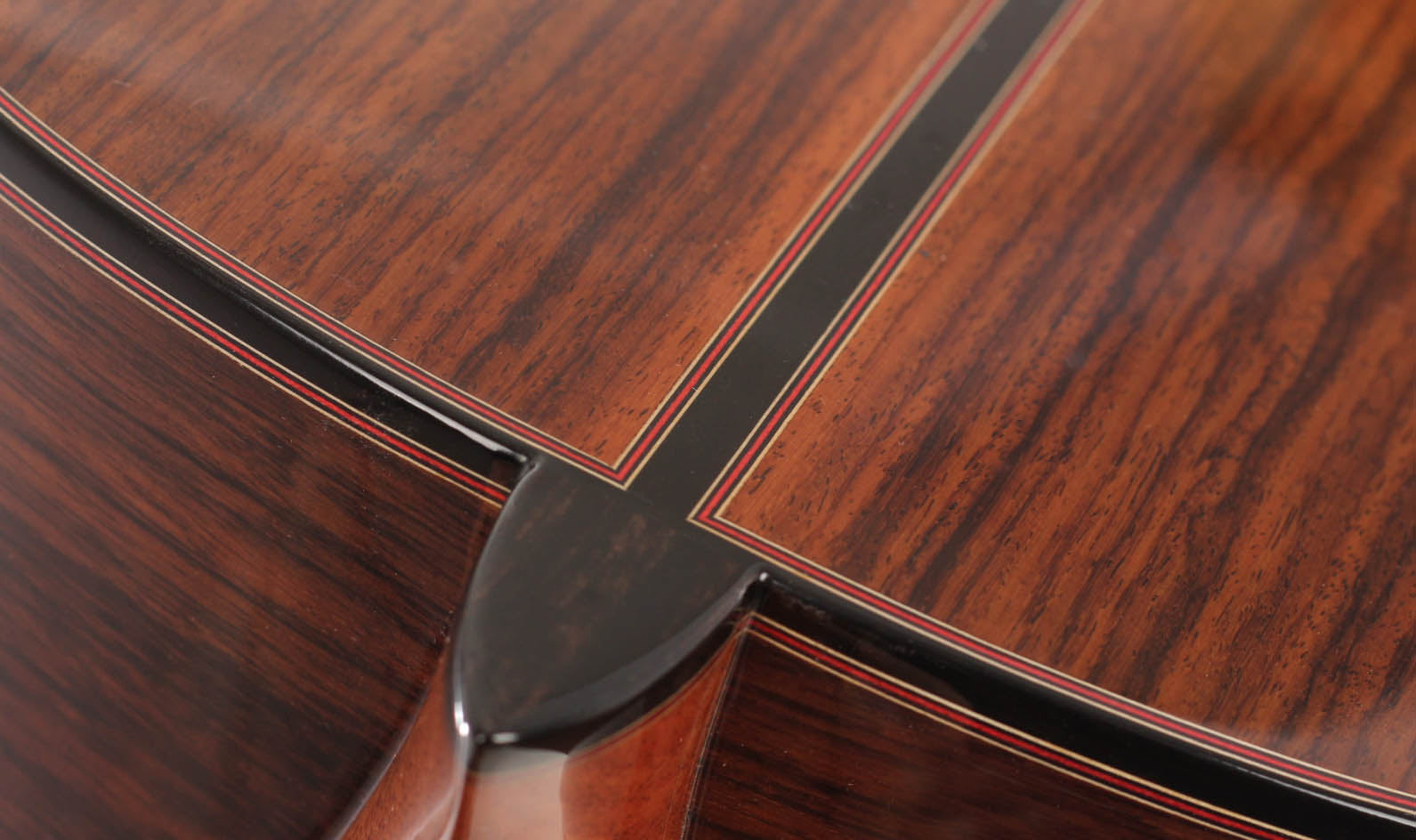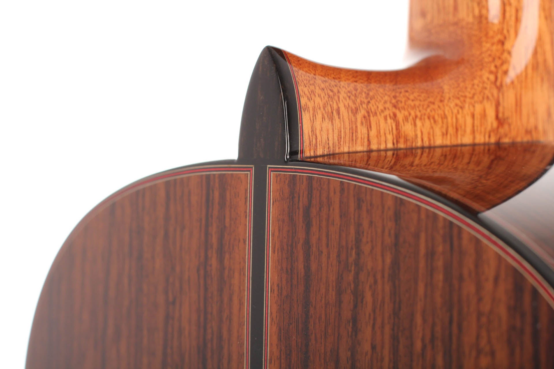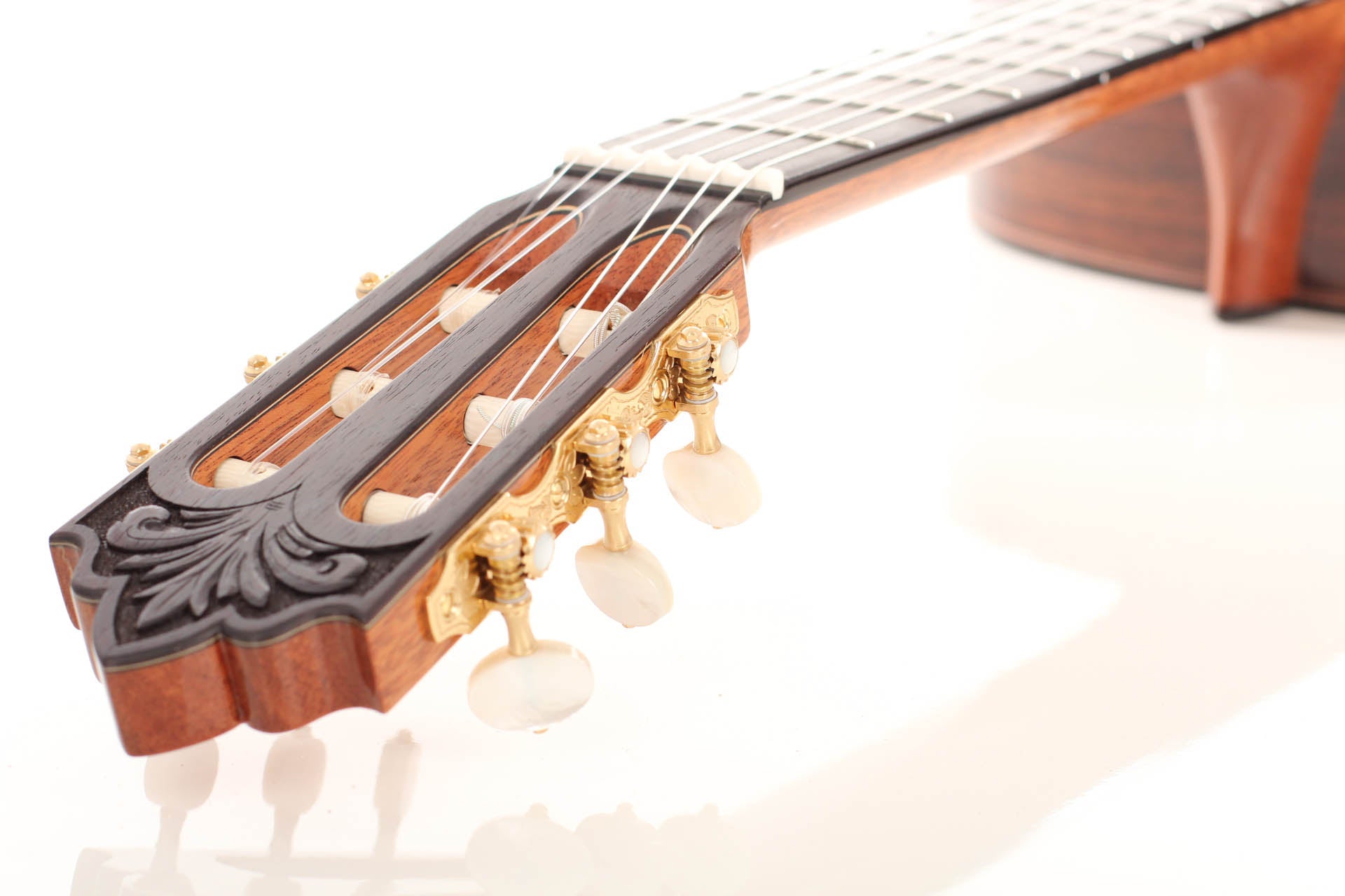 Diese wunderschöne Gitarre wurde in Zusammenarbeit mit “Siccas Guitars” entwickelt. Bei diesem Gitarrenmodell handelt es sich um eine Sonderserie, die nur bei “Siccas Guitars” erhältlich ist. Die Gitarre verfügt über eine Vielzahl von Besonderheiten, die so nur bei diesem Instrument zu finden sind. Dekorative Elemente wie Rosette und die geschnitzte Kopfplatte und das Randdekor wurden speziell von Roy Fankhänel entworfen und geben dem Instrument eine traditionelle und prächtige Optik. Perfekt in das Gesamtbild fügt sich der Steg mit 12-Loch-Bohrung und das Bevel ein. Das Innenleben (Klötzchen und Bodenleisten) besteht außer auf der Decke komplett aus Mahagoni. Boden und Zargen bestehen aus karibischem Palisander und die Decke aus feinster Fichte. Die Deckenbeleistung besteht aus Zeder. Das erhöhte Griffbrett erleichtert das Spiel in den hohen Lagen und verbessert den Klang in diesem Bereich spürbar. Die Mechaniken sind von Rubner.