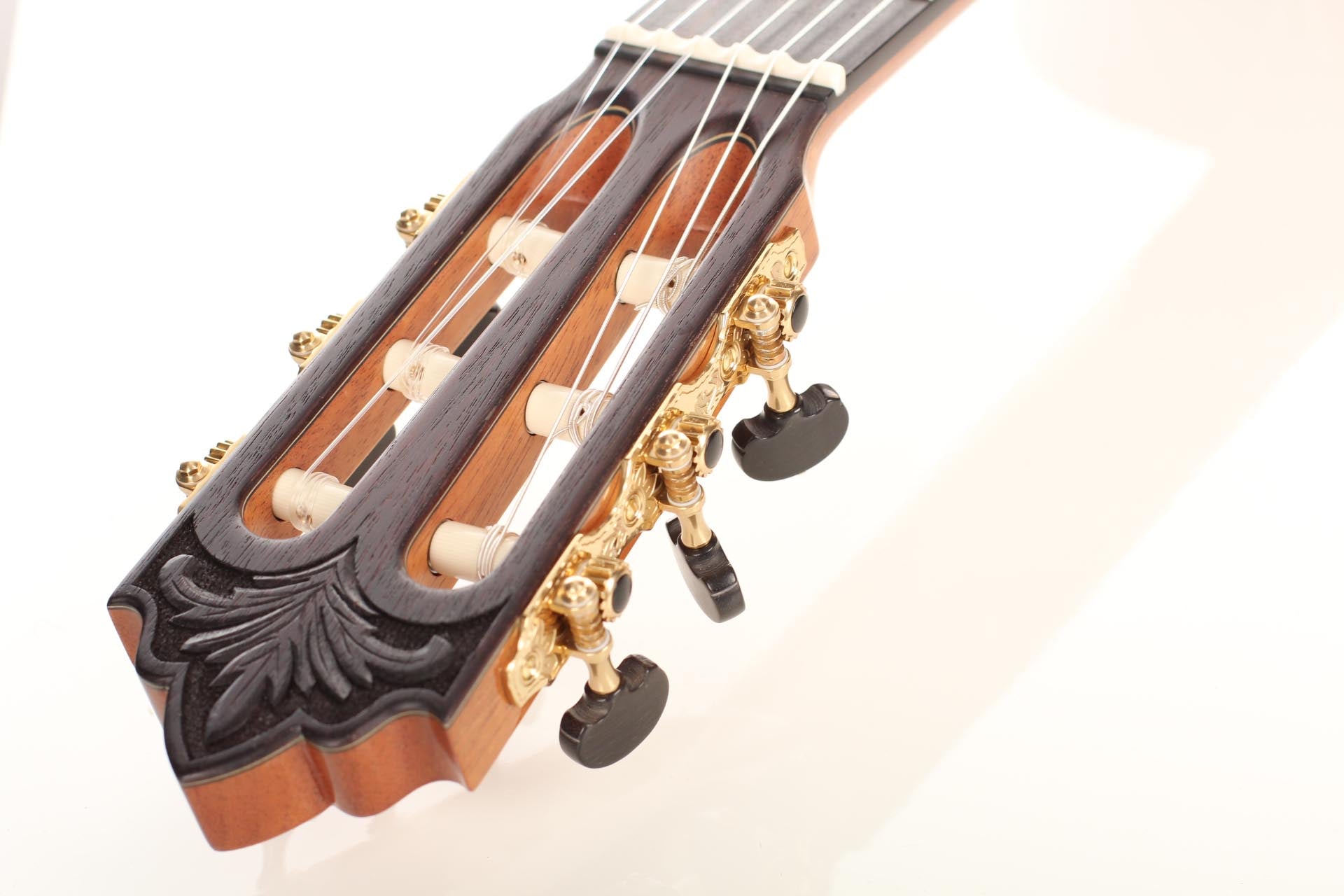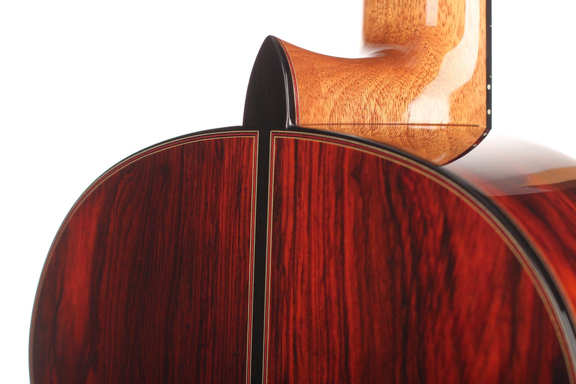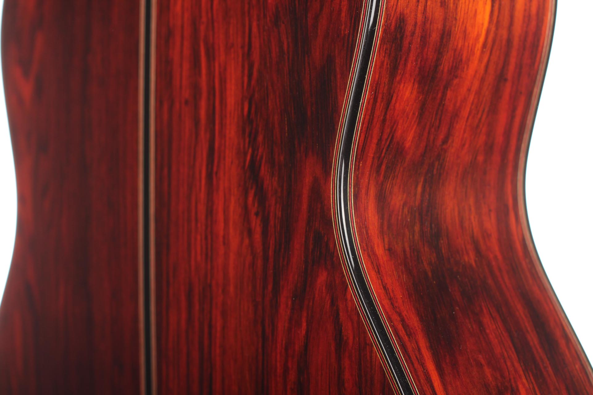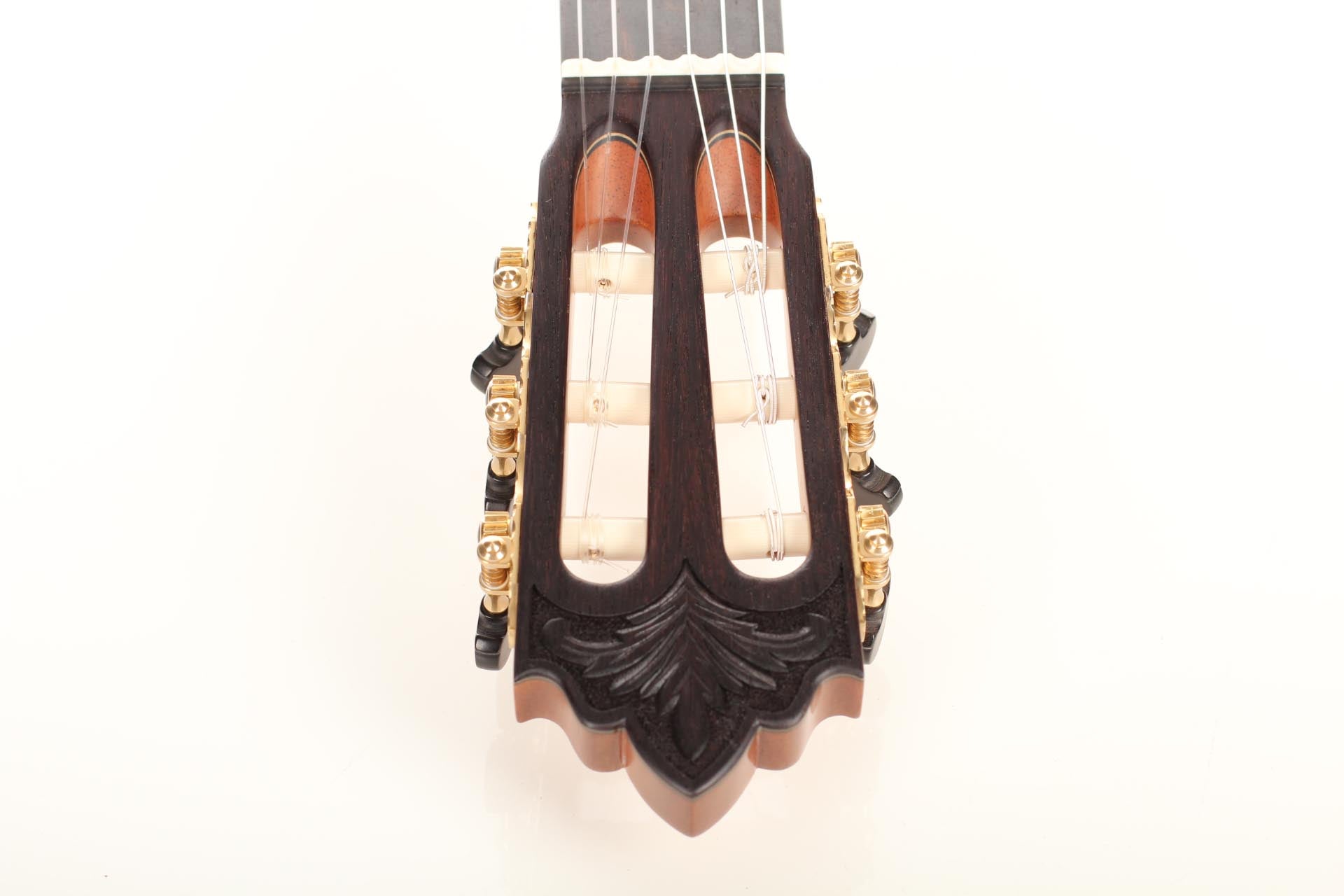 Diese wunderschöne Gitarre wurde in Zusammenarbeit mit “Siccas Guitars” entwickelt. Bei diesem Gitarrenmodell handelt es sich um eine Sonderserie, die nur bei “Siccas Guitars” erhältlich ist. Die Gitarre verfügt über eine Vielzahl von Besonderheiten, die so nur bei diesem Instrument zu finden sind. Dekorative Elemente wie Rosette und die geschnitzte Kopfplatte und das Randdekor wurden speziell von Roy Fankhänel entworfen und geben dem Instrument eine traditionelle und prächtige Optik. Perfekt in das Gesamtbild fügt sich der Steg mit 12-Loch-Bohrung und das Bevel ein. Das Innenleben (Klötzchen und Bodenleisten) besteht außer auf der Decke komplett aus Mahagoni. Boden und Zargen bestehen aus Cocobolo Palisander und die Decke aus feinster Zeder. Die Deckenbeleistung besteht aus Zeder. Das erhöhte Griffbrett erleichtert das Spiel in den hohen Lagen und verbessert den Klang in diesem Bereich spürbar. Die Mechaniken sind von Rubner. Ein Hiscox Pro II Koffer ist inklusive.
