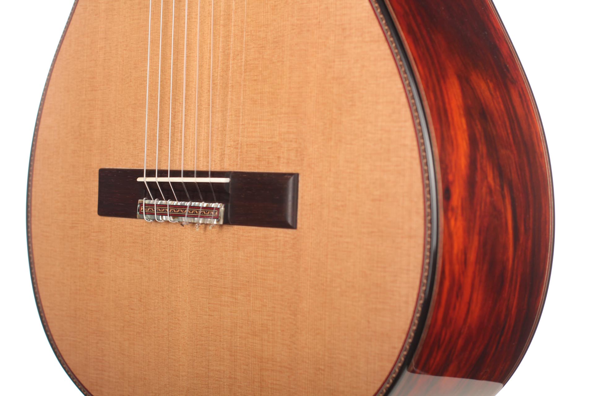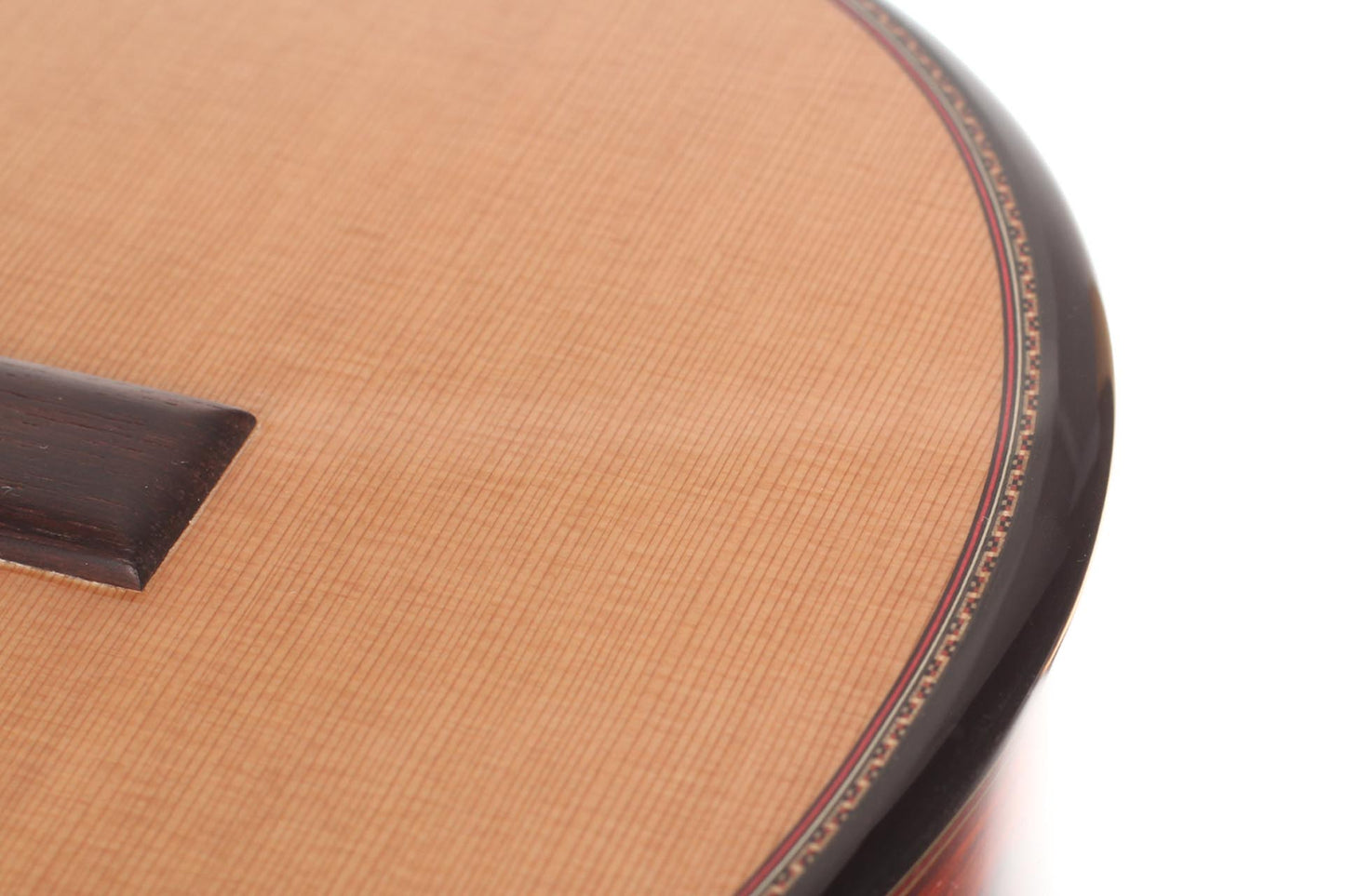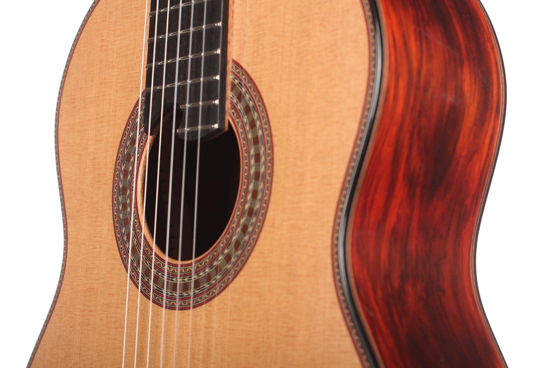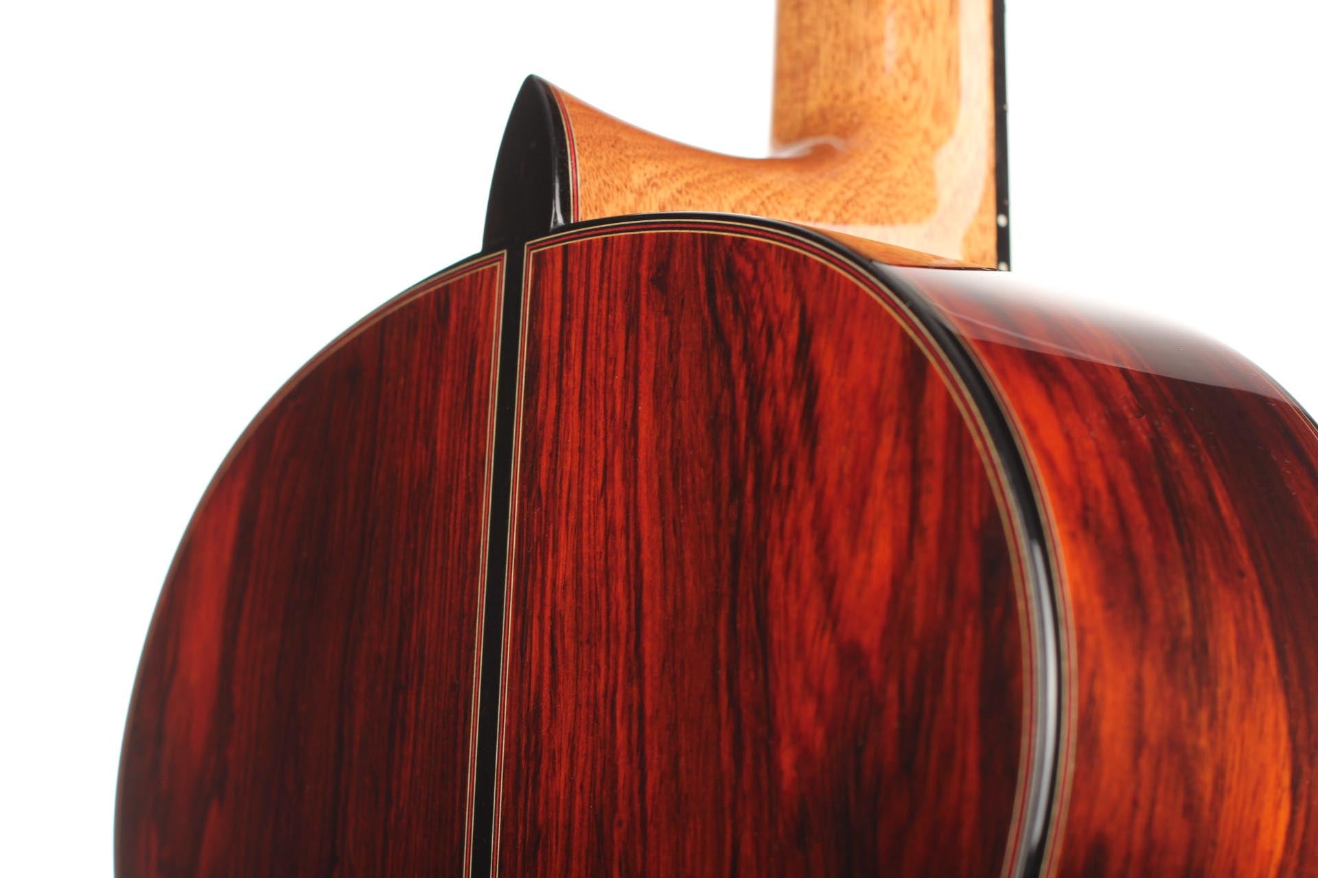 Diese wunderschöne Gitarre wurde in Zusammenarbeit mit “Siccas Guitars” entwickelt. Bei diesem Gitarrenmodell handelt es sich um eine Sonderserie, die nur bei “Siccas Guitars” erhältlich ist. Die Gitarre verfügt über eine Vielzahl von Besonderheiten, die so nur bei diesem Instrument zu finden sind. Dekorative Elemente wie Rosette und die geschnitzte Kopfplatte und das Randdekor wurden speziell von Roy Fankhänel entworfen und geben dem Instrument eine traditionelle und prächtige Optik. Perfekt in das Gesamtbild fügt sich der Steg mit 12-Loch-Bohrung und das Bevel ein. Das Innenleben (Klötzchen und Bodenleisten) besteht außer auf der Decke komplett aus Mahagoni. Boden und Zargen bestehen aus Cocobolo Palisander und die Decke aus feinster Zeder. Die Deckenbeleistung besteht aus Zeder. Das erhöhte Griffbrett erleichtert das Spiel in den hohen Lagen und verbessert den Klang in diesem Bereich spürbar. Die Mechaniken sind von Rubner. Ein Hiscox Pro II Koffer ist inklusive.