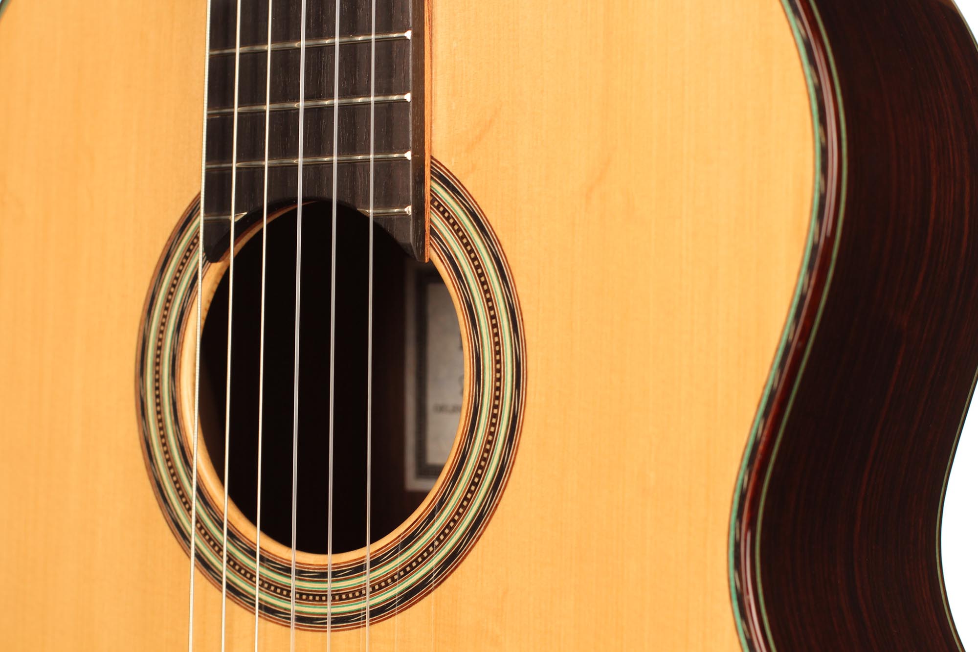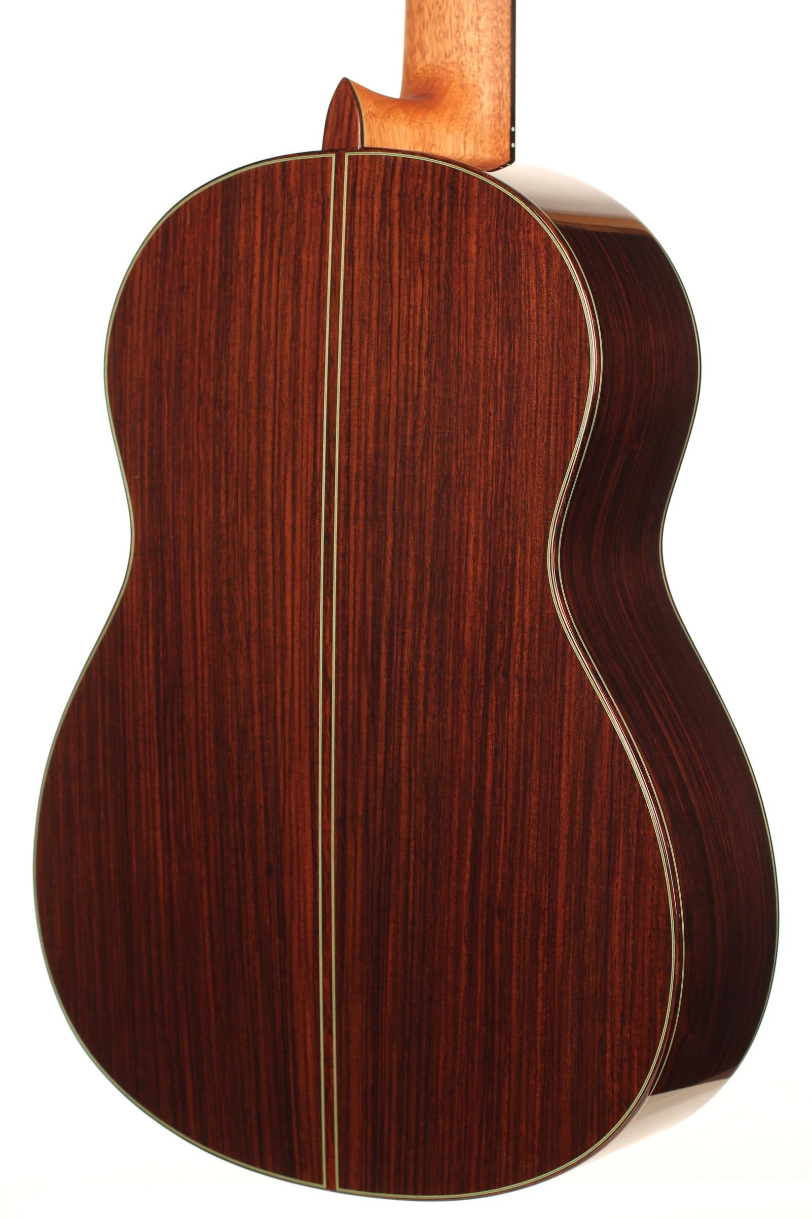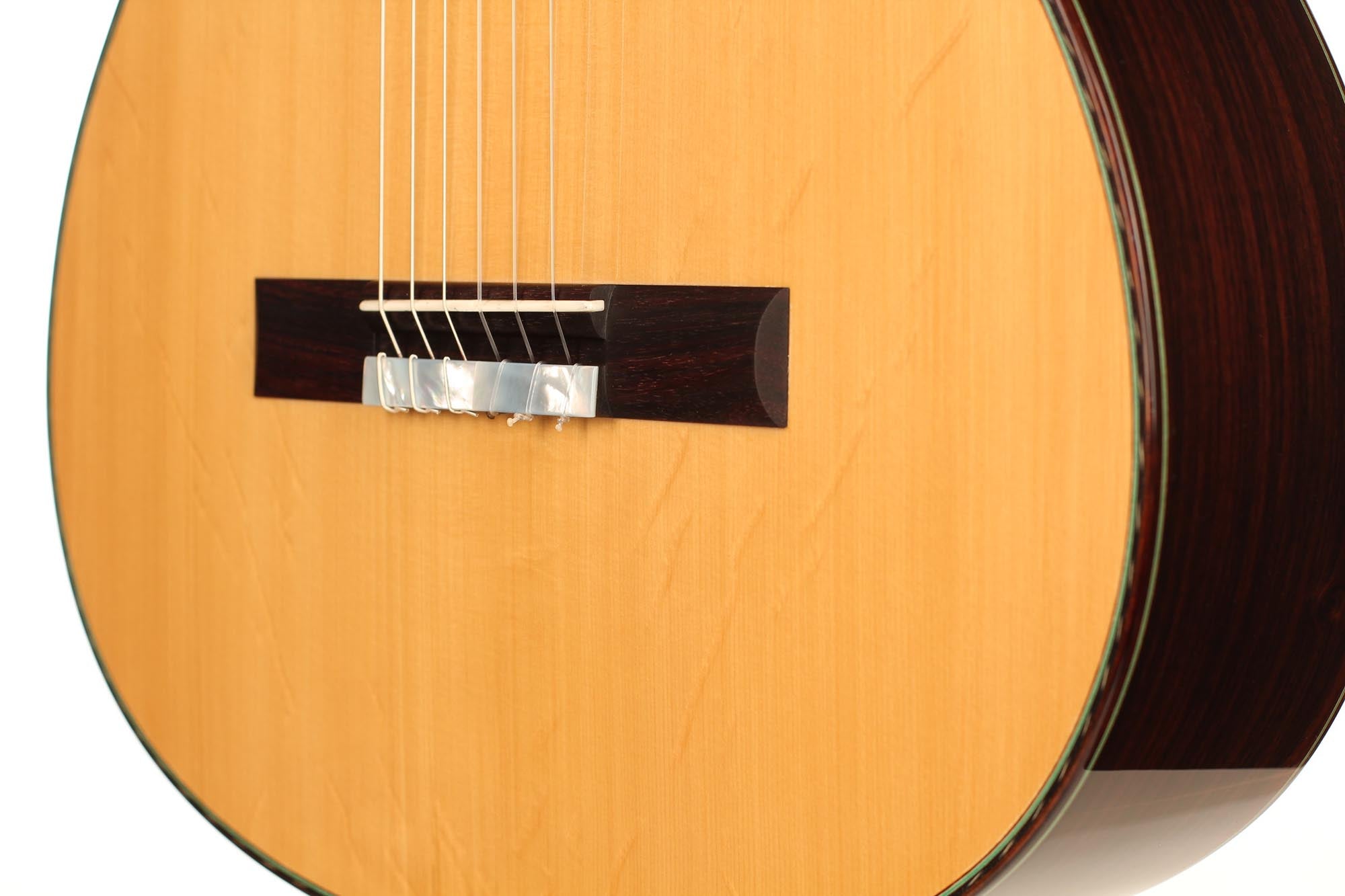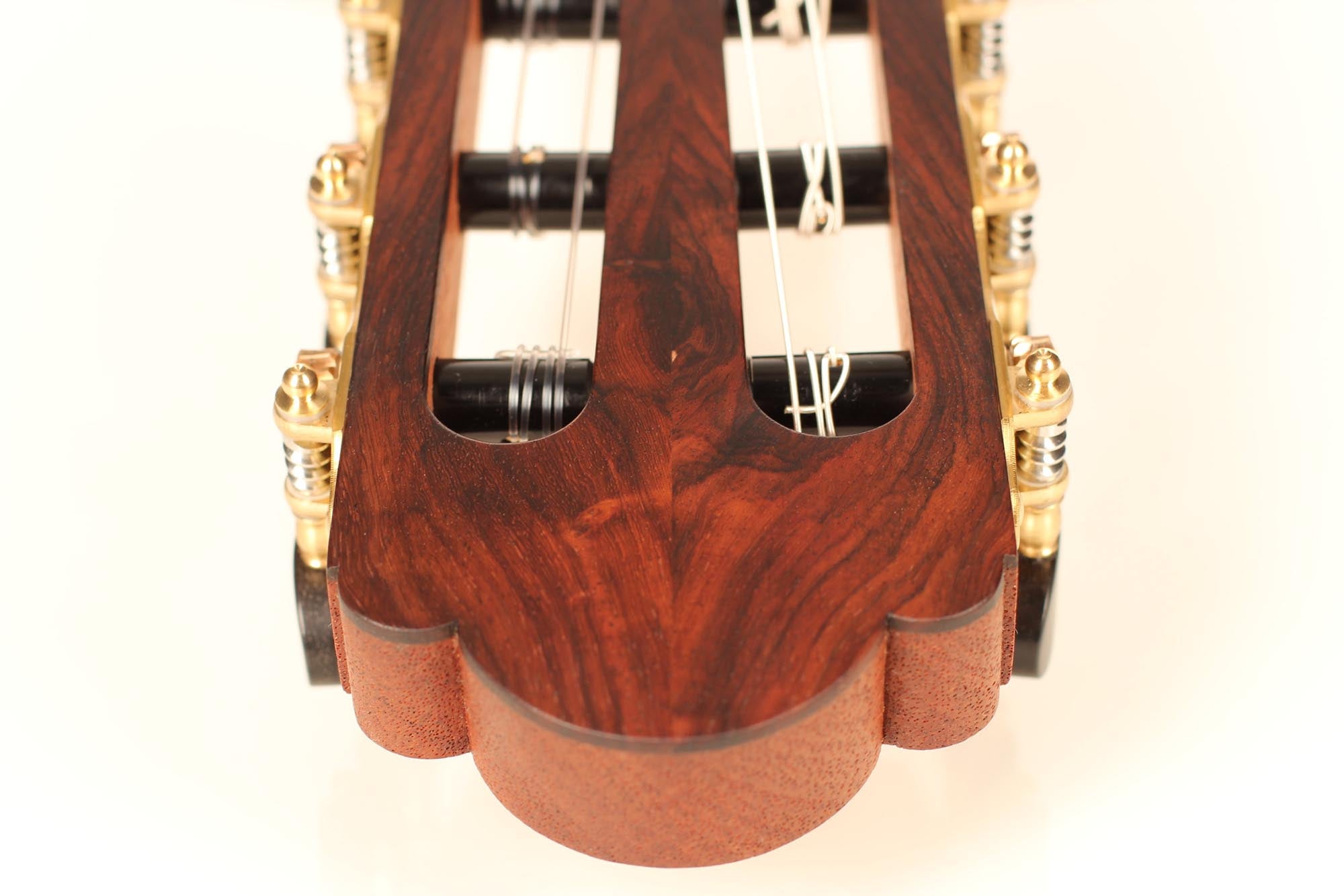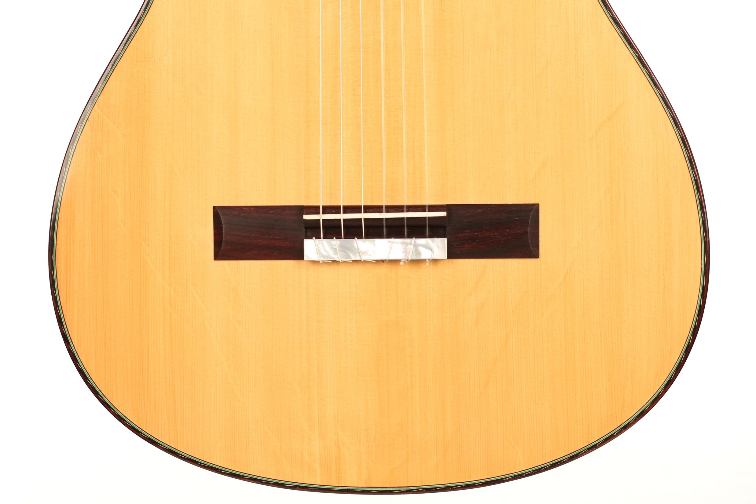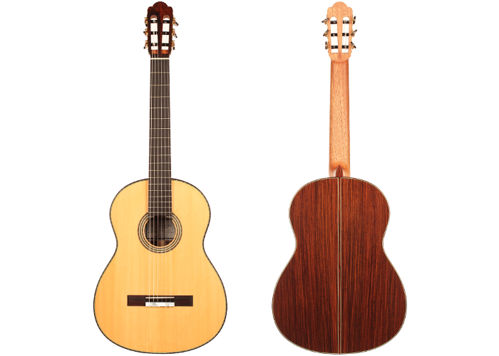 This guitar was inspired by the work of Antonio de Torres and follows the idea of a modern interpretation of the traditional Spanish guitar. It is therefore an instrument with a fine colourful tone, very sensible to the stroke and expressing and charming timbre. Nevertheless, some details remind us that this guitar is a contemporary concert instrument that can fill concert halls and some elements as the elevated fingerboard and the waxed neck were built in order to optimise the playability. A first quality bear-claw spruce top was chosen for this instrument and it is astonishing how this new guitar already sounds amazingly clear and brilliant.