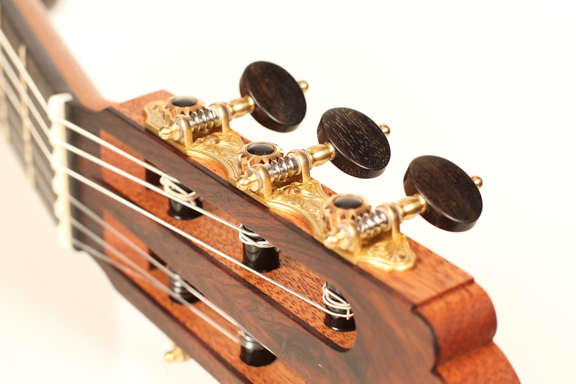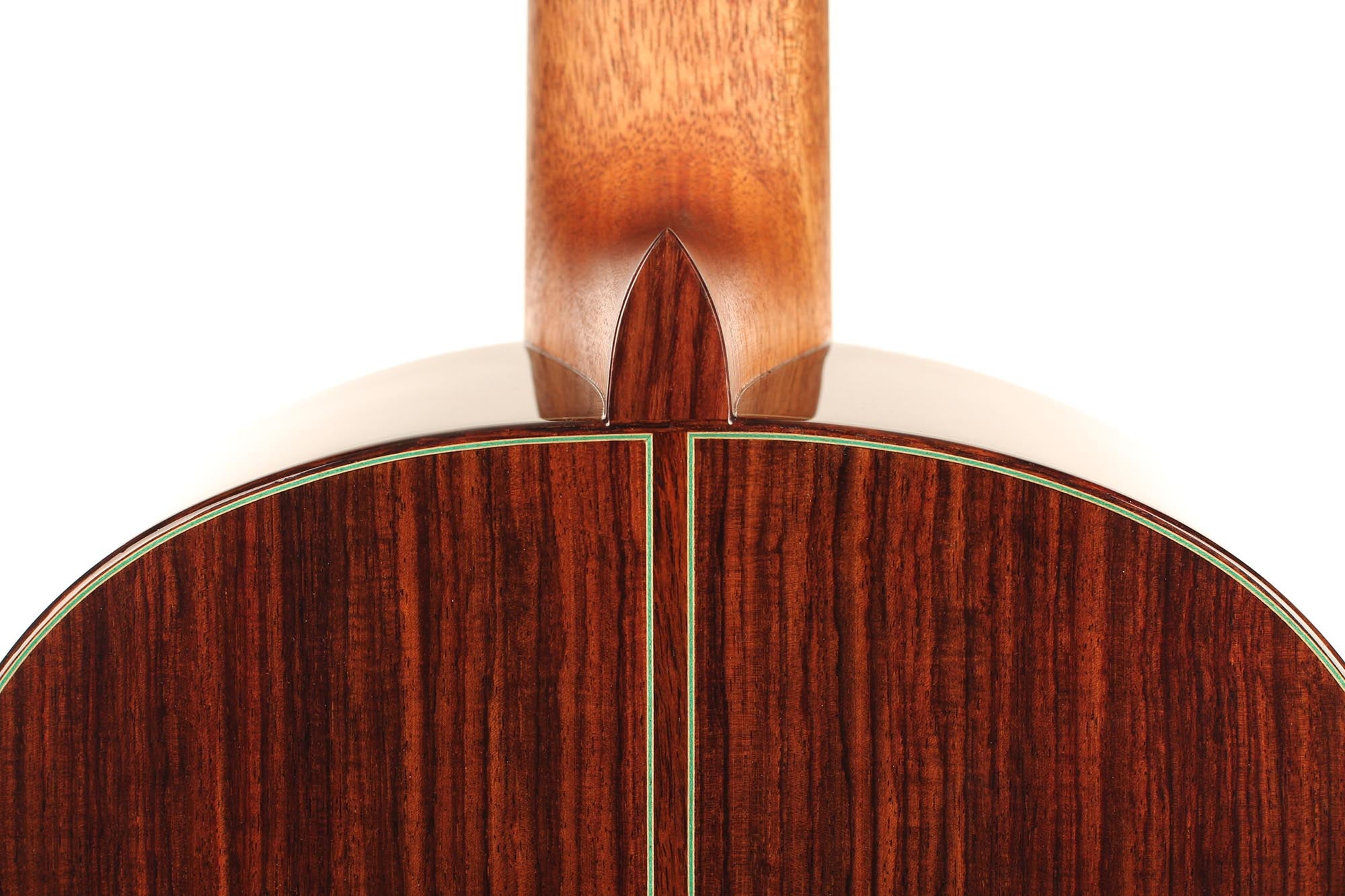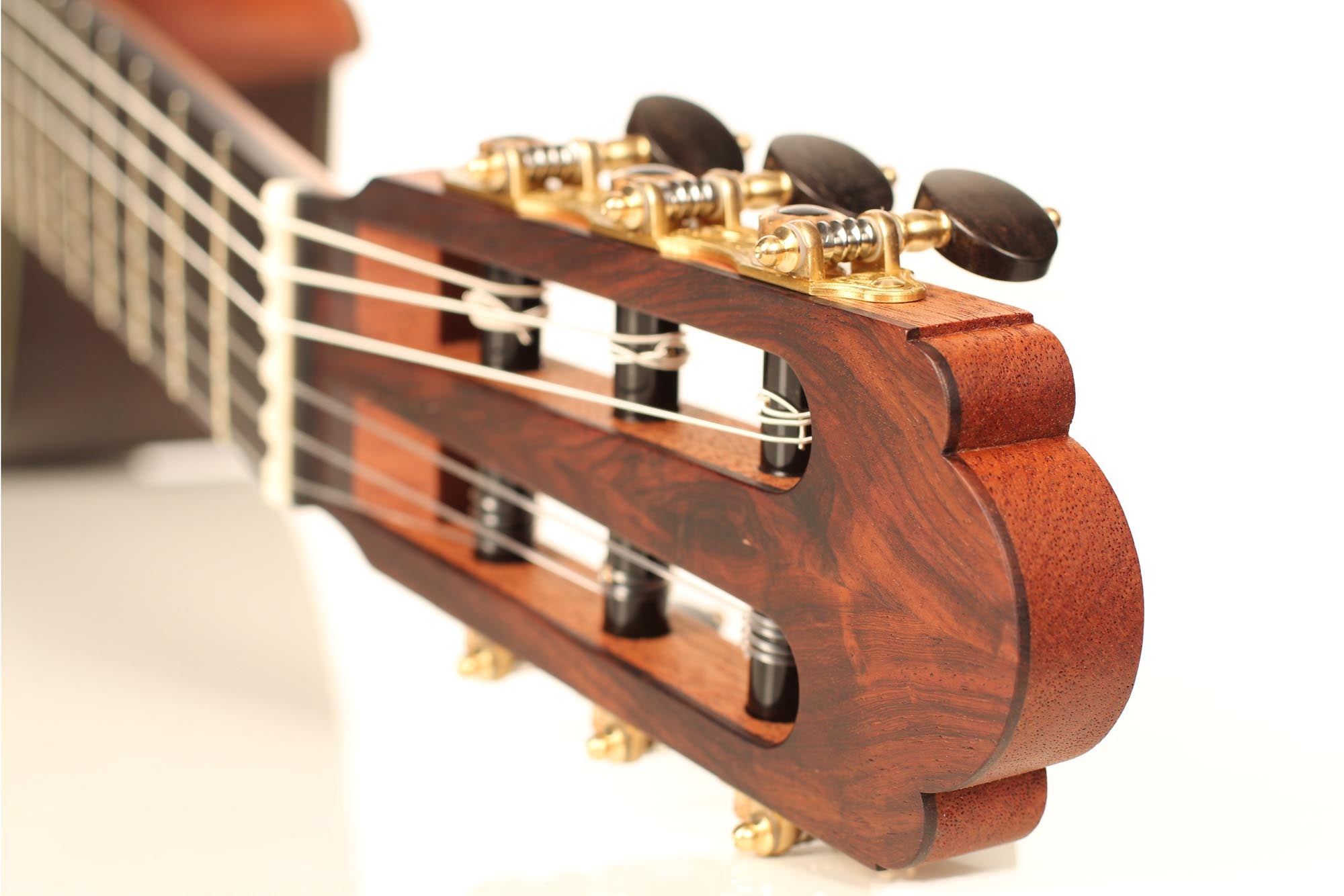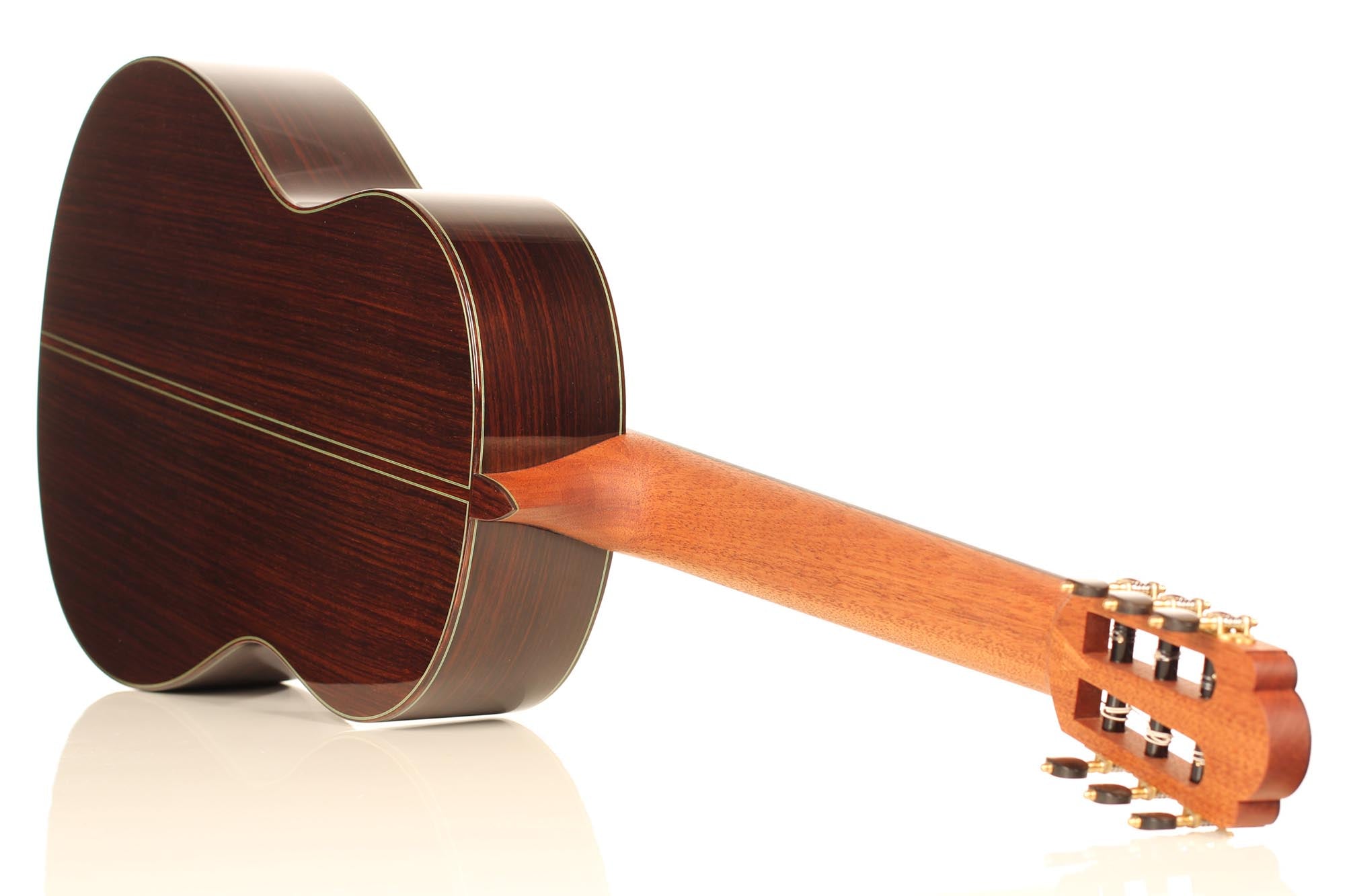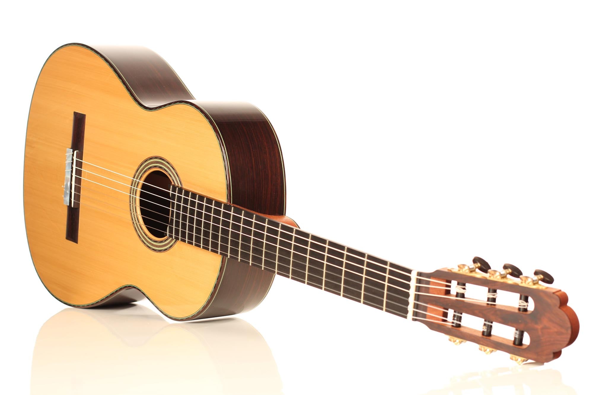 This guitar was inspired by the work of Antonio de Torres and follows the idea of a modern interpretation of the traditional Spanish guitar. It is therefore an instrument with a fine colourful tone, very sensible to the stroke and expressing and charming timbre. Nevertheless, some details remind us that this guitar is a contemporary concert instrument that can fill concert halls and some elements as the elevated fingerboard and the waxed neck were built in order to optimise the playability. A first quality bear-claw spruce top was chosen for this instrument and it is astonishing how this new guitar already sounds amazingly clear and brilliant.