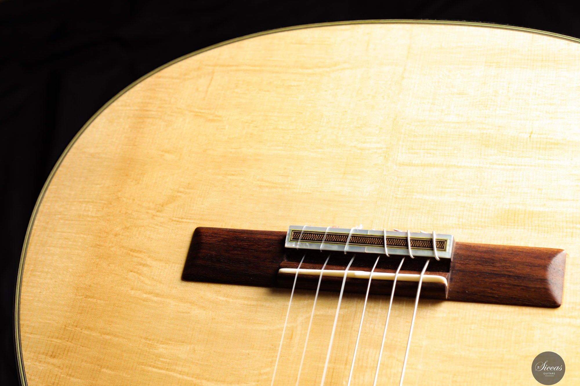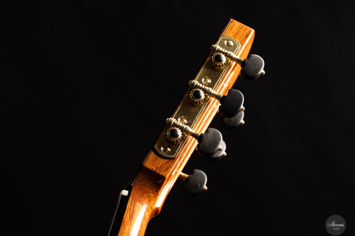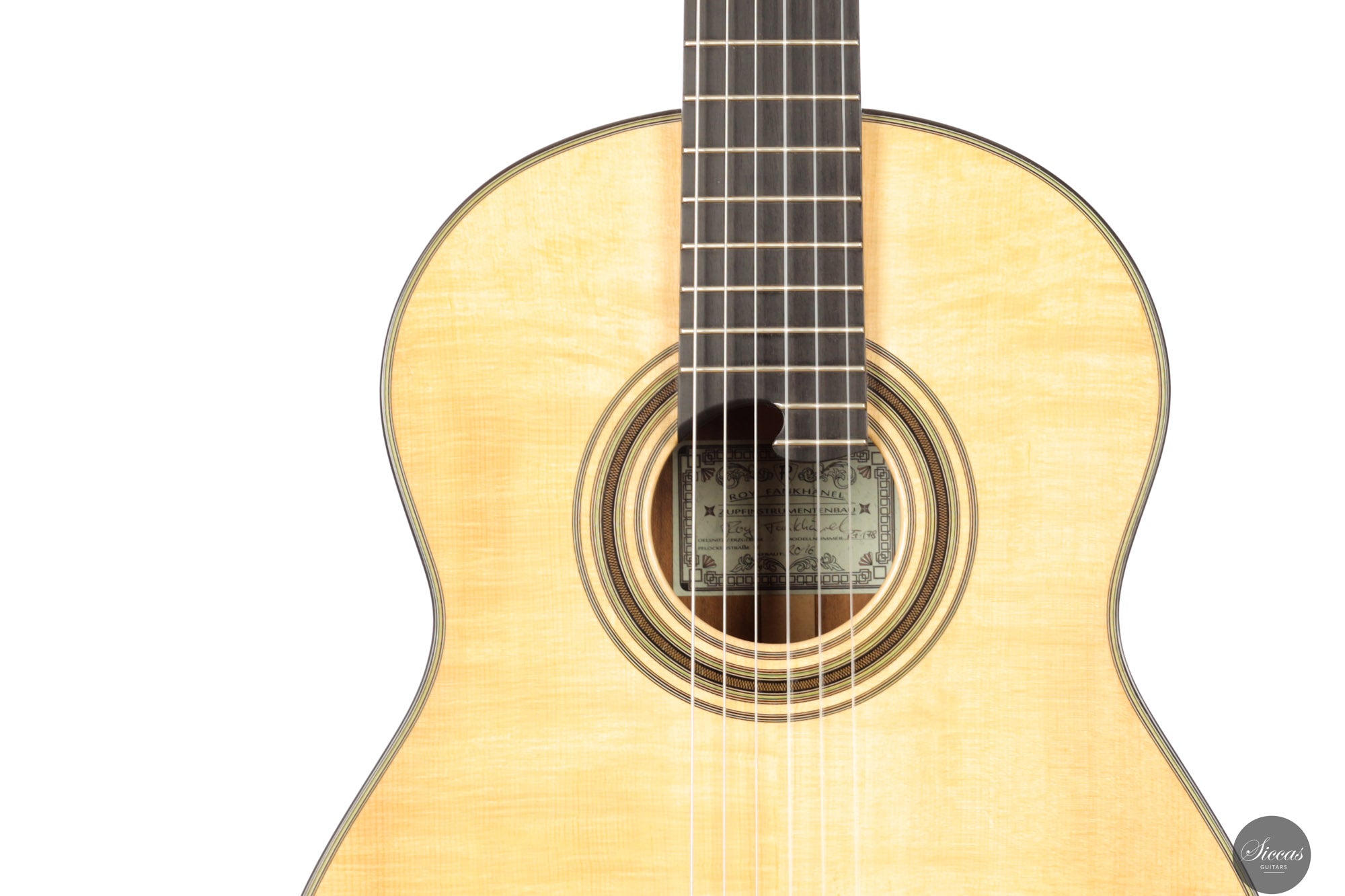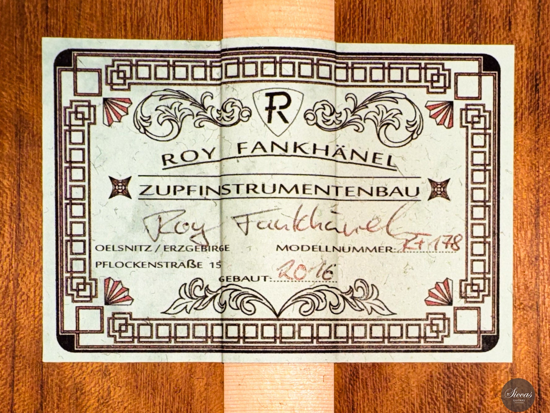 Roy Fankhänel builds guitars in Oelsnitz, Germany, drawing from the traditions of German lutherie while refining his own unmistakable style. His instruments are celebrated for their precise craftsmanship and tonal power. Distinctive construction elements such as the traditional V-joint, elevated fingerboard with a slight radius, and meticulous decorative work reflect his commitment to both function and aesthetics. Fankhänel’s guitars are known for their ease of playability, visual refinement, and their bold, lyrical voice that carries well in concert settings.
