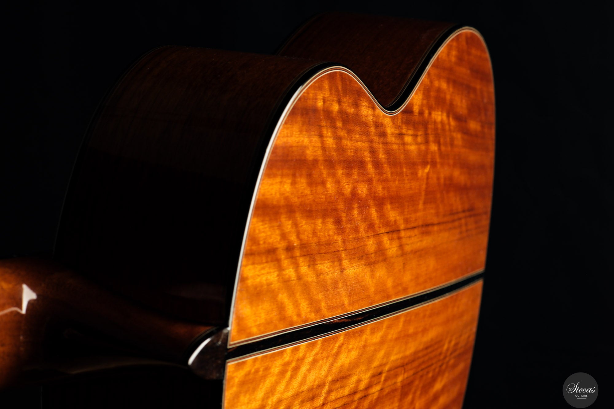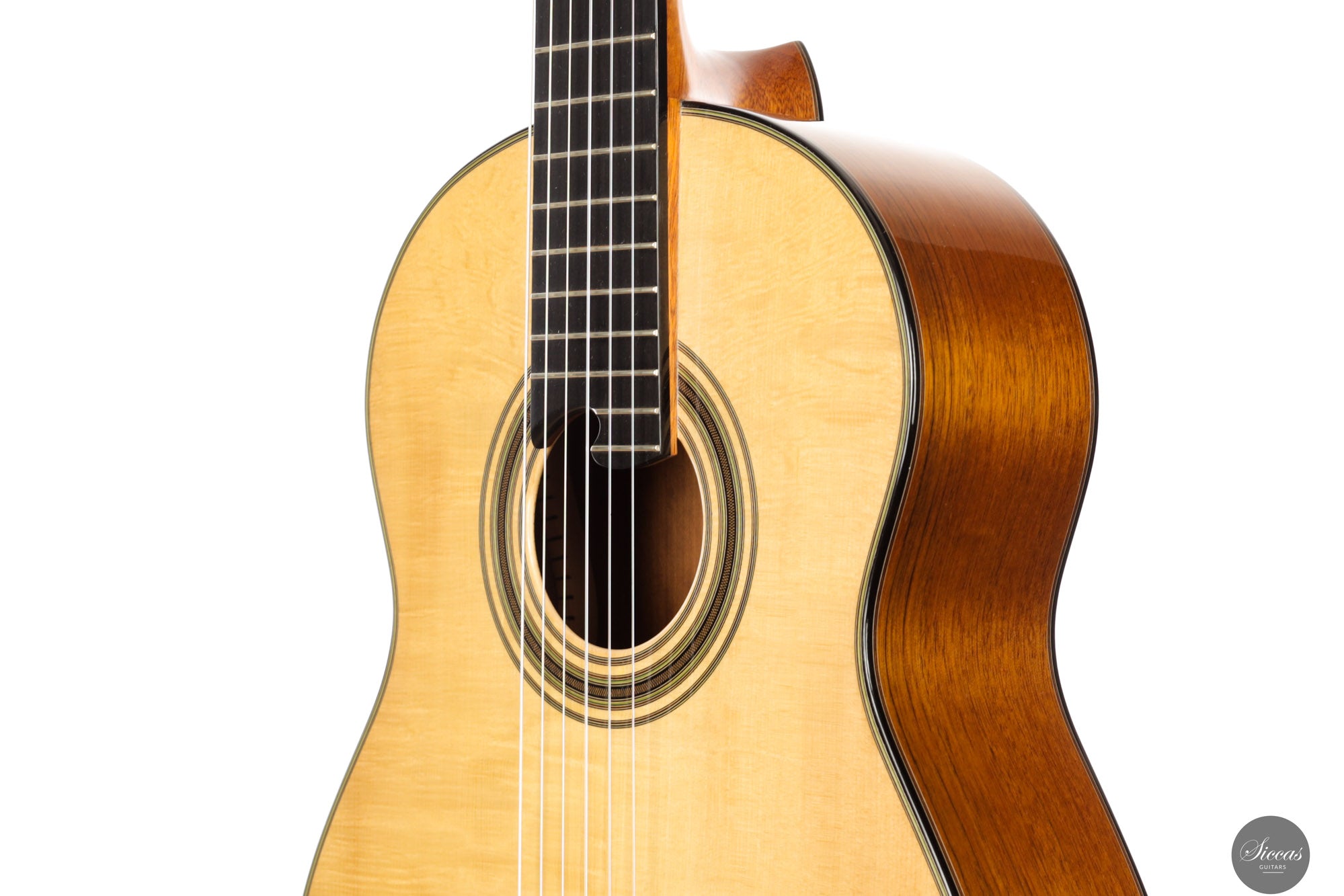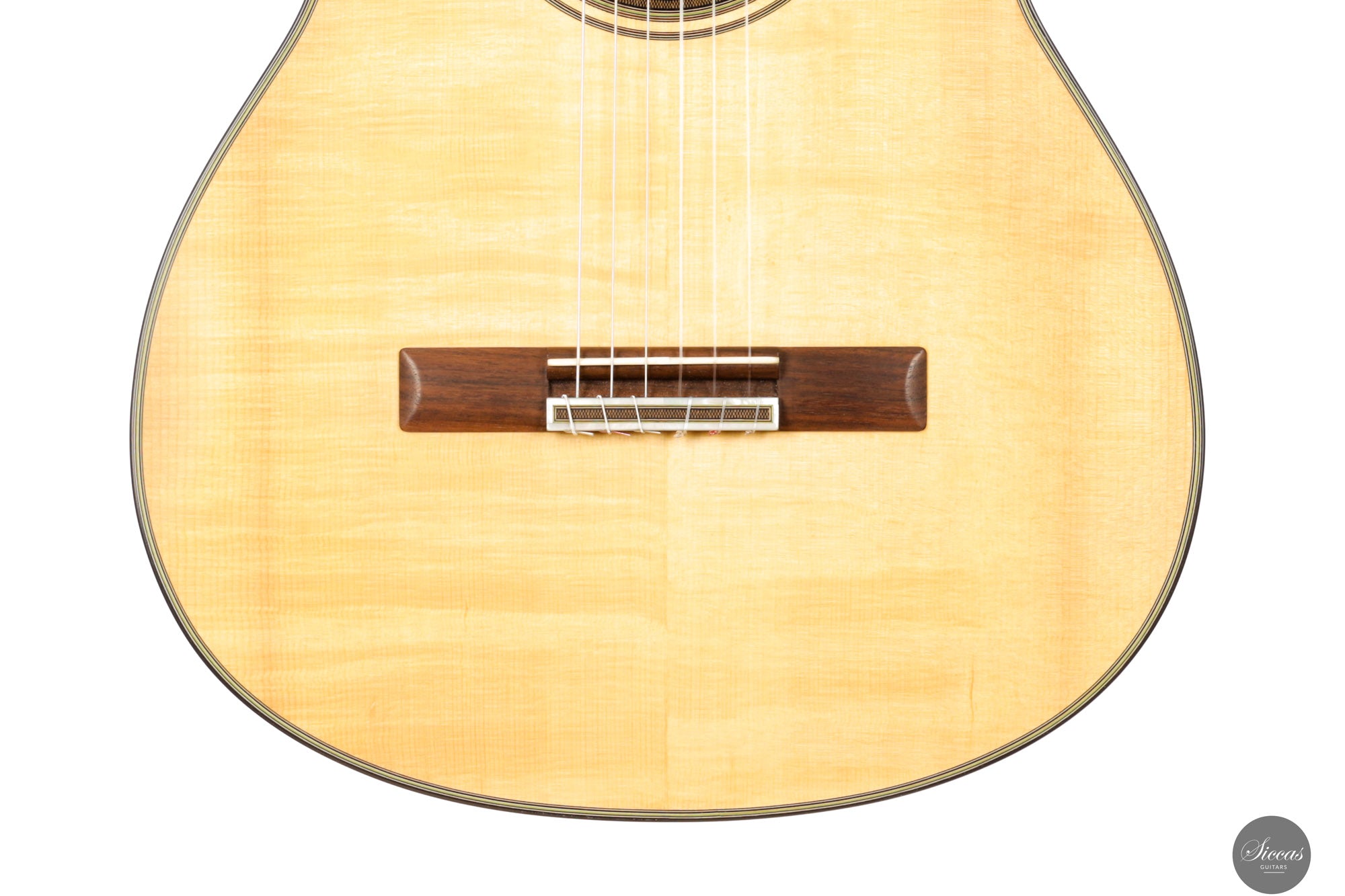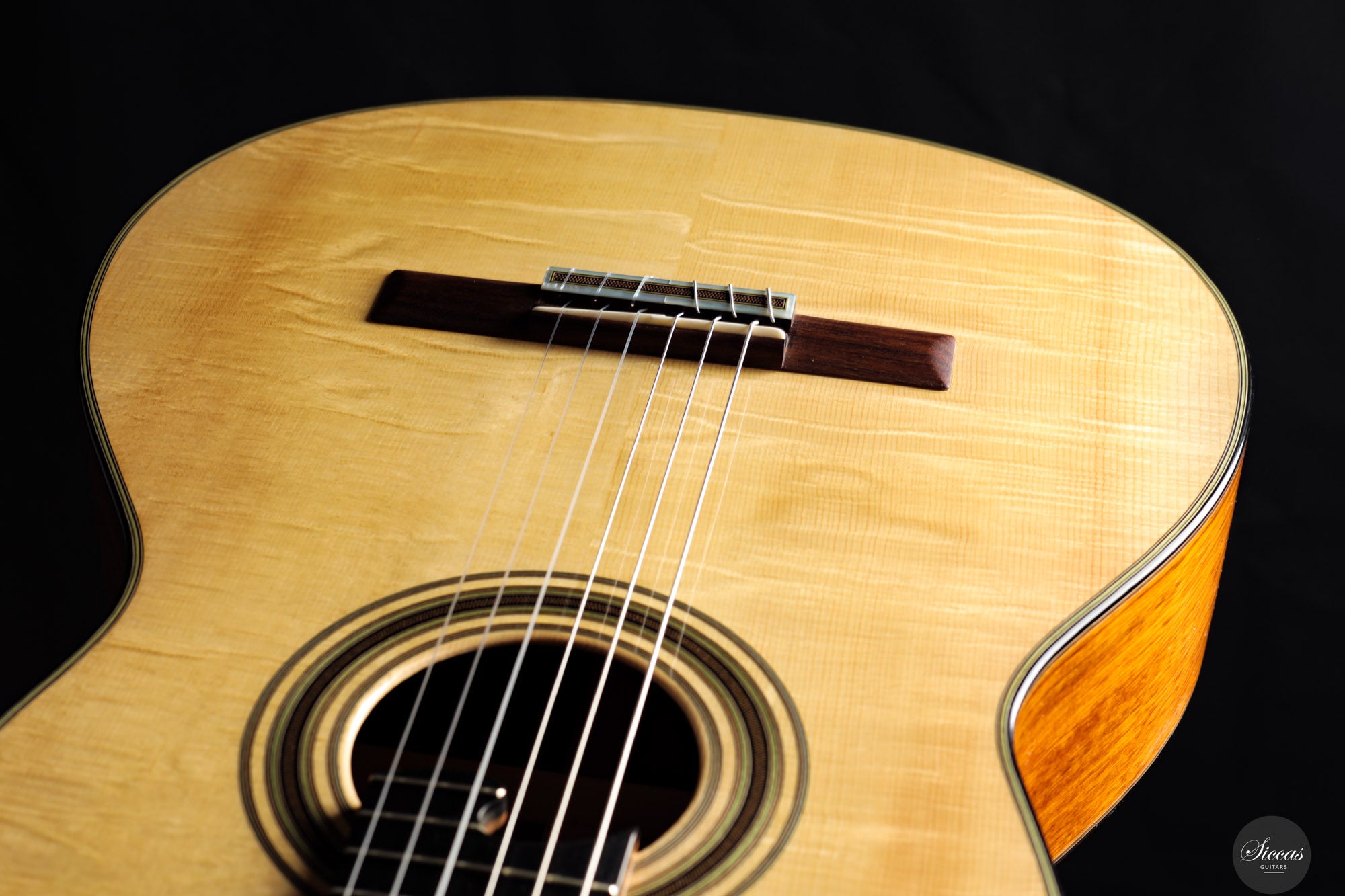 Roy Fankhänel builds guitars in Oelsnitz, Germany, drawing from the traditions of German lutherie while refining his own unmistakable style. His instruments are celebrated for their precise craftsmanship and tonal power. Distinctive construction elements such as the traditional V-joint, elevated fingerboard with a slight radius, and meticulous decorative work reflect his commitment to both function and aesthetics. Fankhänel’s guitars are known for their ease of playability, visual refinement, and their bold, lyrical voice that carries well in concert settings.