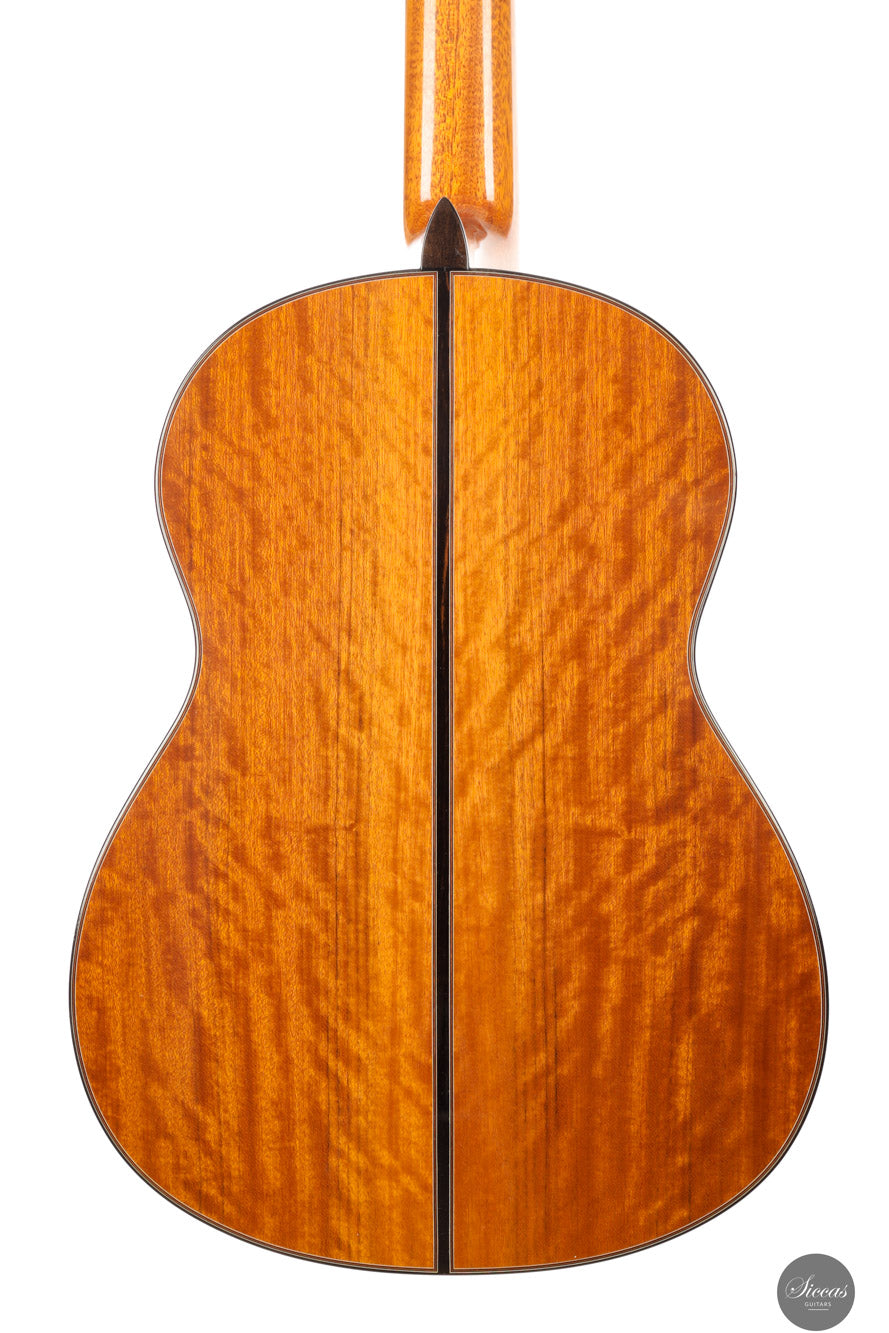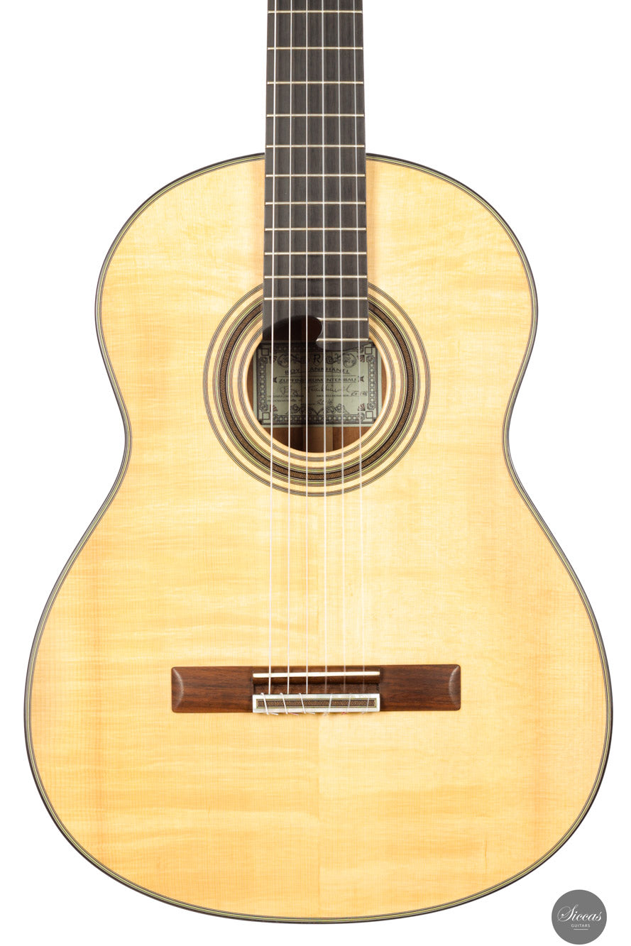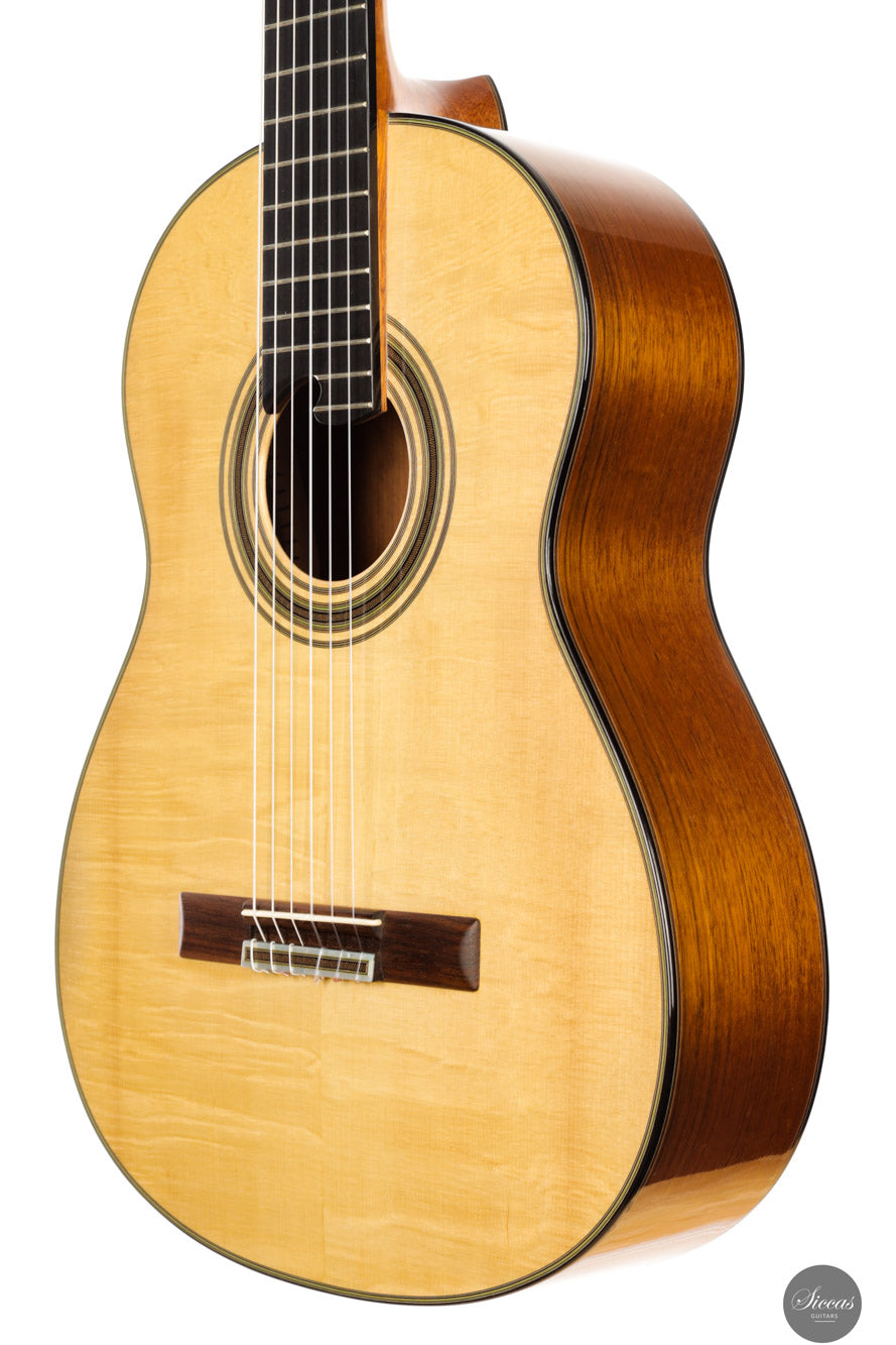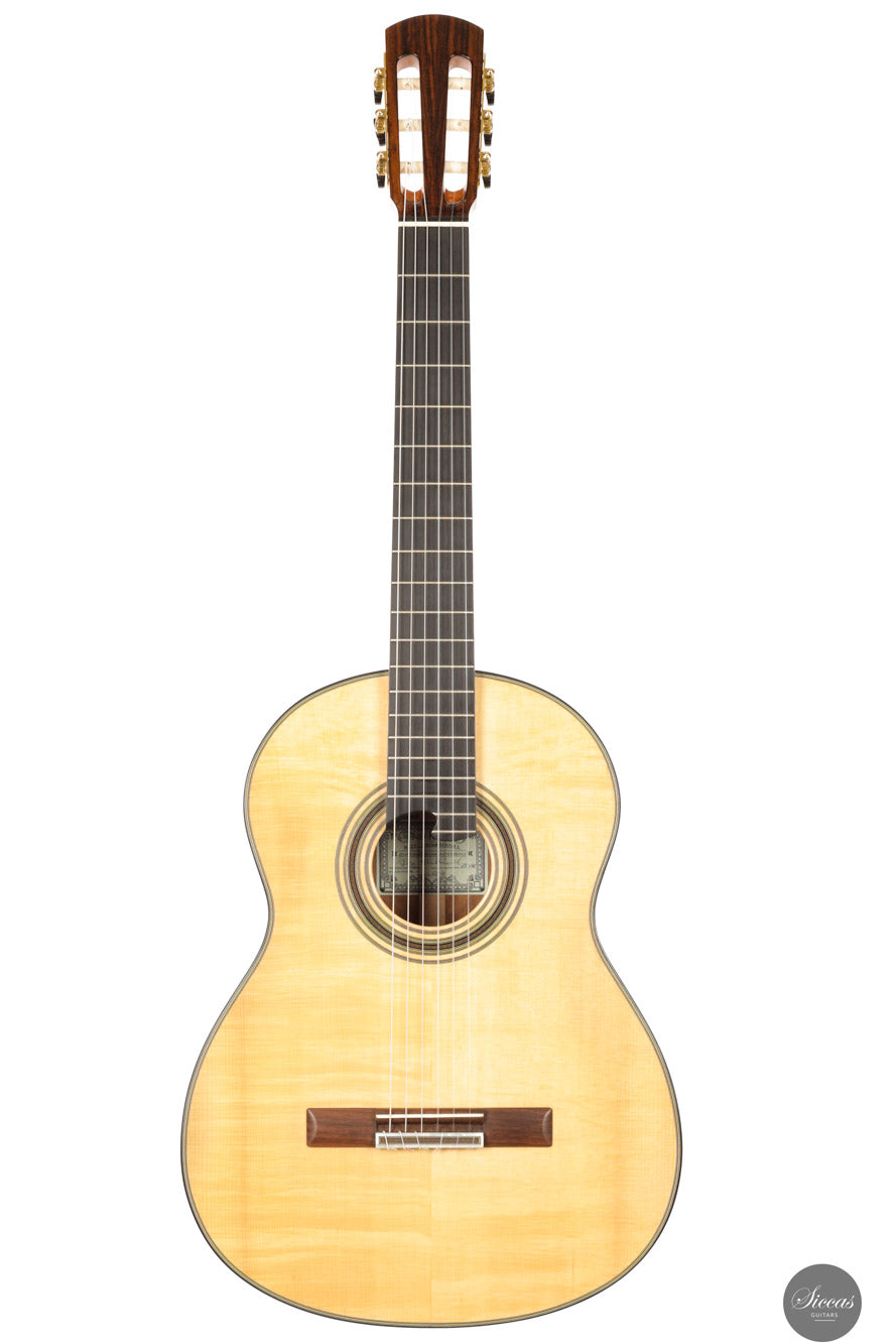 This 2016 guitar, RF 178, is a fine example of Roy Fankhänel’s work, offering a compelling blend of traditional design, tonal sophistication, and masterful detailing. The soundboard is made from premium spruce, wtih outsanding patterns and great tight grain, and paired with ovangkol back and sides, a rare choice for classical guitar, but nevertheless an appreciated tonewood for its warm, articulate response and striking grain patterns. Visually, the instrument displays a high level of refinement. The intricate rosette and matching purfling elements are crafted from a combination of Indian rosewood, maple, and pear wood. These details extend across the top, back, and headstock, enhancing the visual symmetry and charm of the instrument. The bridge, with a twelve-hole tie block and elegant shape, adds both functionality and aesthetic cohesion. Tonally, the RF 178 offers a generous, rich sound with strong projection and excellent sustain. The trebles are smooth and singing, while the bass notes provide depth and support without overpowering. The slightly elevated fingerboard allows for effortless access and precision, making this guitar a pleasure to play across all registers. With its excellent construction, tonal balance, and tasteful ornamentation, this is a concert-level instrument that embodies the best of German lutherie.