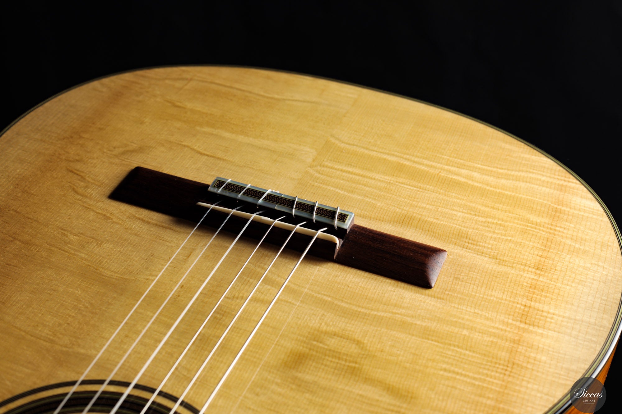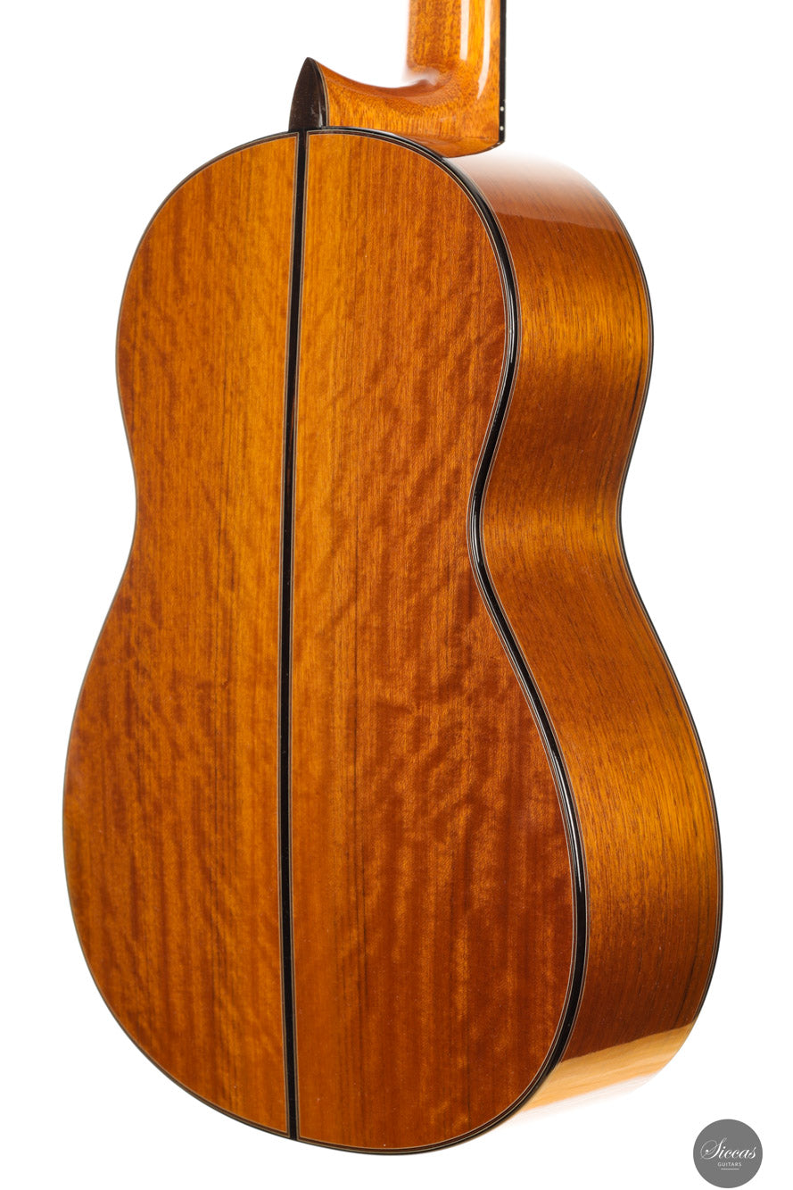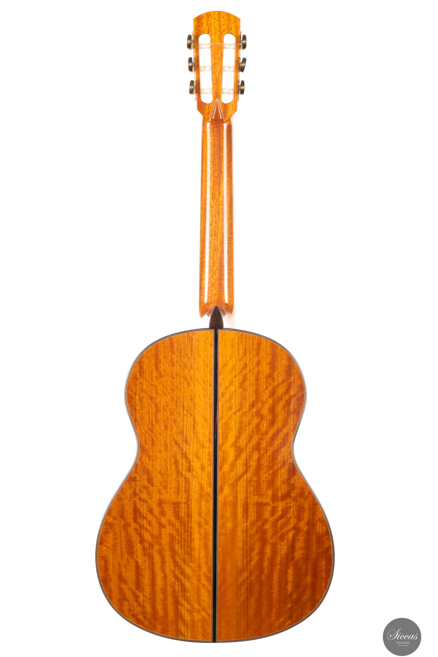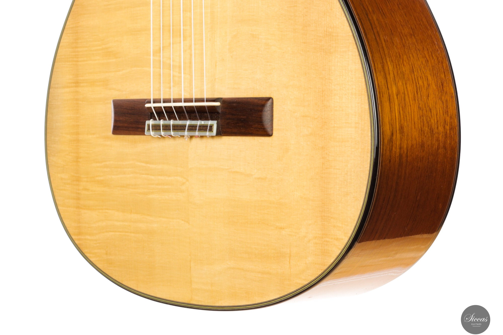 This 2016 guitar, RF 178, is a fine example of Roy Fankhänel’s work, offering a compelling blend of traditional design, tonal sophistication, and masterful detailing. The soundboard is made from premium spruce, wtih outsanding patterns and great tight grain, and paired with ovangkol back and sides, a rare choice for classical guitar, but nevertheless an appreciated tonewood for its warm, articulate response and striking grain patterns. Visually, the instrument displays a high level of refinement. The intricate rosette and matching purfling elements are crafted from a combination of Indian rosewood, maple, and pear wood. These details extend across the top, back, and headstock, enhancing the visual symmetry and charm of the instrument. The bridge, with a twelve-hole tie block and elegant shape, adds both functionality and aesthetic cohesion. Tonally, the RF 178 offers a generous, rich sound with strong projection and excellent sustain. The trebles are smooth and singing, while the bass notes provide depth and support without overpowering. The slightly elevated fingerboard allows for effortless access and precision, making this guitar a pleasure to play across all registers. With its excellent construction, tonal balance, and tasteful ornamentation, this is a concert-level instrument that embodies the best of German lutherie.