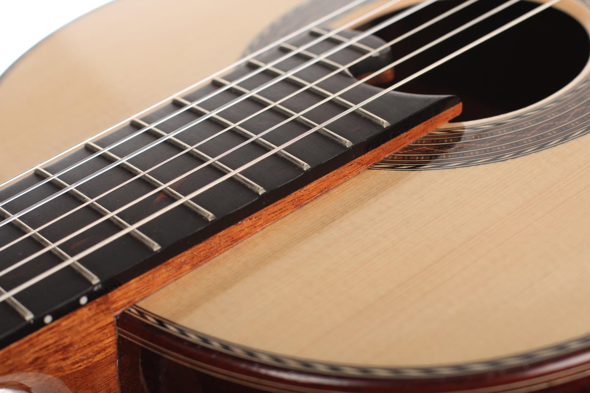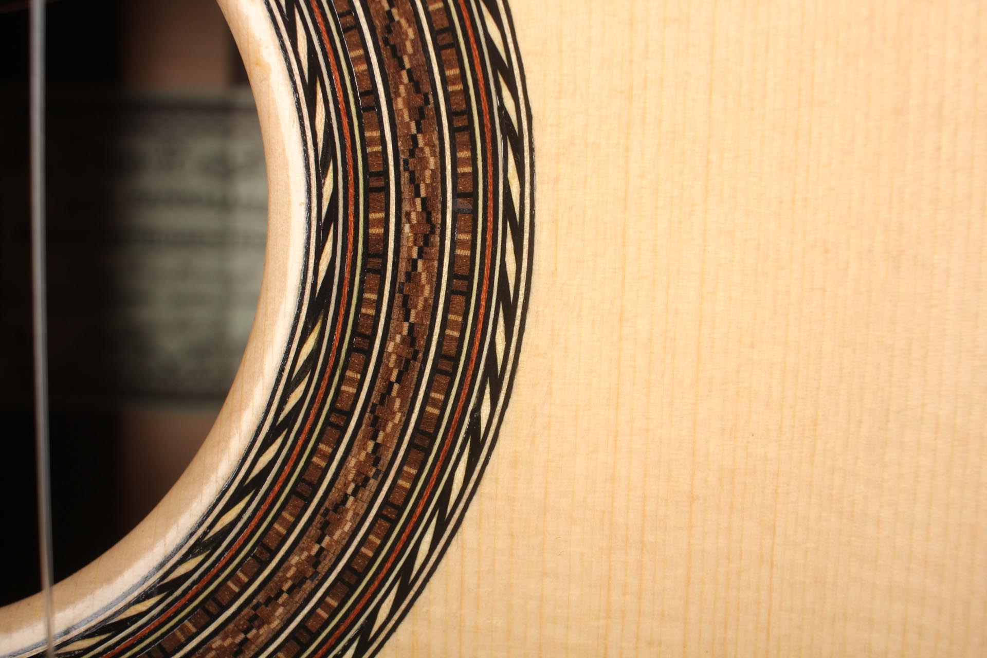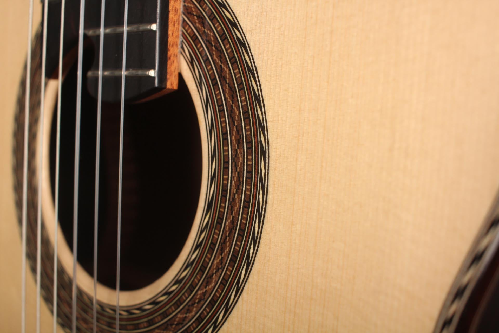 Diese edle Gitarre von Roy Fankhänel wurde Anfang Januar 2016 von Roy Fankhänel fertiggestellt. Dekorative Elemente wie die Rosette und das Binding wurden von Roy Fankhänel entworfen und in Handarbeit gefertigt. Sie geben dem Instrument eine traditionelle und zugleich moderne Optik. Perfekt in das Gesamtbild fügt sich der Steg mit 12-Loch-Bohrung ein, welcher zusätzlich durch eine schöne Perlmuttumrandung am Knüpfblock verziert. Auffällig sind auch die Ränder aus Ovangkol, die den edlen Charakter der Gitarre unterstreichen. Das Innenleben (Klötzchen und Bodenleisten) besteht ,außer auf der Decke, komplett aus Mahagoni. Die Deckenbeleistung besteht aus Fichte. Die Mechaniken sind von Rubner. Kleinste Spielspuren sind bei genauen hinsehen sichtbar. Ein Hiscox Pro II Koffer ist inklusive.
