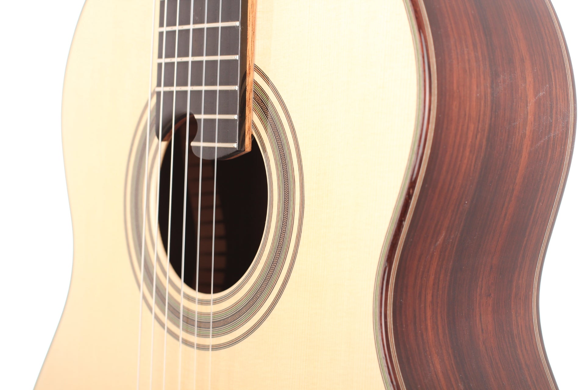 Diese edle Gitarre von Roy Fankhänel wurde Anfang Januar 2016 von Roy Fankhänel fertiggestellt. Dekorative Elemente, wie Rosette und das Binding, wurden von Roy Fankhänel entworfen und in Handarbeit gefertigt. Sie geben dem Instrument eine traditionelle und zugleich moderne Optik. Perfekt in das Gesamtbild fügt sich der Steg mit 12-Loch-Bohrung ein, welcher zusätzlich durch eine schöne Perlmutterumrandung am Knüpfblock verziert. Auffällig sind auch die Ränder aus Ovangkol, die den edlen Charakter der Gitarre unterstreichen. Das Innenleben (Klötzchen und Bodenleisten) besteht außer auf der Decke komplett aus Mahagoni. Die Deckenbeleistung besteht aus Fichte. Die Mechaniken sind von Rubner.