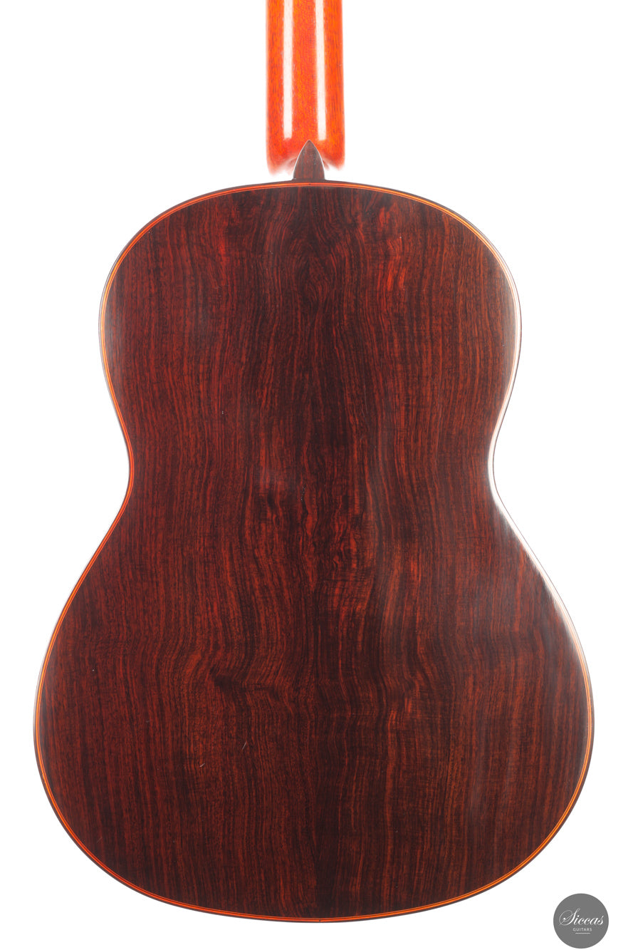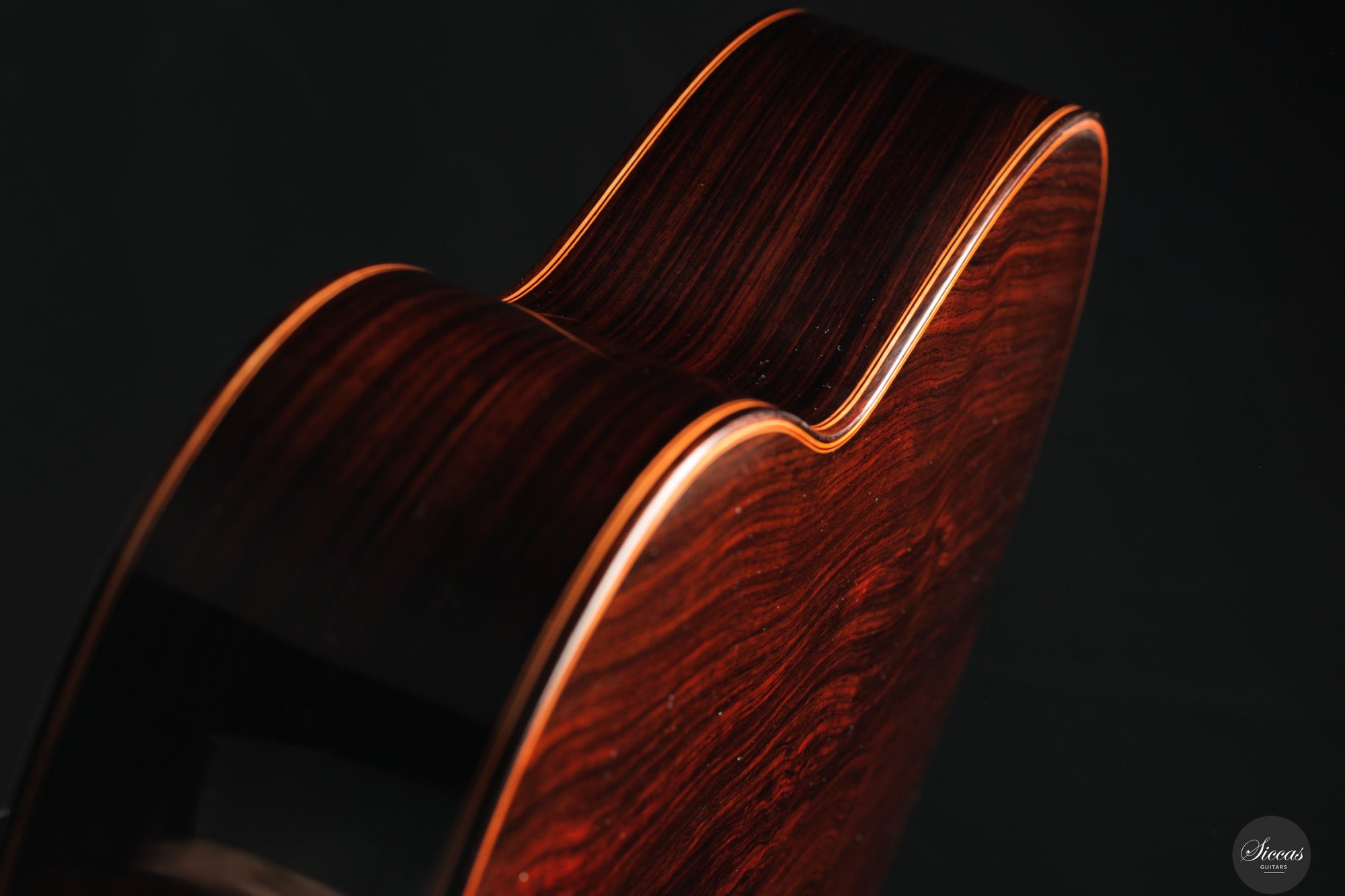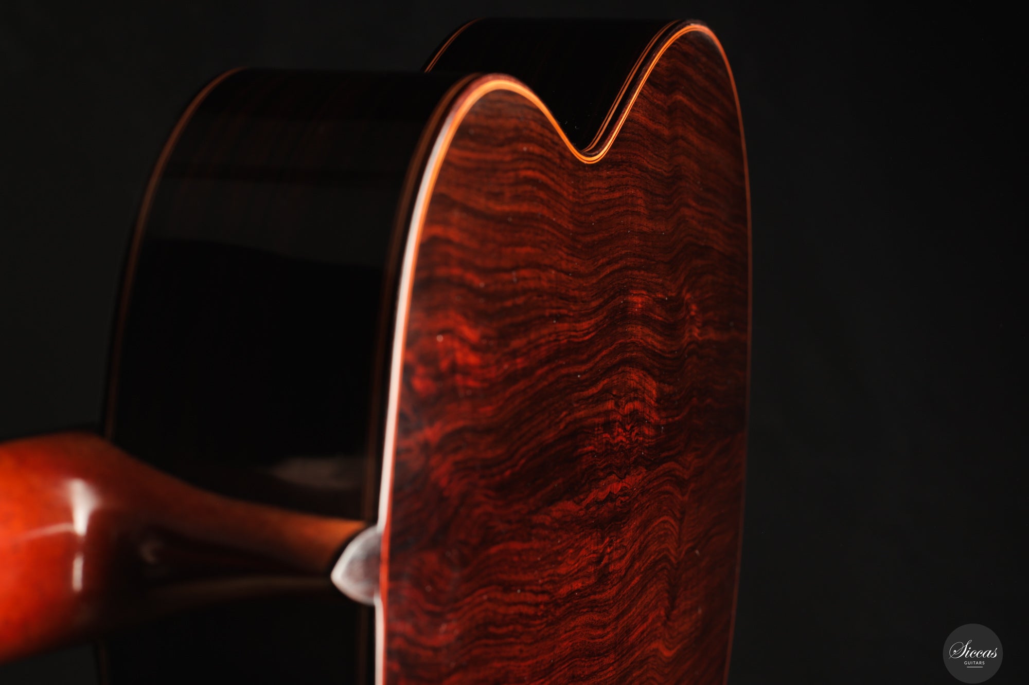 Diese Double-Top-Gitarre aus dem Jahr 2026 mit Zederndecke und Boden und Zargen aus indischem Palisander zeichnet sich durch einen kompakten, runden und farblich eher dunklen Grundcharakter aus. Die Diskantsaiten klingen weich konturiert und geschmeidig, ohne an Klarheit zu verlieren. Im Vordergrund steht kein brillantes, sondern ein fokussiertes und geschlossenes Klangbild.