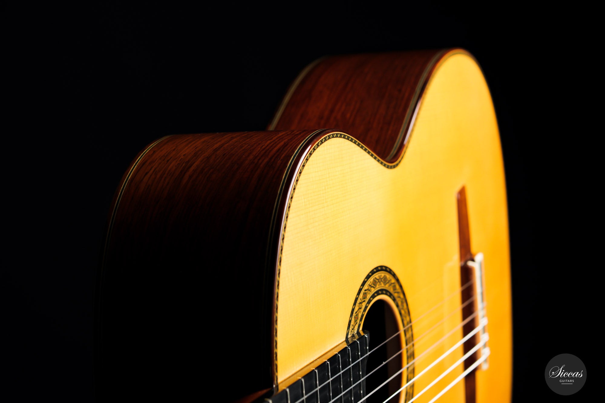 This superb “special” model is recognizable by its asymmetrical bridge as well as its sculpted head. Masaki Sakurai built this guitar in the continuity of his uncle Masaru Kohno’s guitars. It showcases the aesthetics, marquetry, and carving details as well as the sound of Kohno guitars. This instrument built with the extreme precision associated with Japanese craftsmanship is of the highest quality. It features a beautiful selection of precious woods and great attention to detail. This instrument is characterized by its perfect balance and the equality of tones over the entire tonal range. The sound is clean and powerful with a round tone and controlled sympathetic resonances. Although it is a new guitar, it already has a very open sound and therefore promises to be an exceptional instrument if played regularly. Also, the comfortable playability makes this guitar an outstanding concert instrument.