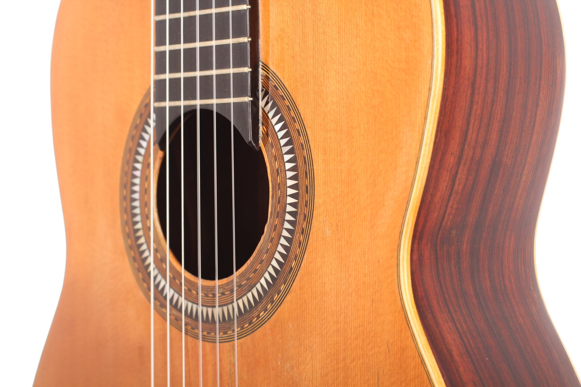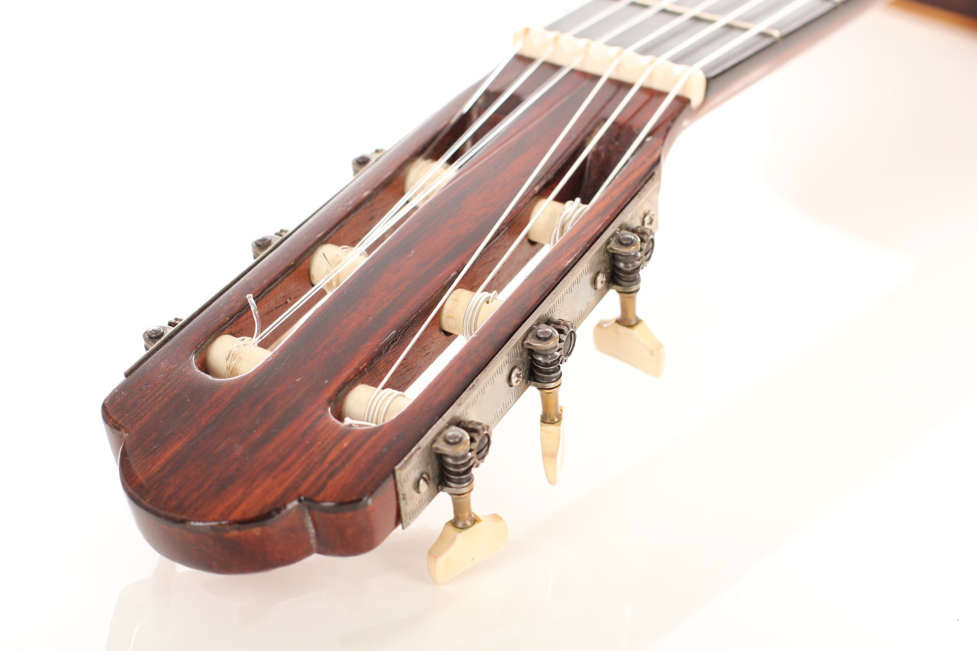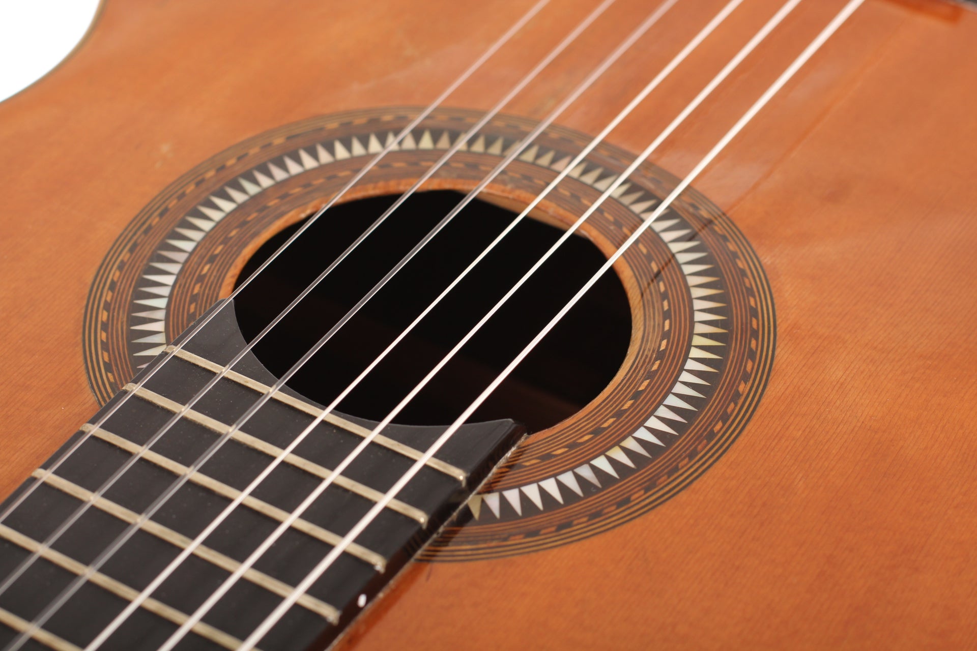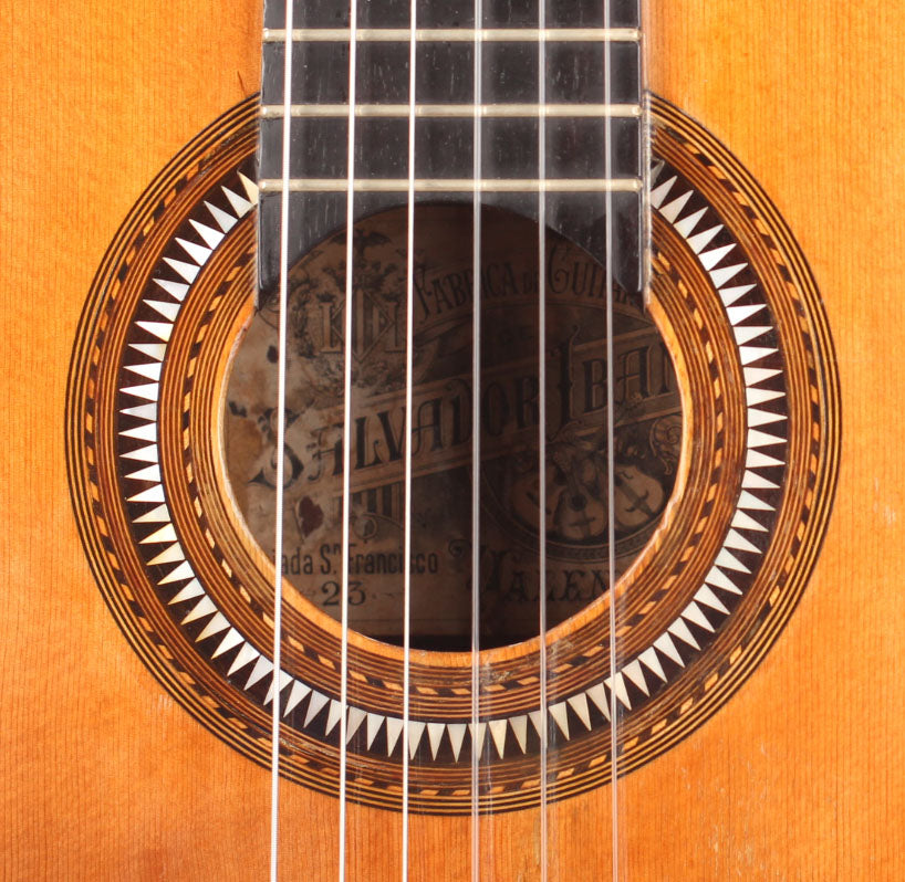 Salvador Ibáñez (* 1854 in Valencia; † 1920) began his apprenticeship as a luthier in Valencia. In 1870 he founded his own workshop where he built guitars, ukuleles, and mandolins. In 1897 he built one of the first double-neck guitars. After his death in 1920, his two sons took over the workshop. This guitar was built around 1900. The spruce top is in impressive condition and has a little repaired crack below the bridge. Back and sides are made of rosewood (one repaired crack). The rosette and the bridge are decorated with mother of pearl inlays. The original tuners have been replaced. A hardshell case is included.