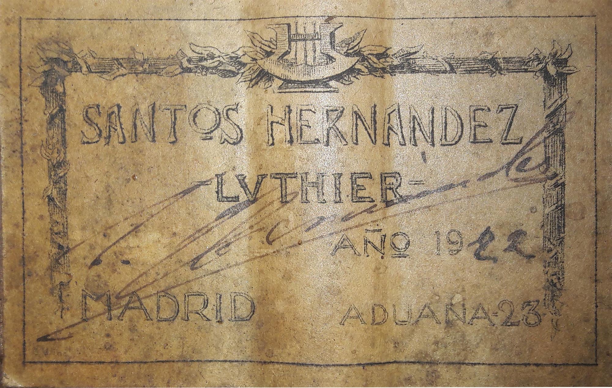 Santos Hernandez (Madrid, 1873-1943) begann sehr früh eine Lehre in der Werkstatt von Valentin Viudes und wechselte dann in die Werkstatt von Rafael Ortega. Nachdem er in einige andere Werkstätten gewechselt und als Soldat für Spanien gearbeitet hatte, übernahm er 1905 schließlich die Position von Enrique Garcia in der Werkstatt von Manuel Ramirez.