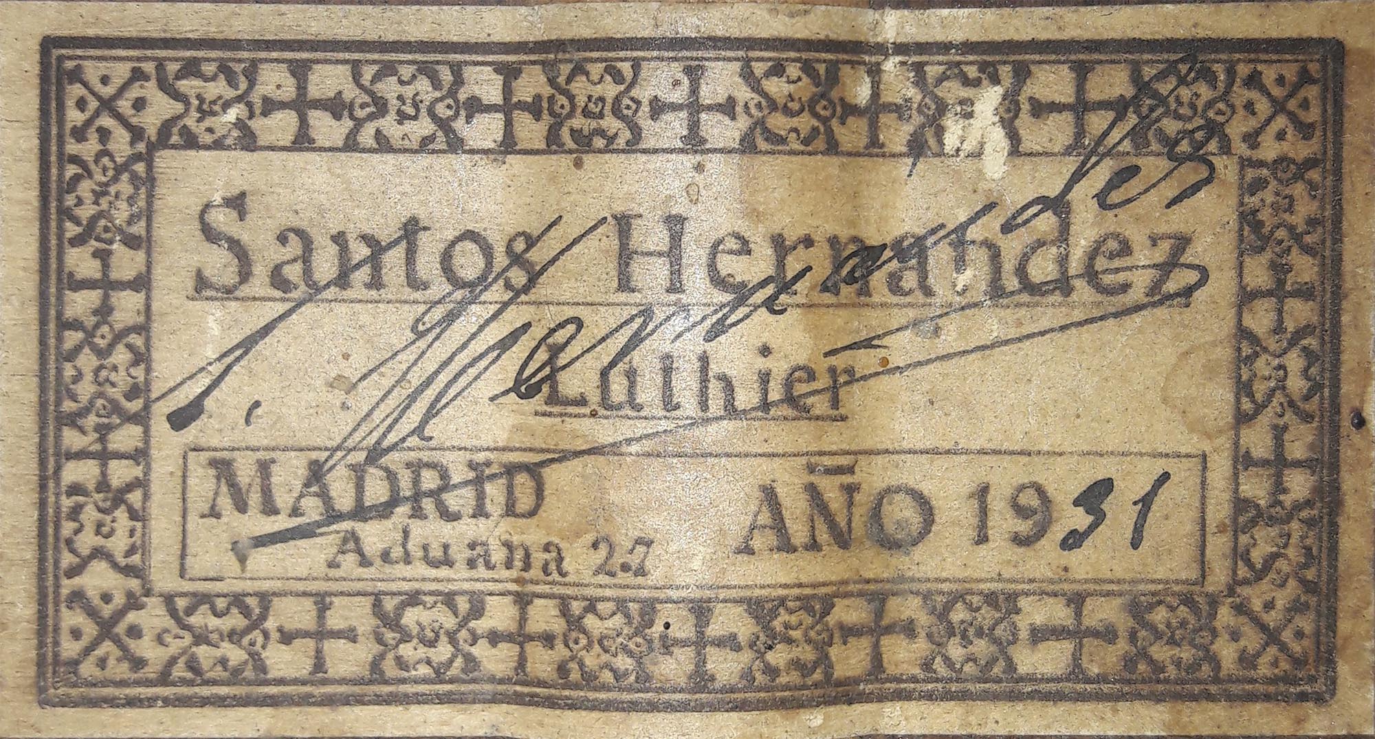 This guitar built by Santos Hernandez in 1931 is absolutely fantastic. Its tonal richness definilty concurrences the best modern guitars and the sweetness of its sound is deeply charming. This very poetic instrument is really one of a kind. The true and delightful trebles have a magnificent timbre and the deep dark basses have a very Spanish spontaneity that makes the classical guitar such a special instrument. It is in good condition with six very well repaired cracks on the top and a few undetectable hair-line splits on the sides. The label is hand signed by Santos Hernandez and the tuners are original. This Santos Hernandez guitar not only is a collectible instrument but also a great concert guitar.