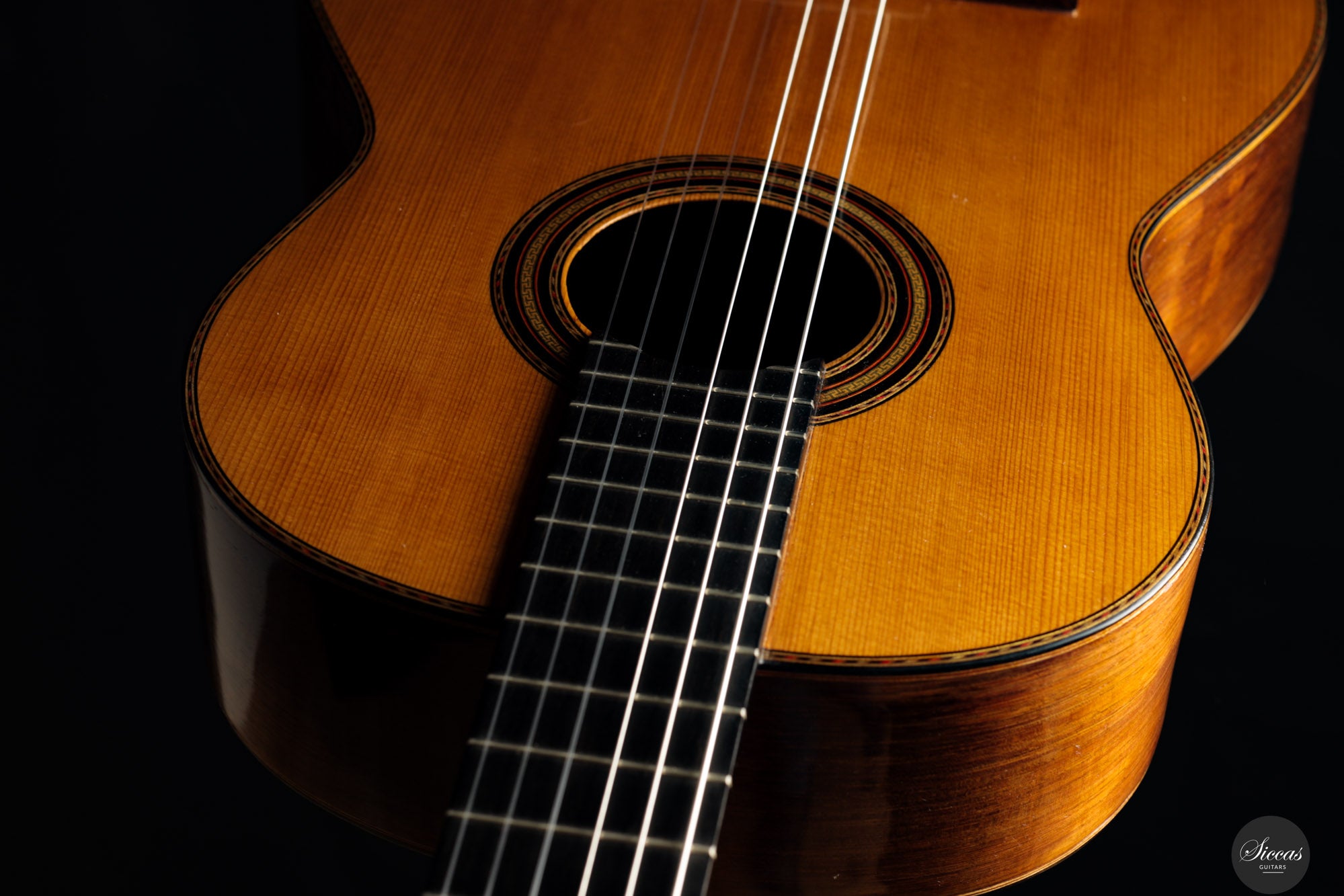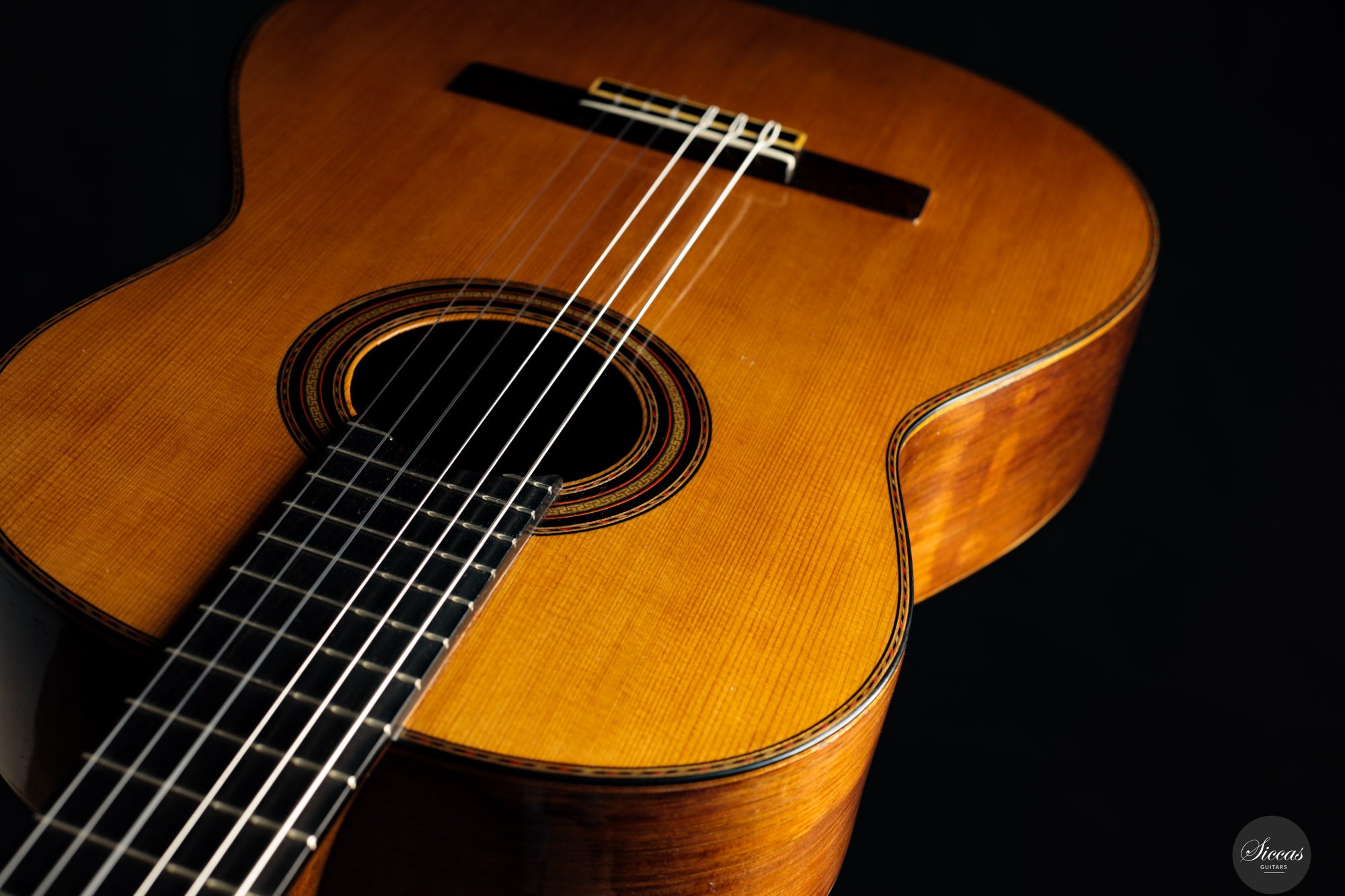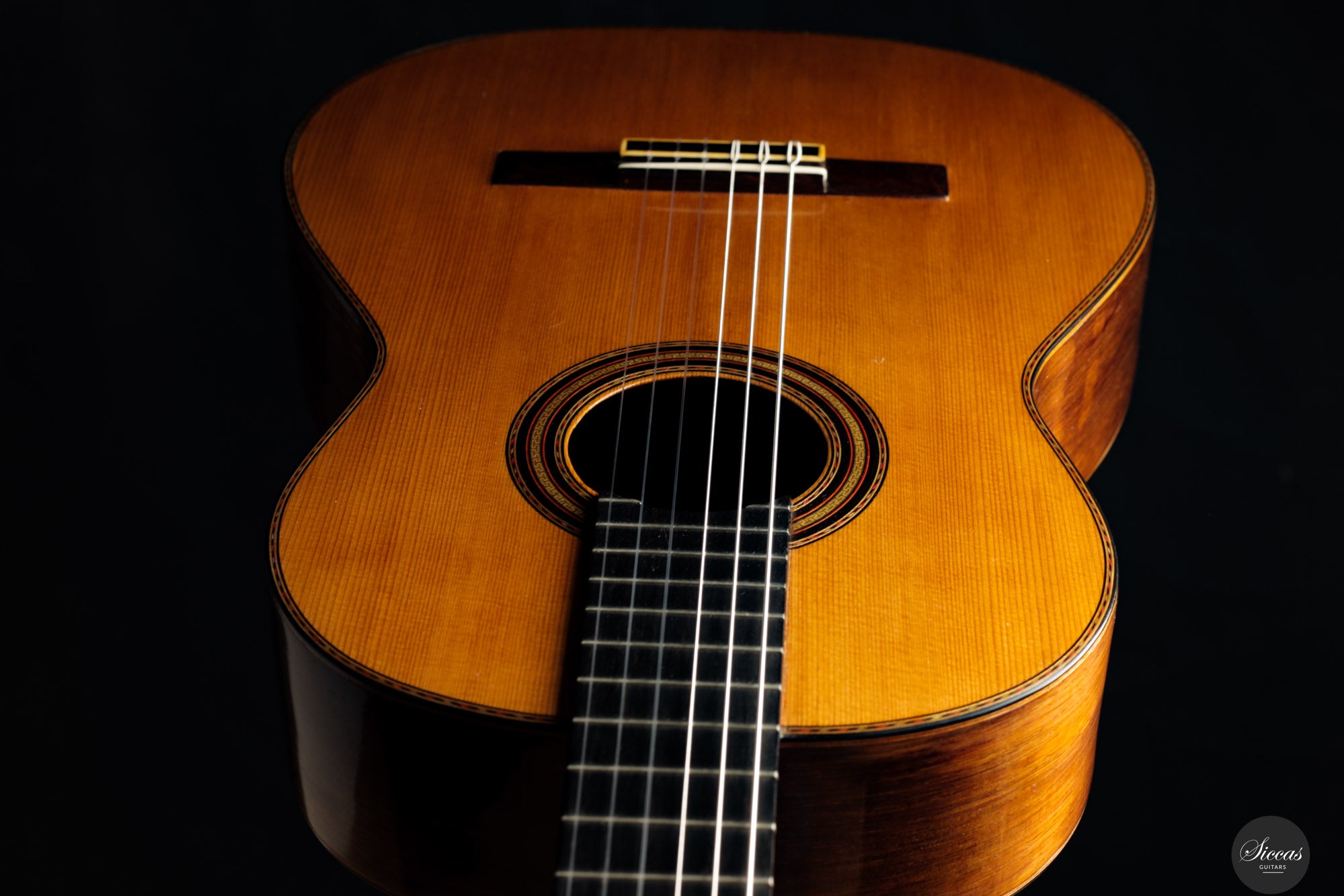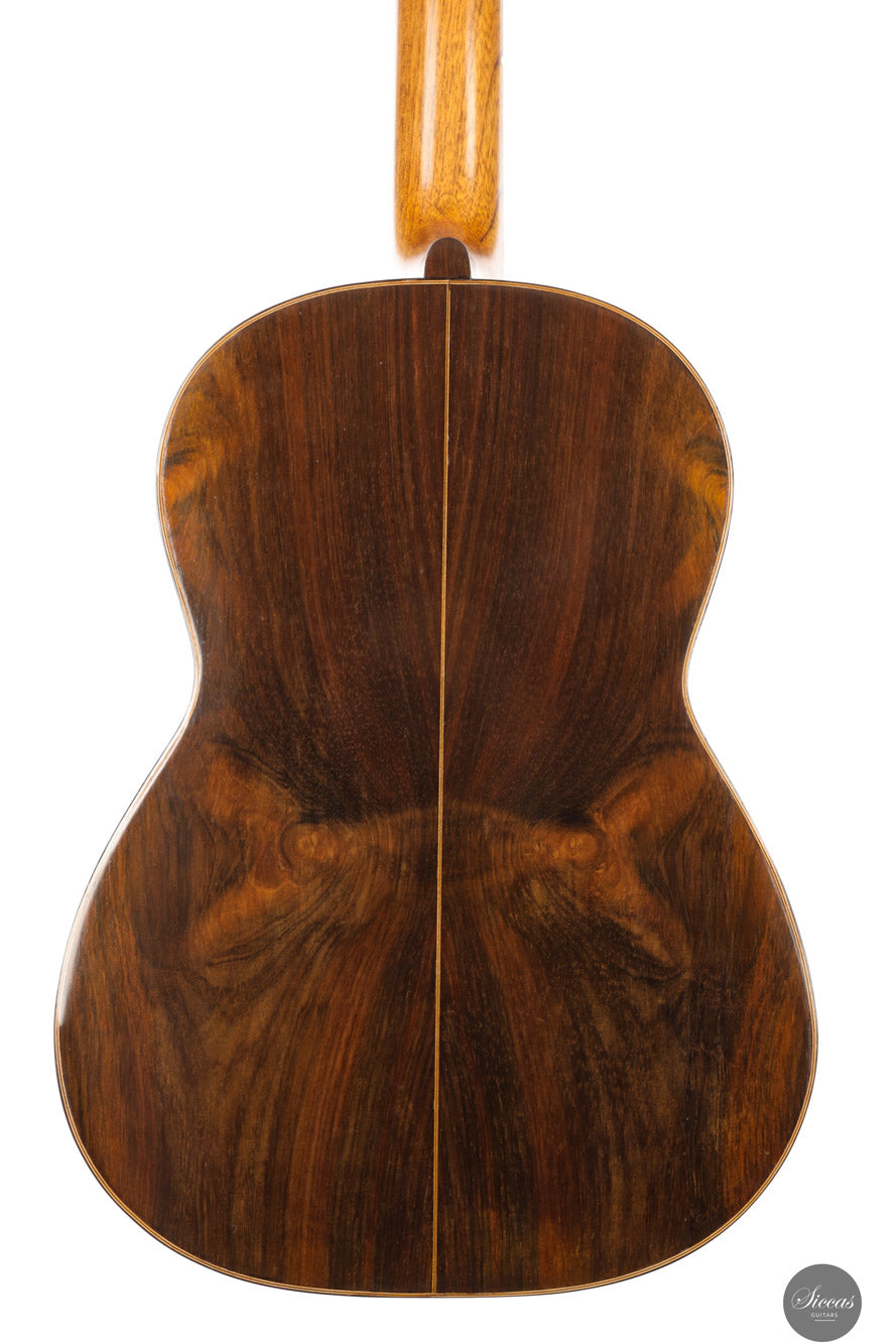 Diese außergewöhnliche Gitarre gilt als eines der Luxusmodelle von Santos Hernández und zeichnet sich durch ihre aufwendige Verzierung aus. Obwohl die Etikett das Jahr 1932 trägt, zeigt unverkennbar die Designelemente und Handwerkskunst, die für die Arbeiten von Santos Hernández in den 1920er-Jahren typisch sind. Die verwendeten Materialien – insbesondere der brasilianische Palisander für Boden und Zargen – stammen mit hoher Wahrscheinlichkeit aus dem gleichen Bestand, den Santos bereits während seiner Zeit bei Viuda de Manuel Ramírez verwendete. Auch das Rosettenmuster mit seiner an die antike griechische Ornamentik erinnernden Zentralverzierung ist ein typisches Detail aus dieser Werkstattperiode.Historische Bedeutung & Zuschreibung