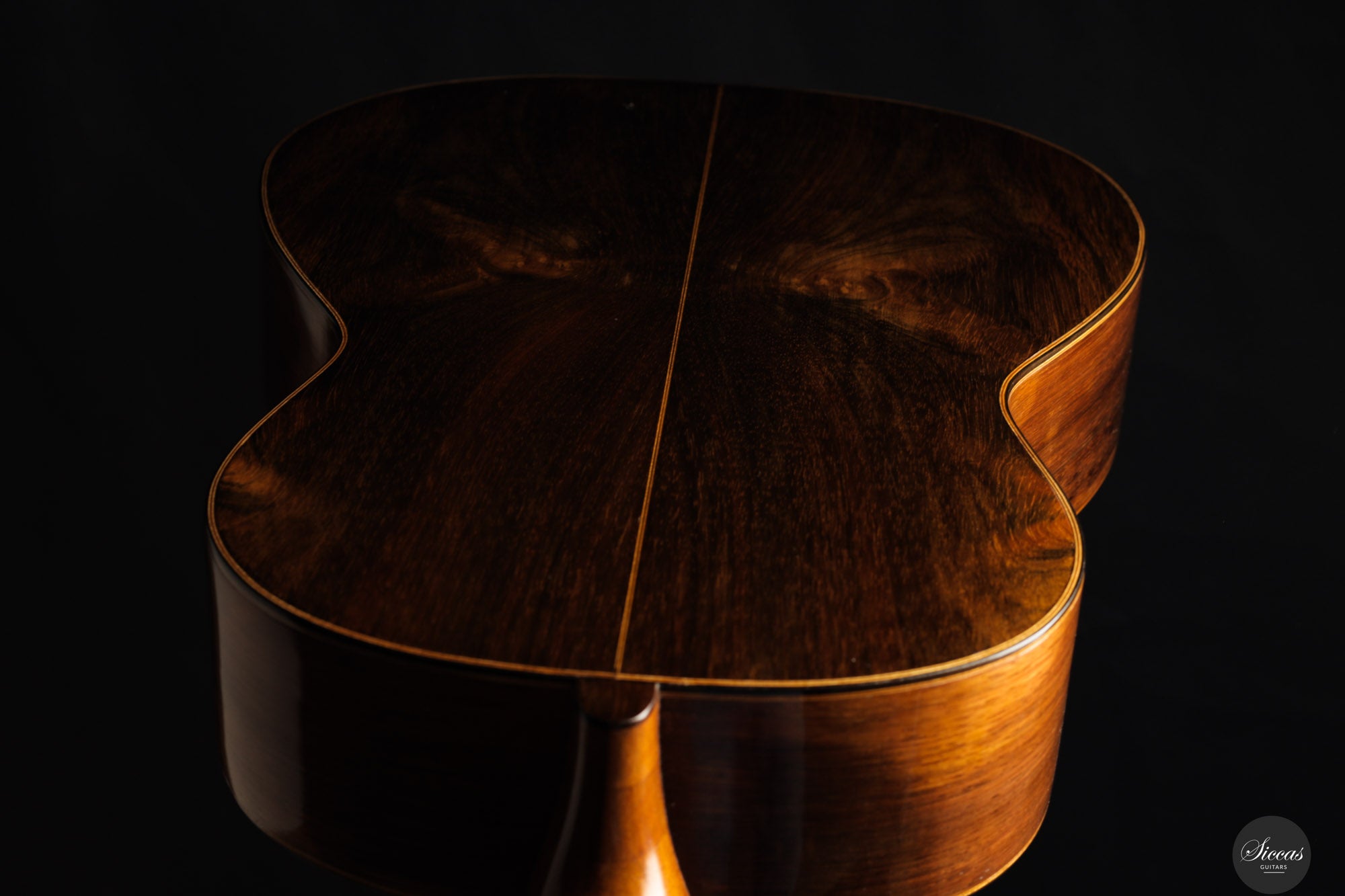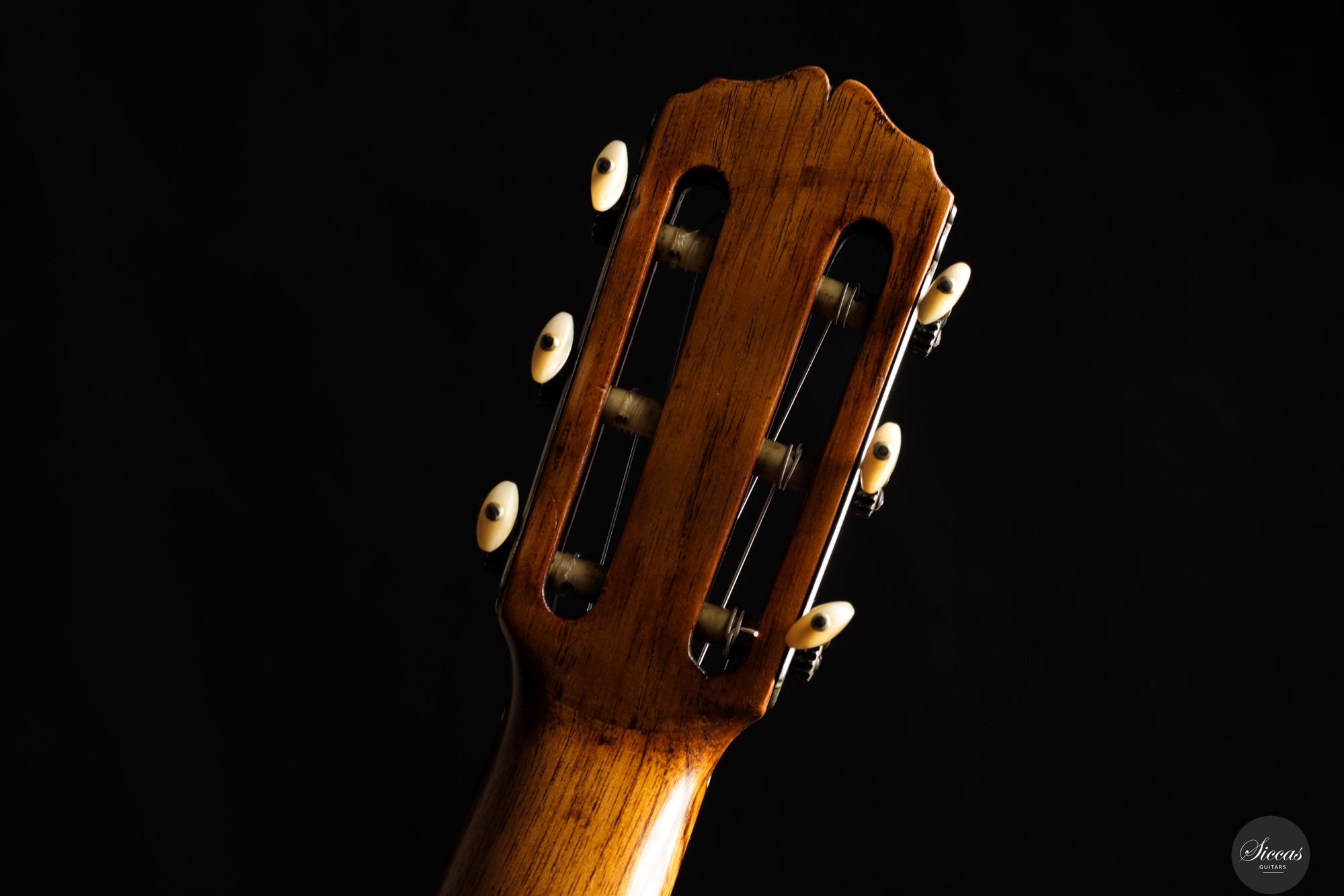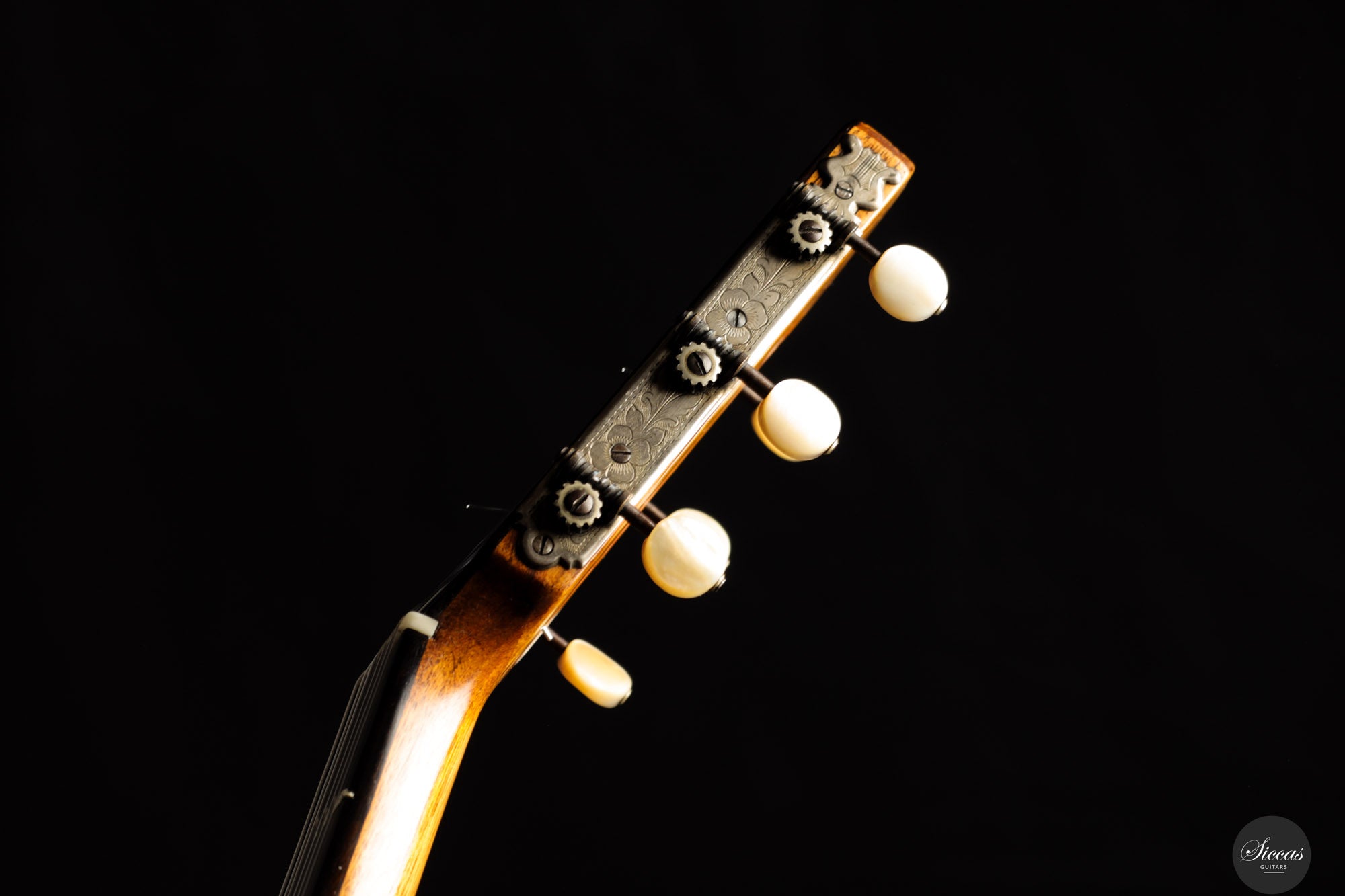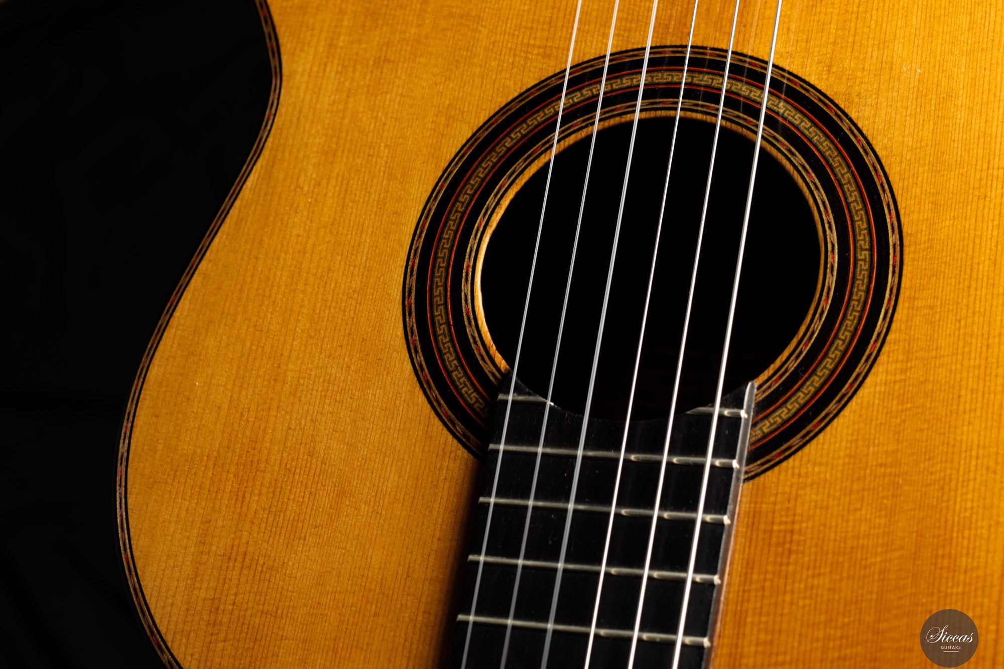 Diese außergewöhnliche Gitarre gilt als eines der Luxusmodelle von Santos Hernández und zeichnet sich durch ihre aufwendige Verzierung aus. Obwohl die Etikett das Jahr 1932 trägt, zeigt unverkennbar die Designelemente und Handwerkskunst, die für die Arbeiten von Santos Hernández in den 1920er-Jahren typisch sind. Die verwendeten Materialien – insbesondere der brasilianische Palisander für Boden und Zargen – stammen mit hoher Wahrscheinlichkeit aus dem gleichen Bestand, den Santos bereits während seiner Zeit bei Viuda de Manuel Ramírez verwendete. Auch das Rosettenmuster mit seiner an die antike griechische Ornamentik erinnernden Zentralverzierung ist ein typisches Detail aus dieser Werkstattperiode.Historische Bedeutung & Zuschreibung