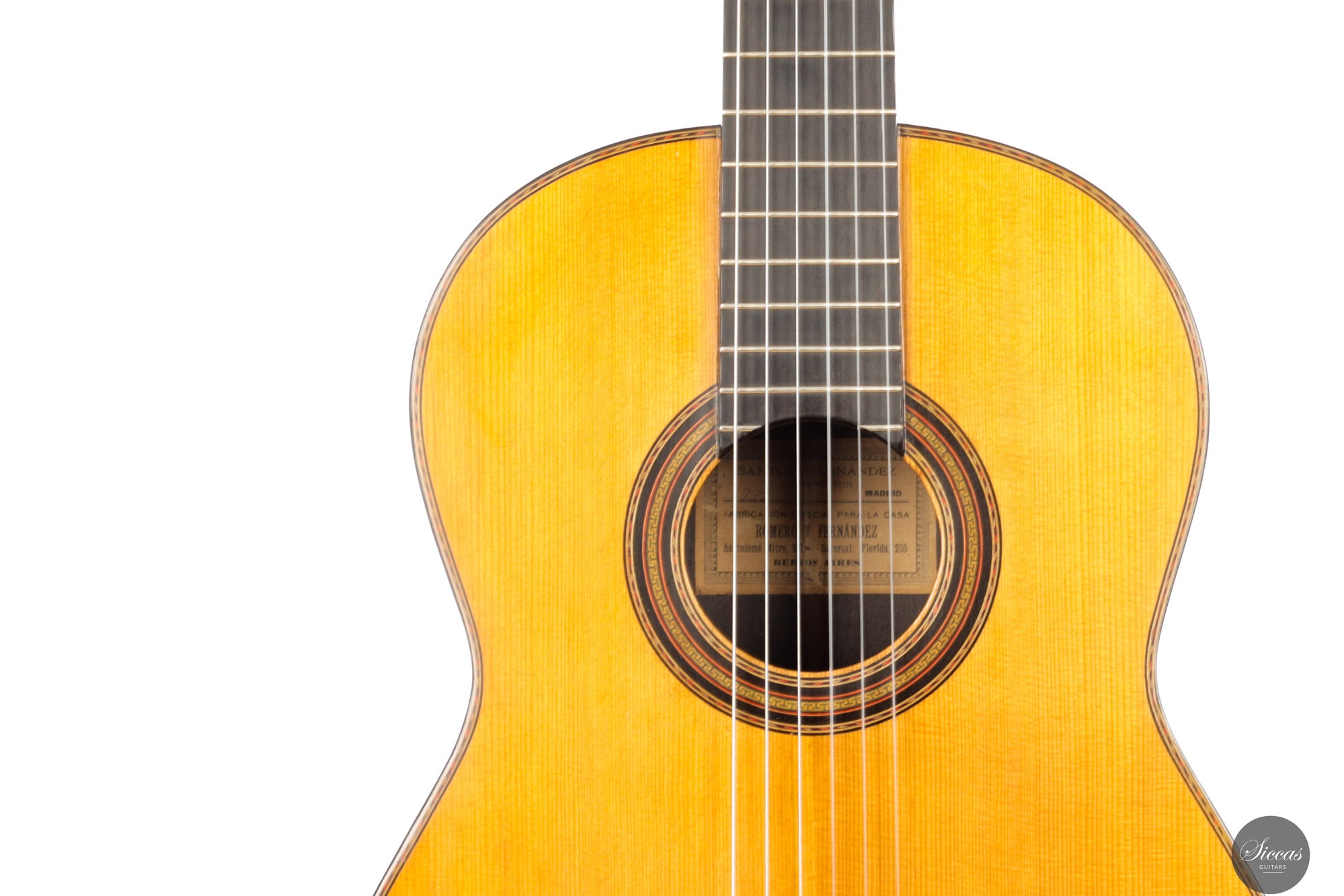 Wie Gabriele Lodi, der dieses Instrument restaurierte, erklärt, ist es wichtig, die Umbruchszeit zu verstehen, in der Santos Hernández seine Anstellung bei Viuda de Manuel Ramírez aufgab und seine eigene Werkstatt gründete. In dieser Phase, so Lodi, sicherte sich Santos vermutlich einen Exklusivvertrag mit der Firma Romero y Fernández, um einen gesicherten Absatzmarkt – vor allem in Argentinien – zu bedienen. Einige dieser Gitarren wurden unter Zeitdruck gefertigt und teilweise sogar ohne Etikett ausgeliefert. Wahrscheinlich entstand in diesem Zusammenhang auch der erste Stempel von Santos, den er unter dem Resonanzboden anbrachte, um seine Arbeit zu signieren und zu authentifizieren.Konstruktion & Innenaufbau