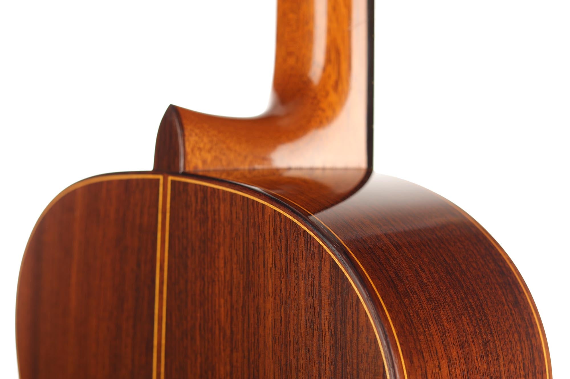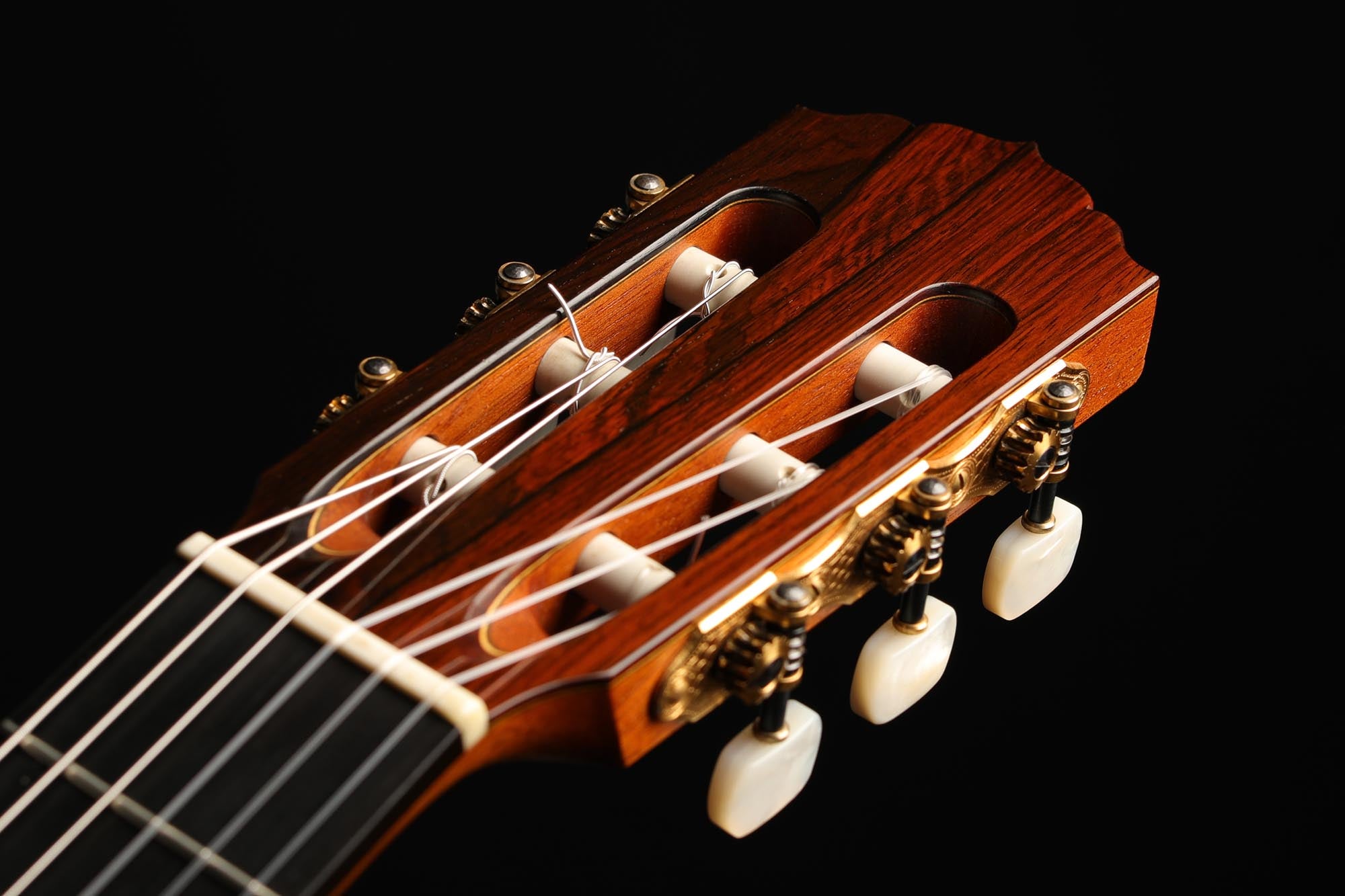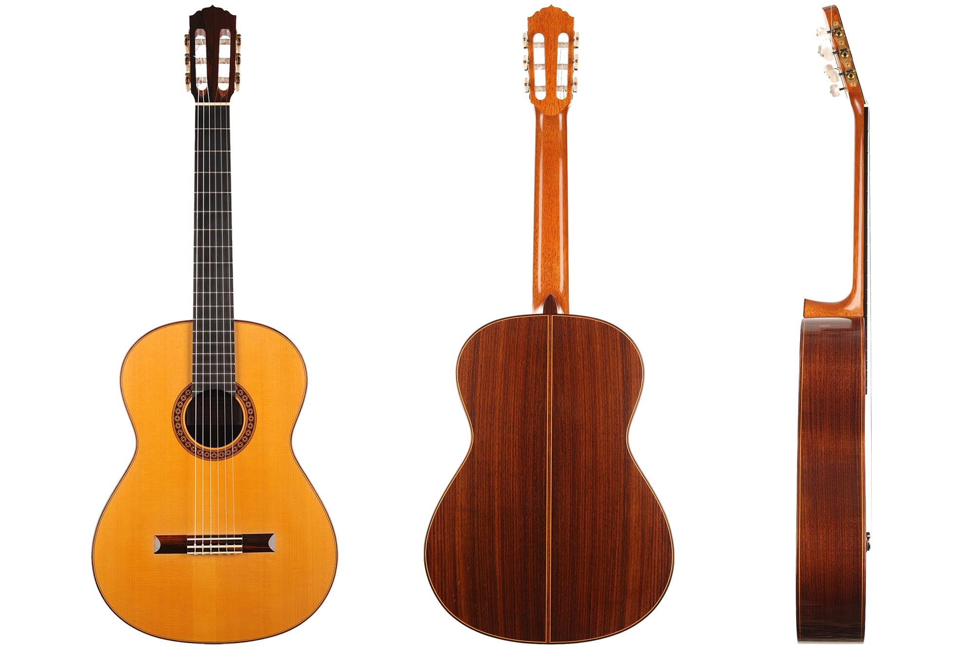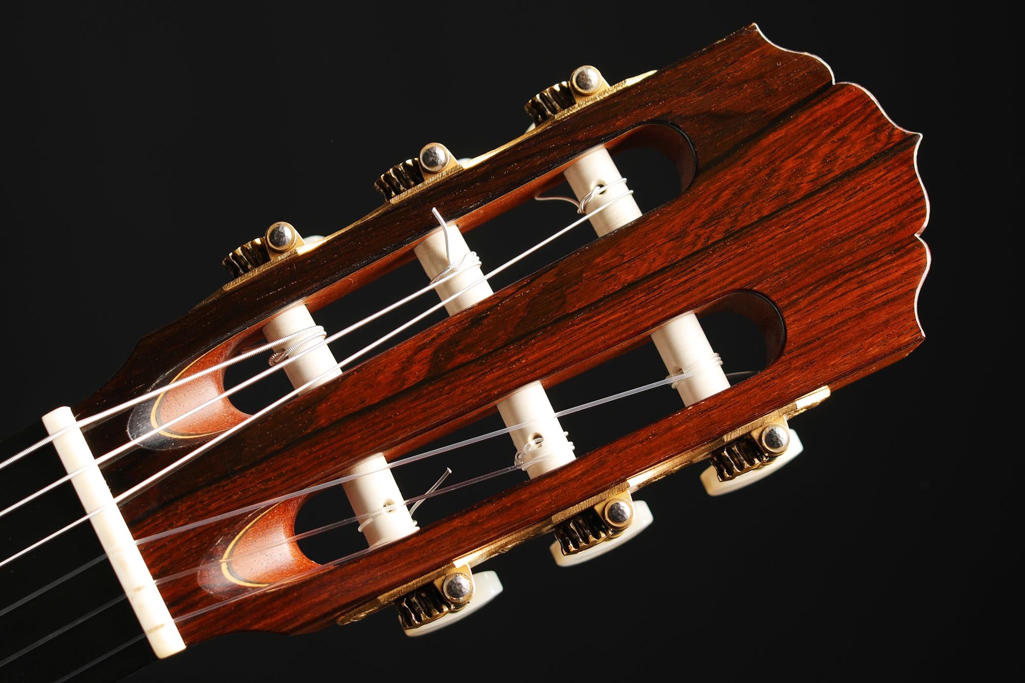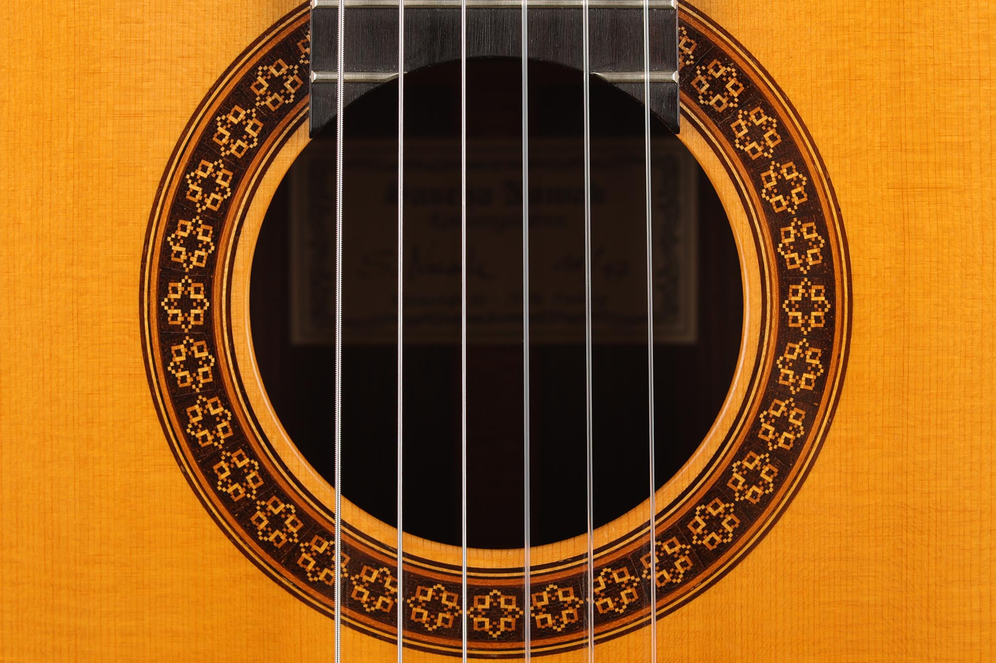 Diese 1997 gebaute Gitarre befindet sich in einem gut erhaltenen Zustand. Dem Alter entsprechend sind zwar einige Spielspuren sichtbar, aber es sind keine größeren Reparaturen oder Schäden an der Gitarre festszustellen. Die hochwertigen originalen Reischl Mechaniken sorgen für hochpräzises und perfektes Stimmen.Darüber hinaus unterstreicht die Kombination aus Fichtendecke, und Boden und Zargen aus elegantem indischem Palisander den traditionellen Charakter dieser Gitarre. Einige wunderbare geometrische Variationen sind in der Rosette sichtbar, deren Design ebenso wie der Rest dieses Instruments bewundernswert ist.
