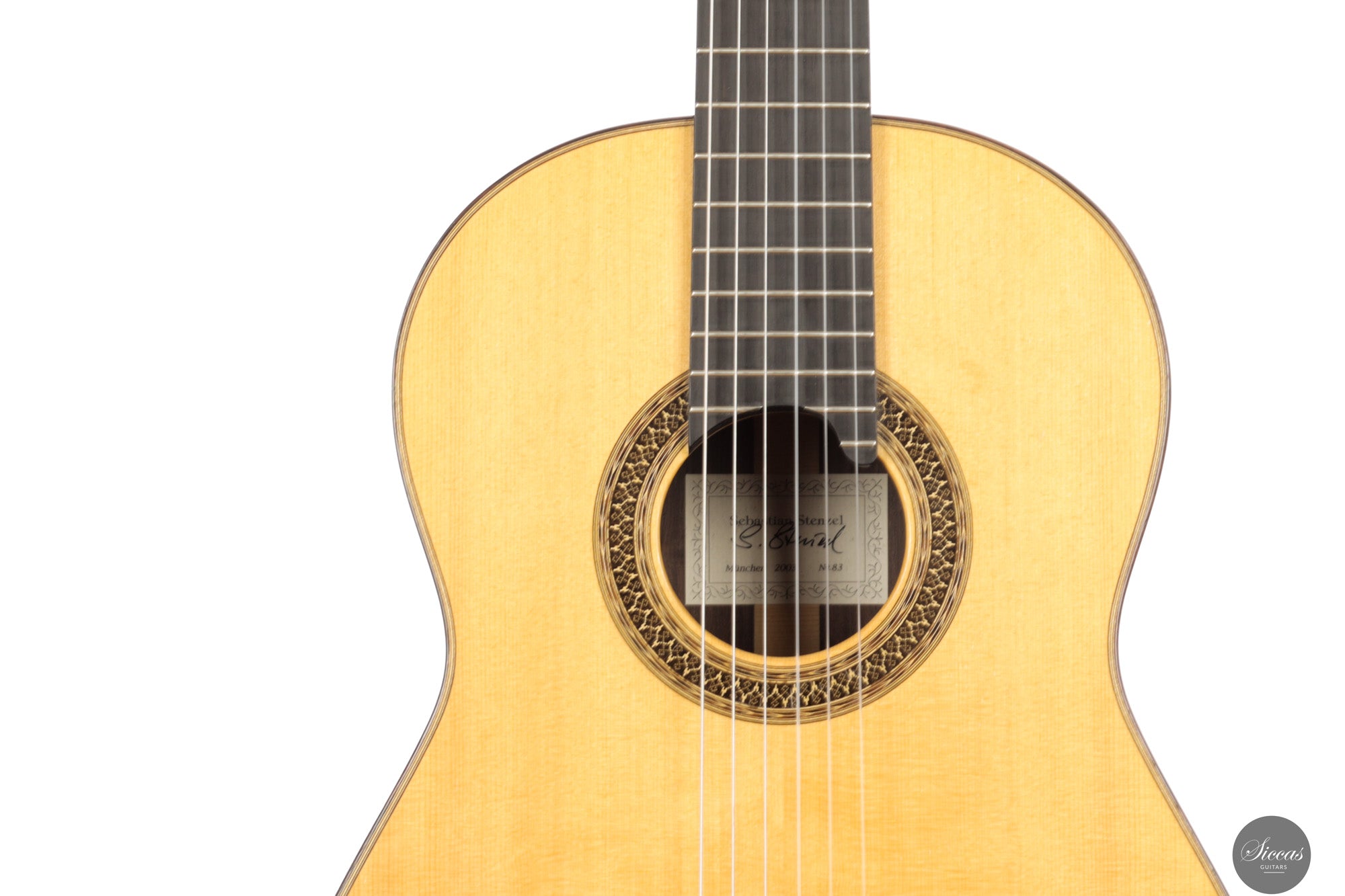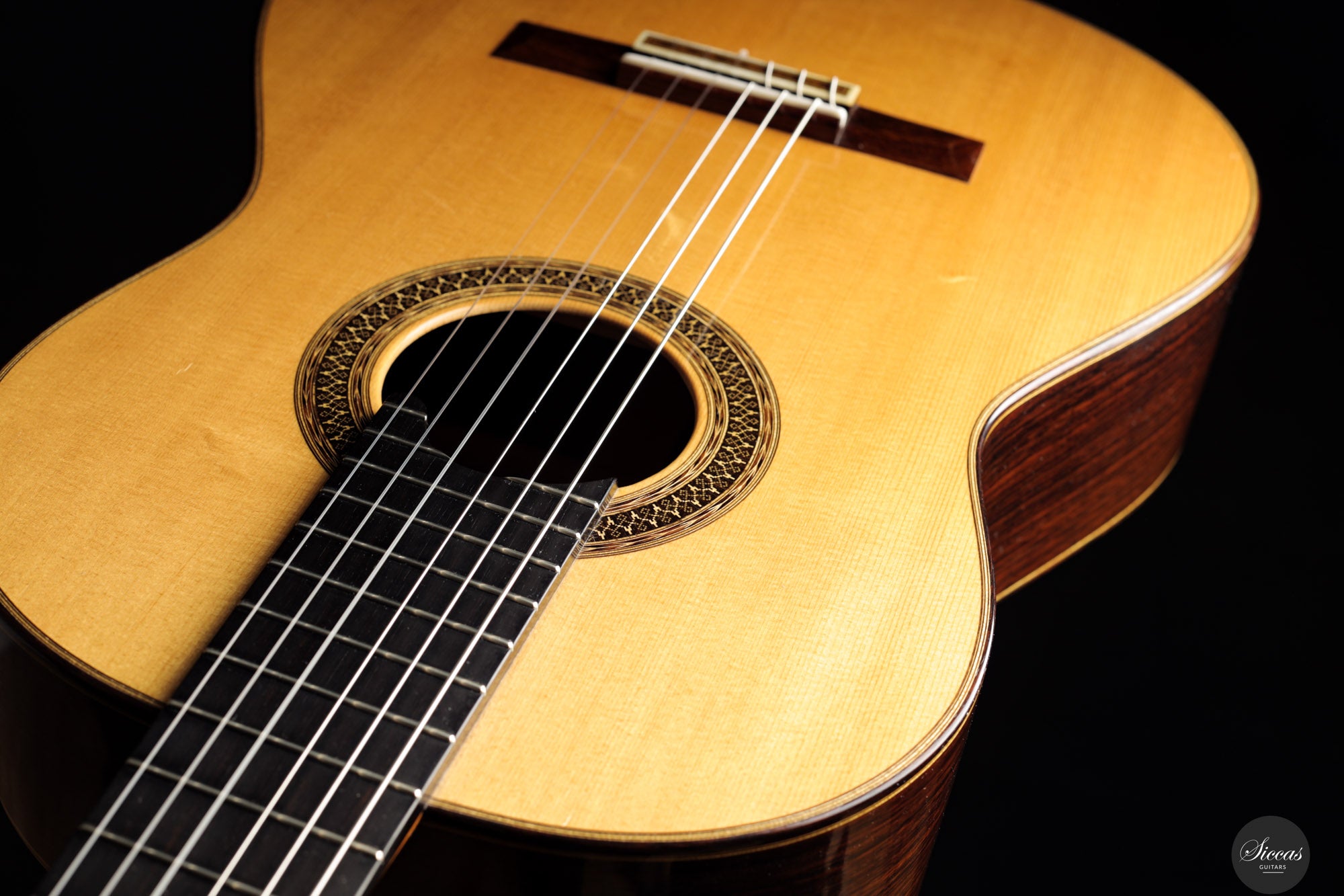 Diese Konzertgitarre von 2003, Nr. 83, basiert auf einem Hauser-inspirierten Konzept mit klanglich und ergonomisch durchdachten Eigenentwicklungen. Mit ihrer Mensur von 640 mm, einer Sattelbreite von 50 mm und einem Gewicht von nur 1,4 kg ist sie außergewöhnlich komfortabel. Die Spielbarkeit wird durch die leichte Ansprache und das gut ausbalancierte Setup nochmals gesteigert – ideal für Musiker, die klangliche Vielfalt mit hoher Spielergonomie verbinden möchten.