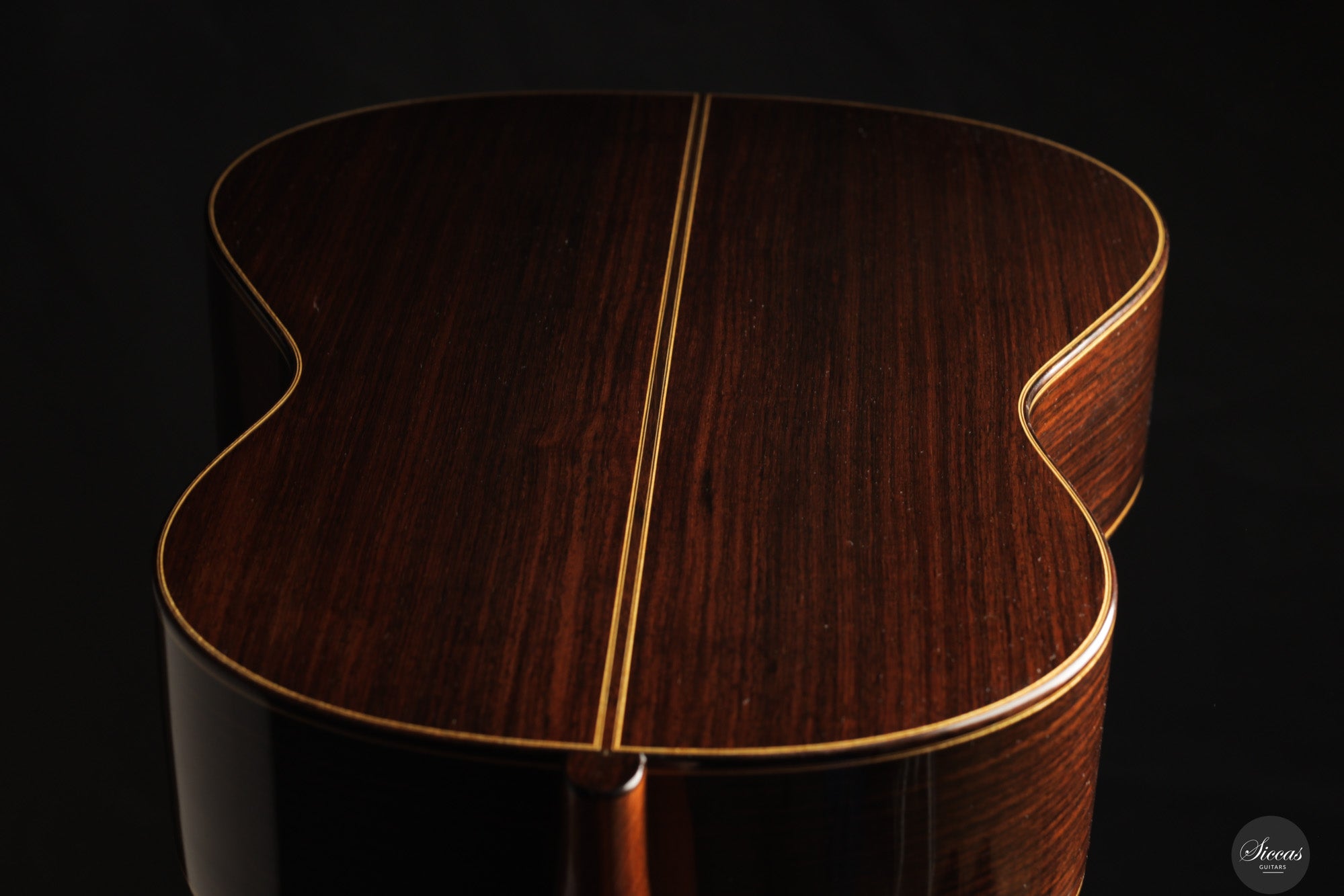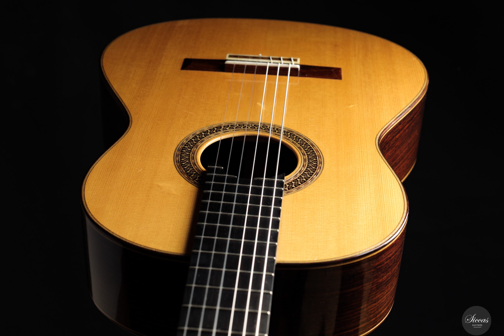 Klanglich überzeugt die Gitarre durch ihre weit tragenden, luftigen Bässe, die nicht nur im Raum, sondern auch direkt unter den Fingern spürbar sind – ein Markenzeichen von Stenzels Bauweise. Die Fichtendecke und der Korpus aus indischem Palisander sorgen für klare, gesangliche Höhen und ein stabiles, tragfähiges Mittelregister. Die Bässe reagieren äußerst sensibel und entfalten unter Druck ein reiches Volumen. Reischl-Mechaniken (ehemals Landstorfer) gewährleisten zuverlässige Funktionalität mit klassischem Bezug. Der minimalistisch gestaltete Halsfuß setzt einen modernen, eleganten Akzent. Die dünne Nitrozelluloselackierung bewahrt die klangliche Offenheit und betont zugleich die natürliche Ästhetik des Holzes.