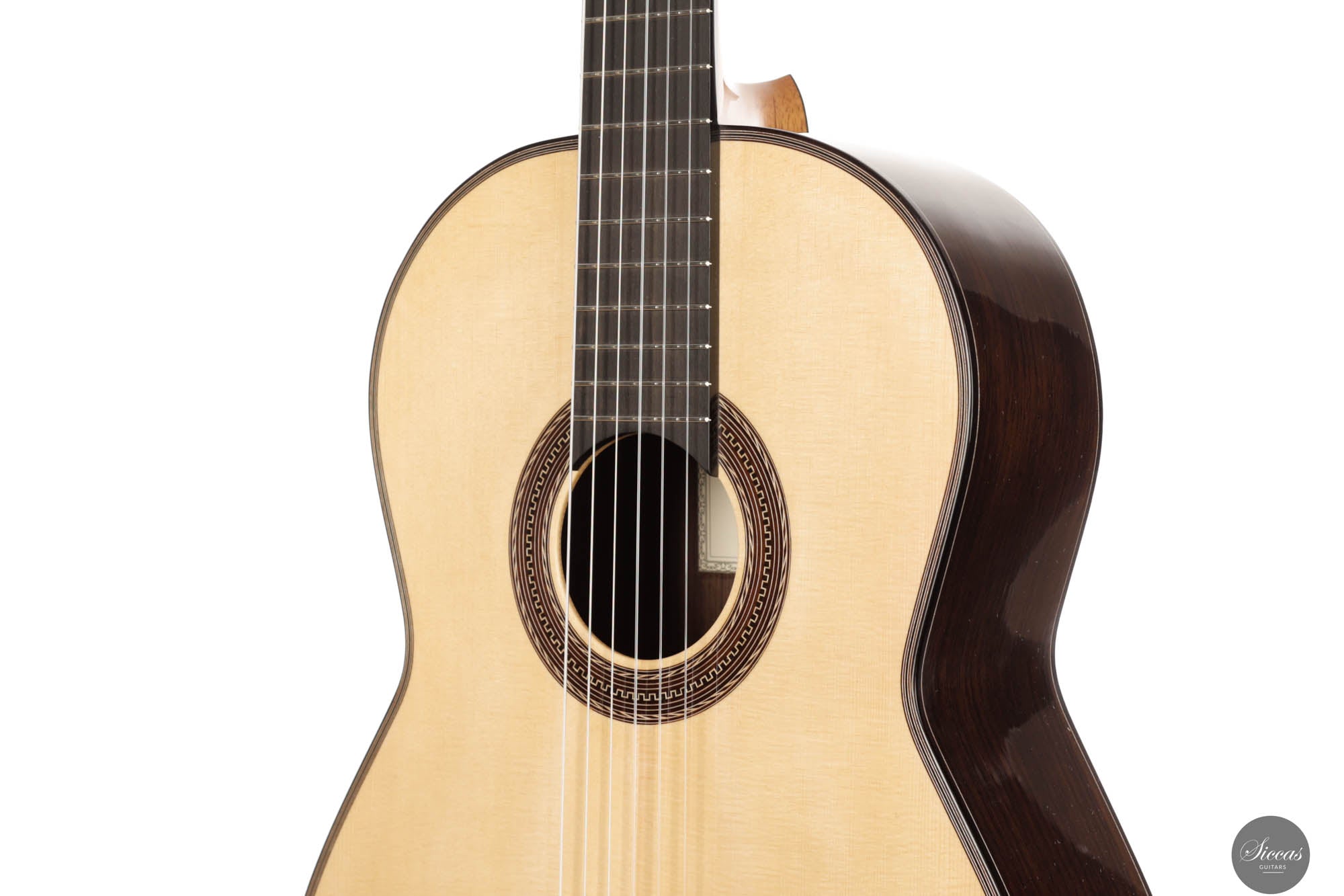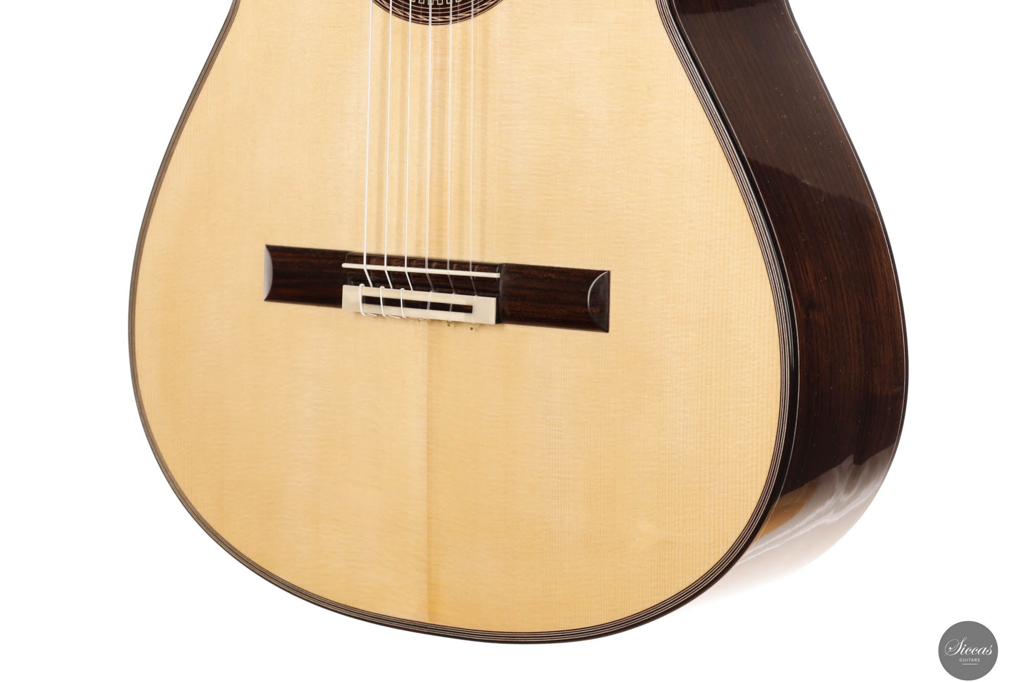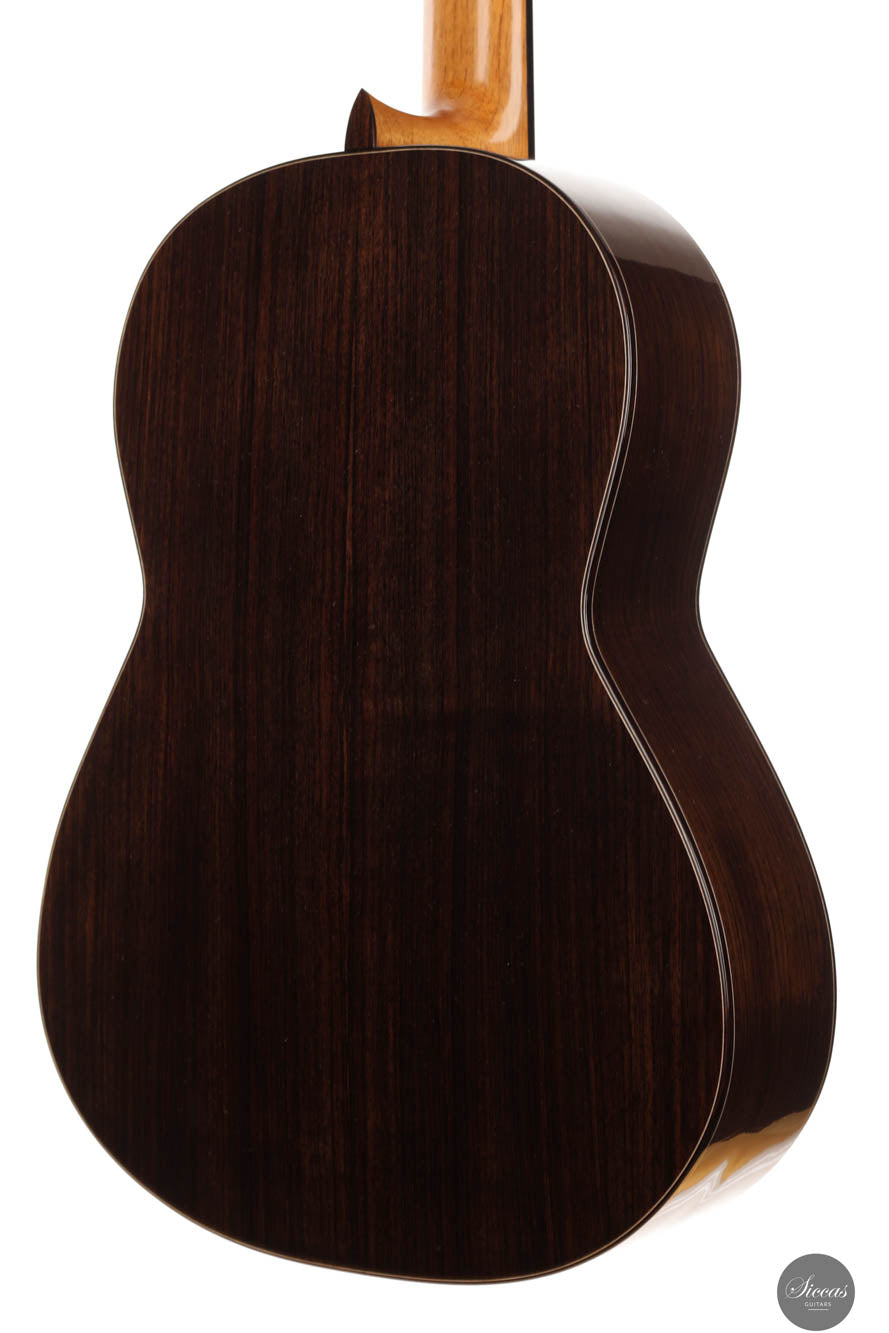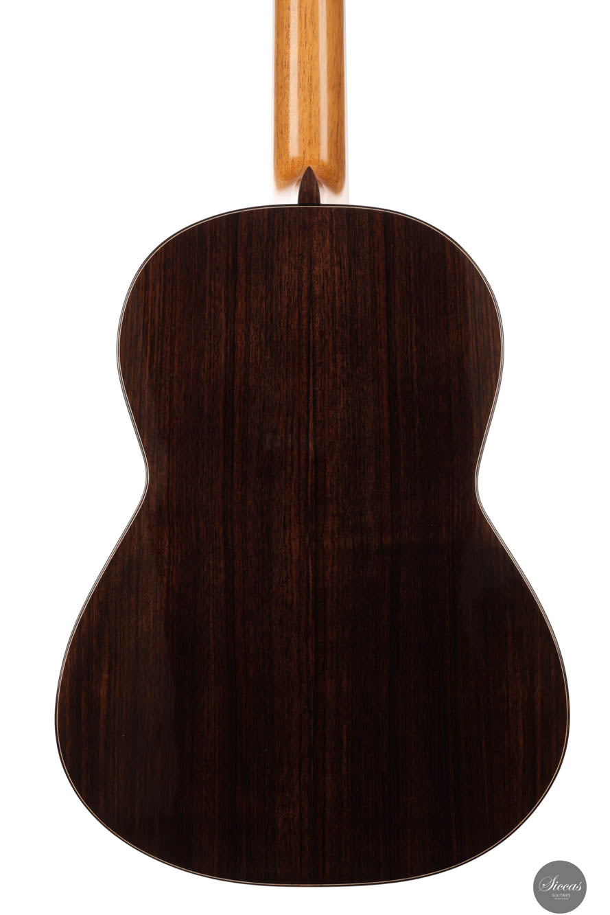 This exquisite guitar, crafted by a young and talented Italian luthier, features a top made from Italian alpine spruce sourced from the renowned Fiemme Valley, a region celebrated for its exceptional violin and guitar-making. The back, sides, bridge, head veneer, and bindings are all beautifully constructed from Indian rosewood, complementing the ebony fretboard and Spanish cedar neck. Equipped with Schaller Grand Tune machine heads and a 650mm scale, this guitar is designed for both resonance and comfort. The aim of this model is to deliver substantial projection and deep sound quality using traditional methods and materials. The top is light yet robust, reinforced by a five-strut variation of Robert Bouchet's design, enhancing the instrument's sustain, clarity of attack, and timbral variation. The C-shaped neck has been meticulously crafted to ensure maximum comfort for the player, making this guitar not only a testament to traditional craftsmanship but also a pleasure to play.