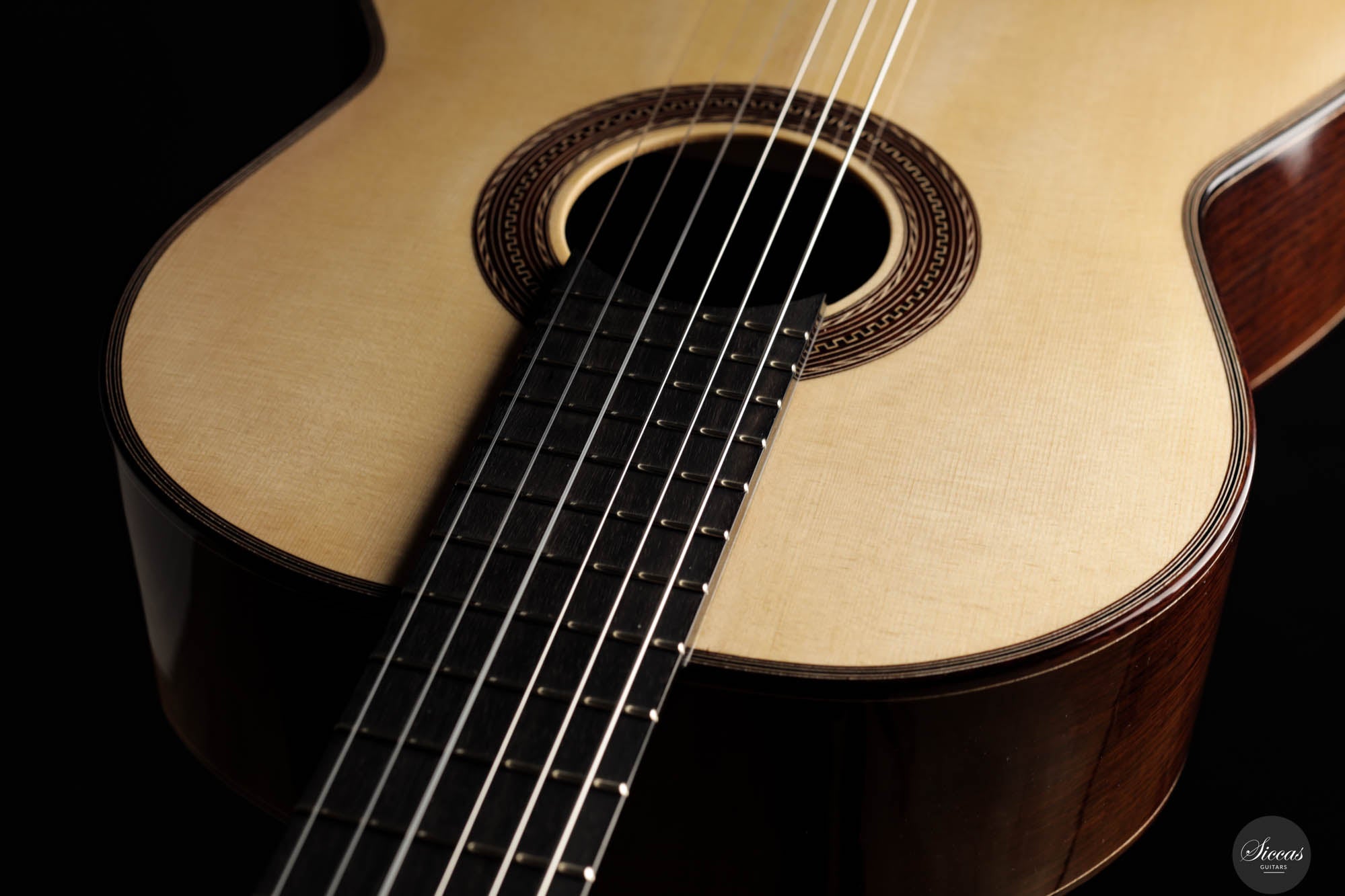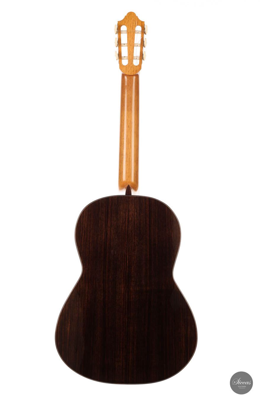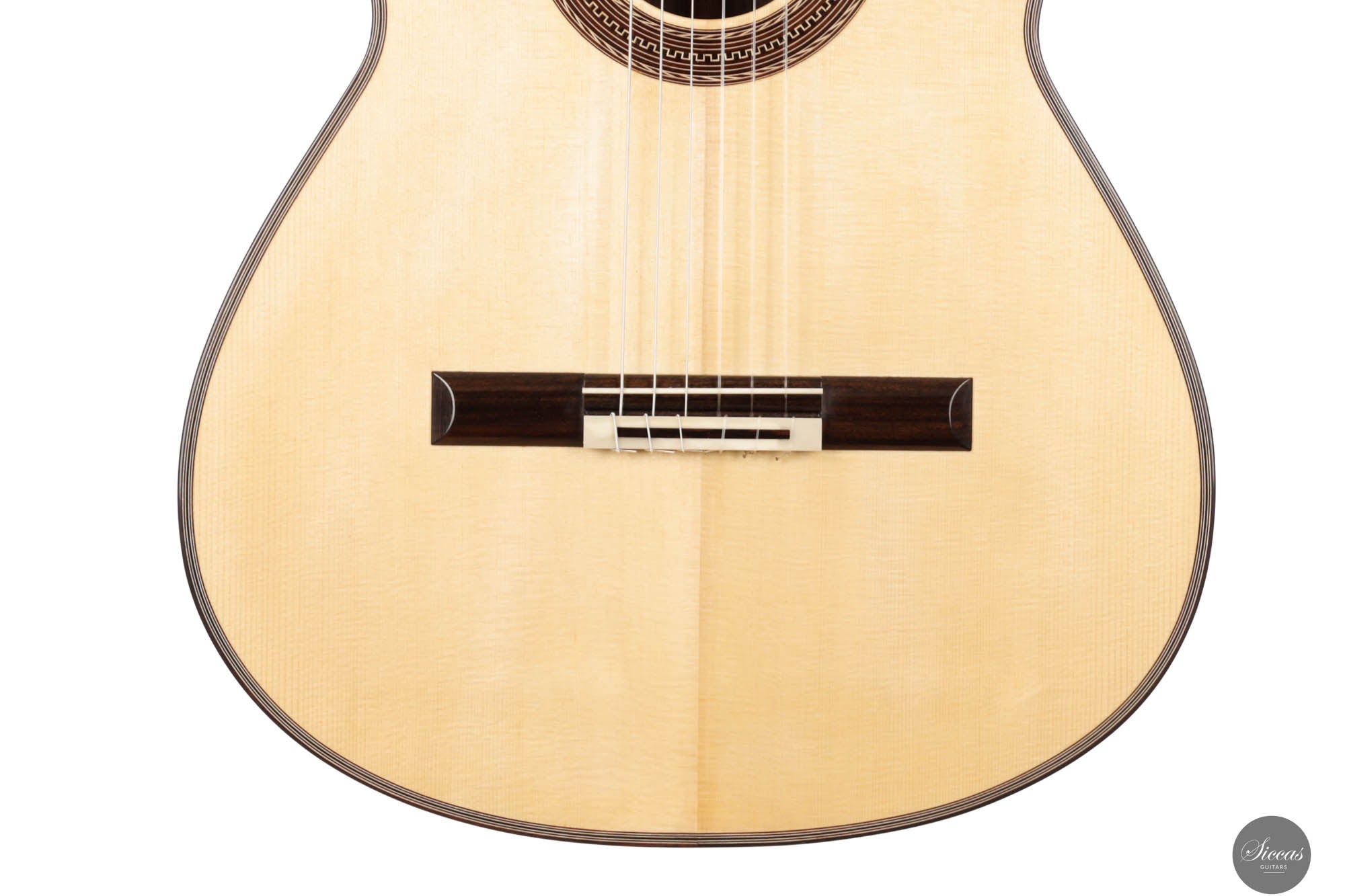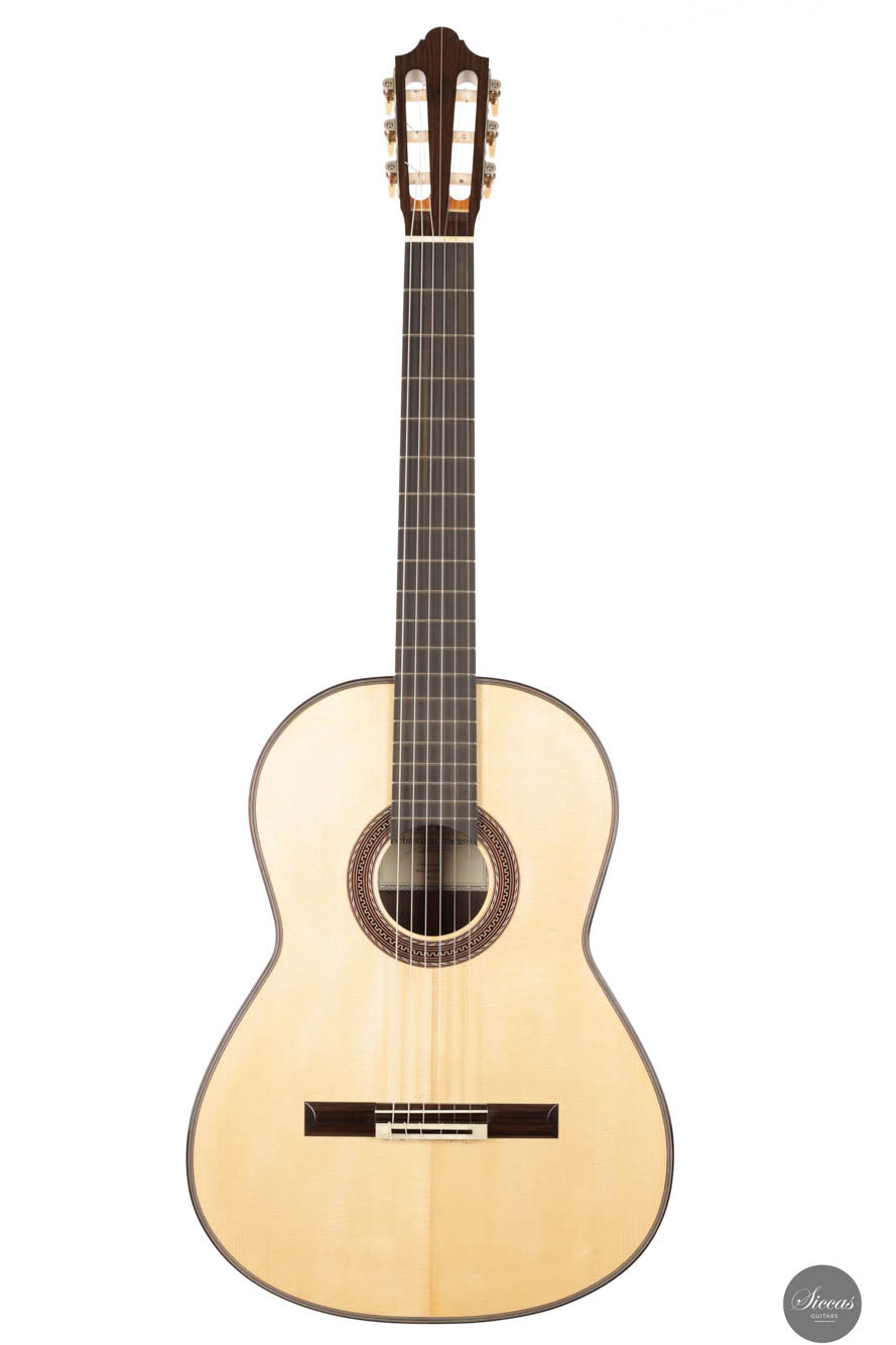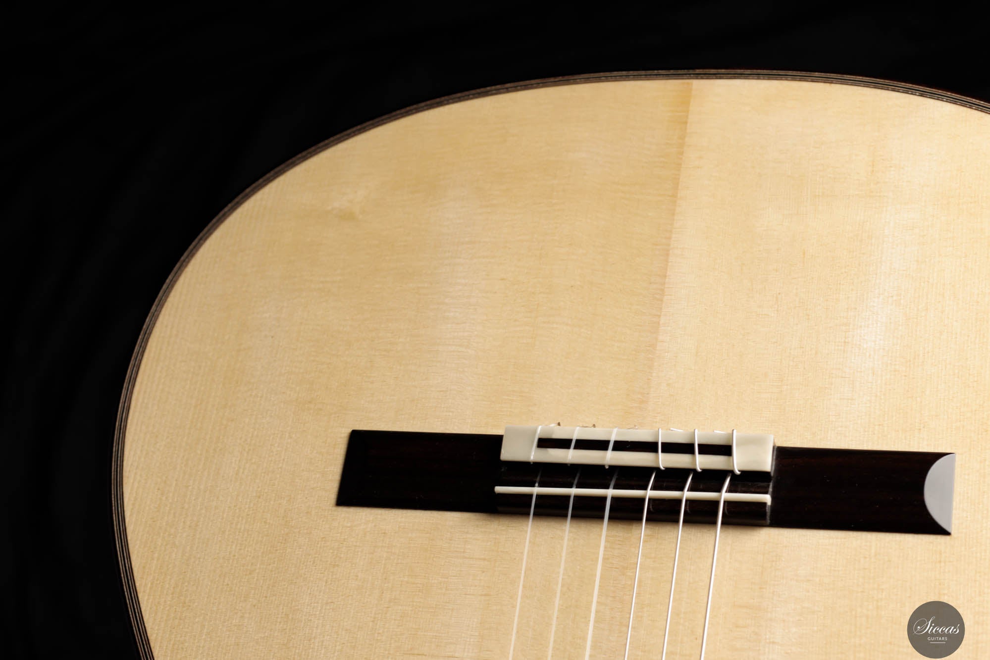 This exquisite guitar, crafted by a young and talented Italian luthier, features a top made from Italian alpine spruce sourced from the renowned Fiemme Valley, a region celebrated for its exceptional violin and guitar-making. The back, sides, bridge, head veneer, and bindings are all beautifully constructed from Indian rosewood, complementing the ebony fretboard and Spanish cedar neck. Equipped with Schaller Grand Tune machine heads and a 650mm scale, this guitar is designed for both resonance and comfort. The aim of this model is to deliver substantial projection and deep sound quality using traditional methods and materials. The top is light yet robust, reinforced by a five-strut variation of Robert Bouchet's design, enhancing the instrument's sustain, clarity of attack, and timbral variation. The C-shaped neck has been meticulously crafted to ensure maximum comfort for the player, making this guitar not only a testament to traditional craftsmanship but also a pleasure to play.