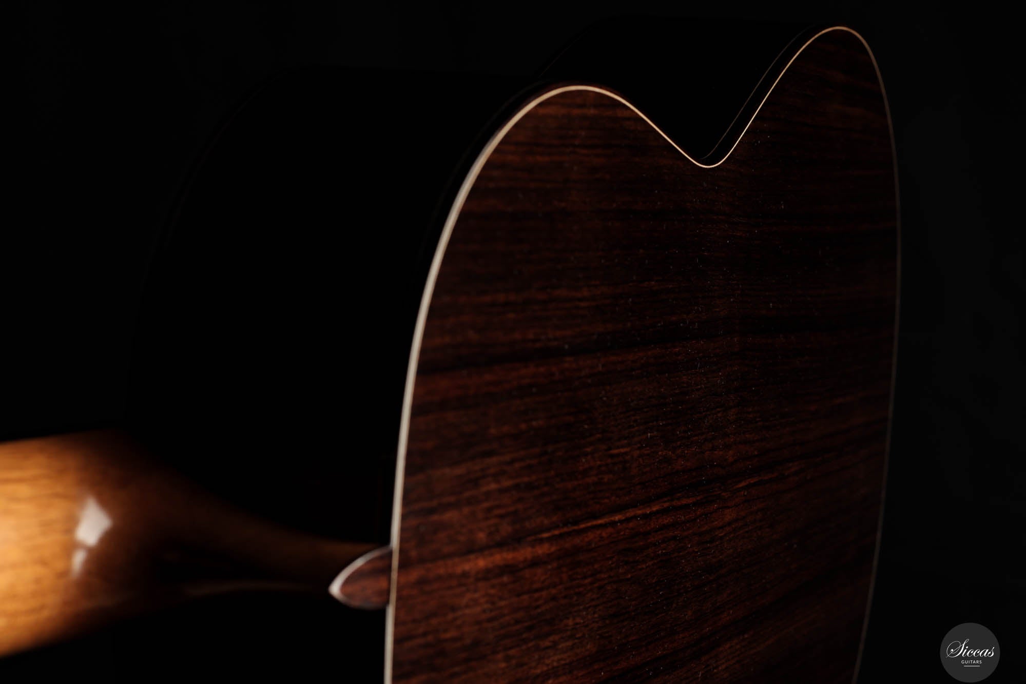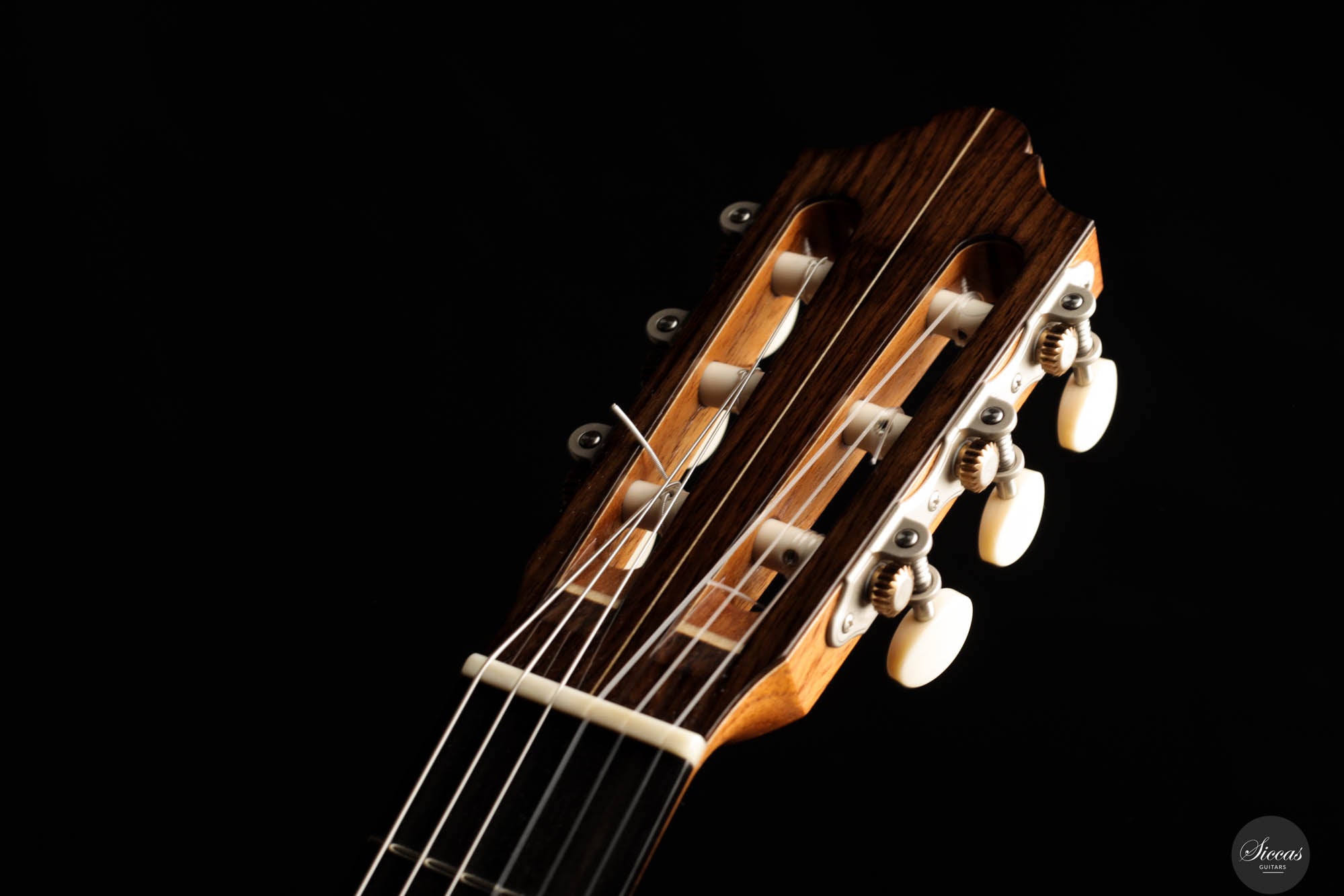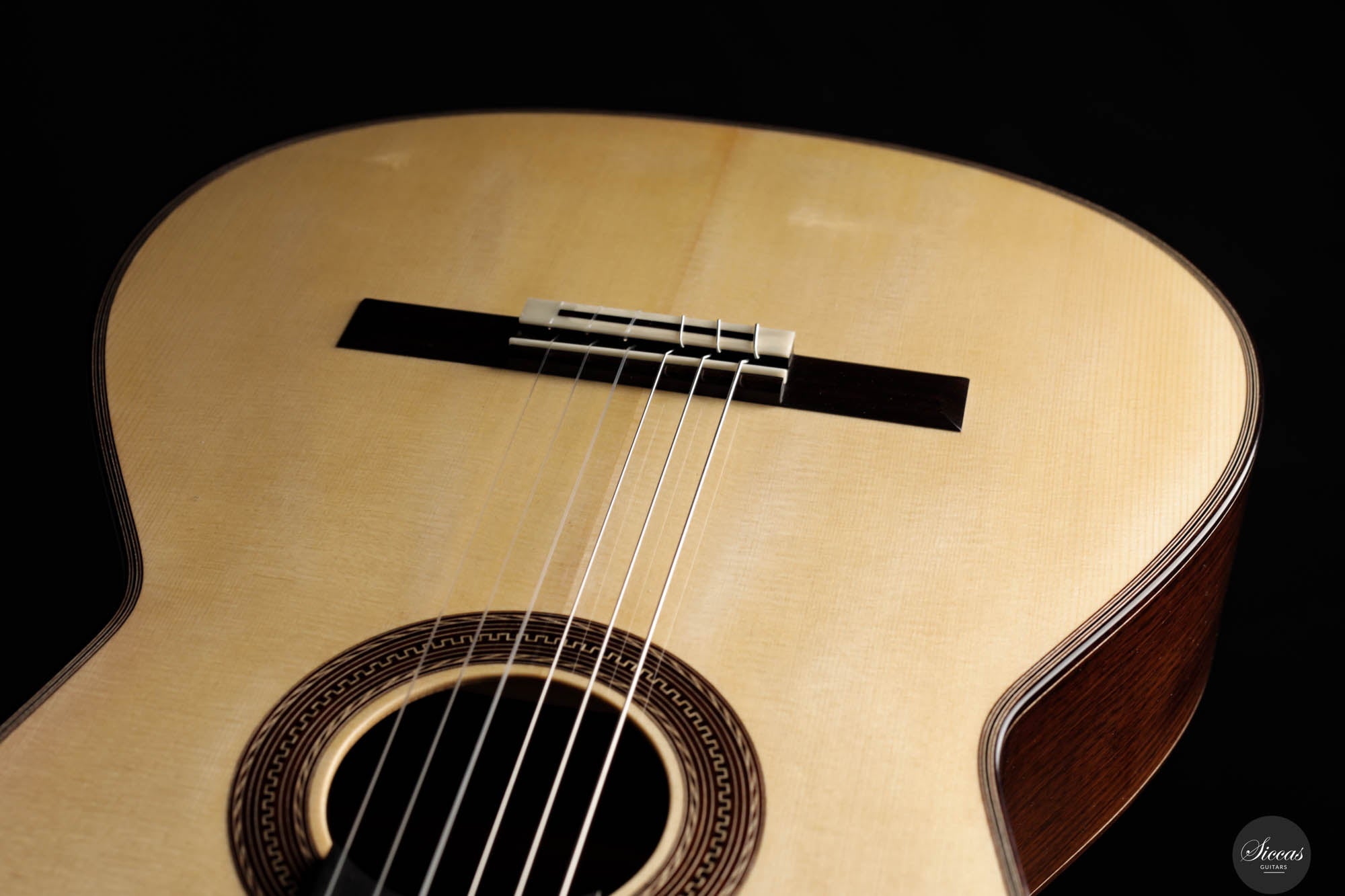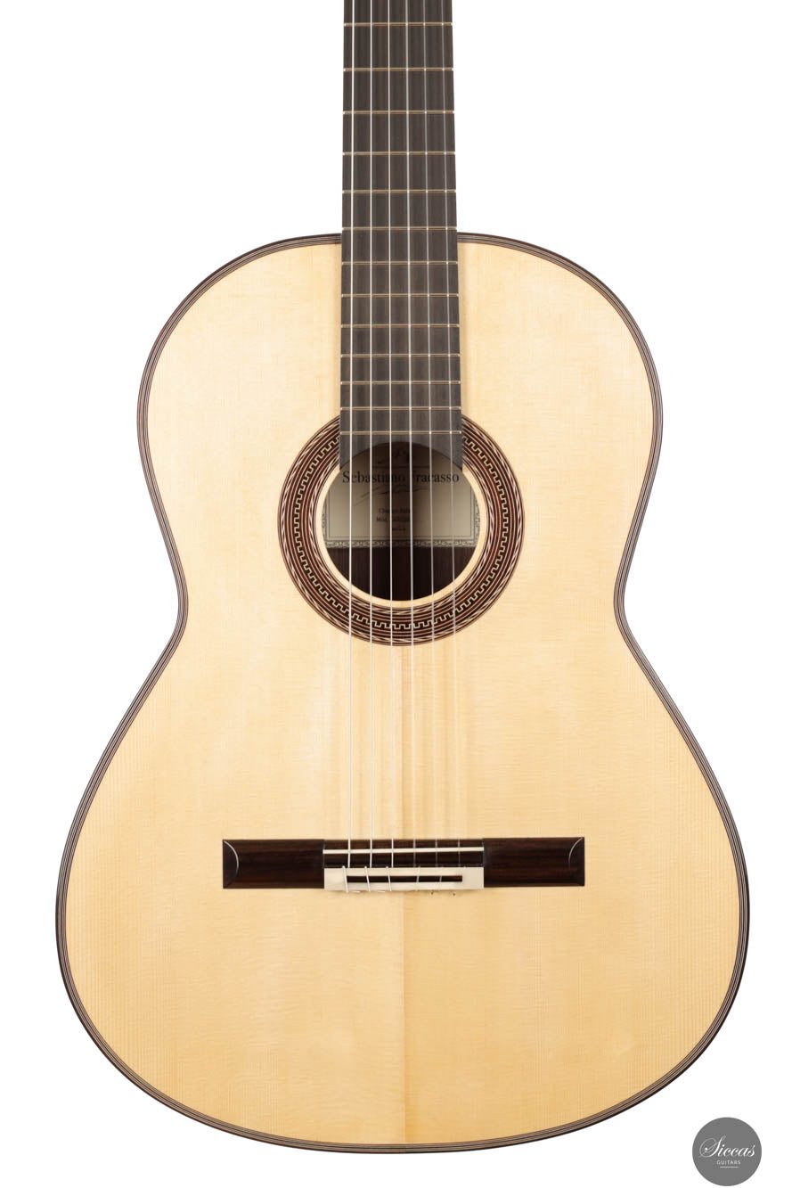 This exquisite guitar, crafted by a young and talented Italian luthier, features a top made from Italian alpine spruce sourced from the renowned Fiemme Valley, a region celebrated for its exceptional violin and guitar-making. The back, sides, bridge, head veneer, and bindings are all beautifully constructed from Indian rosewood, complementing the ebony fretboard and Spanish cedar neck. Equipped with Schaller Grand Tune machine heads and a 650mm scale, this guitar is designed for both resonance and comfort. The aim of this model is to deliver substantial projection and deep sound quality using traditional methods and materials. The top is light yet robust, reinforced by a five-strut variation of Robert Bouchet's design, enhancing the instrument's sustain, clarity of attack, and timbral variation. The C-shaped neck has been meticulously crafted to ensure maximum comfort for the player, making this guitar not only a testament to traditional craftsmanship but also a pleasure to play.