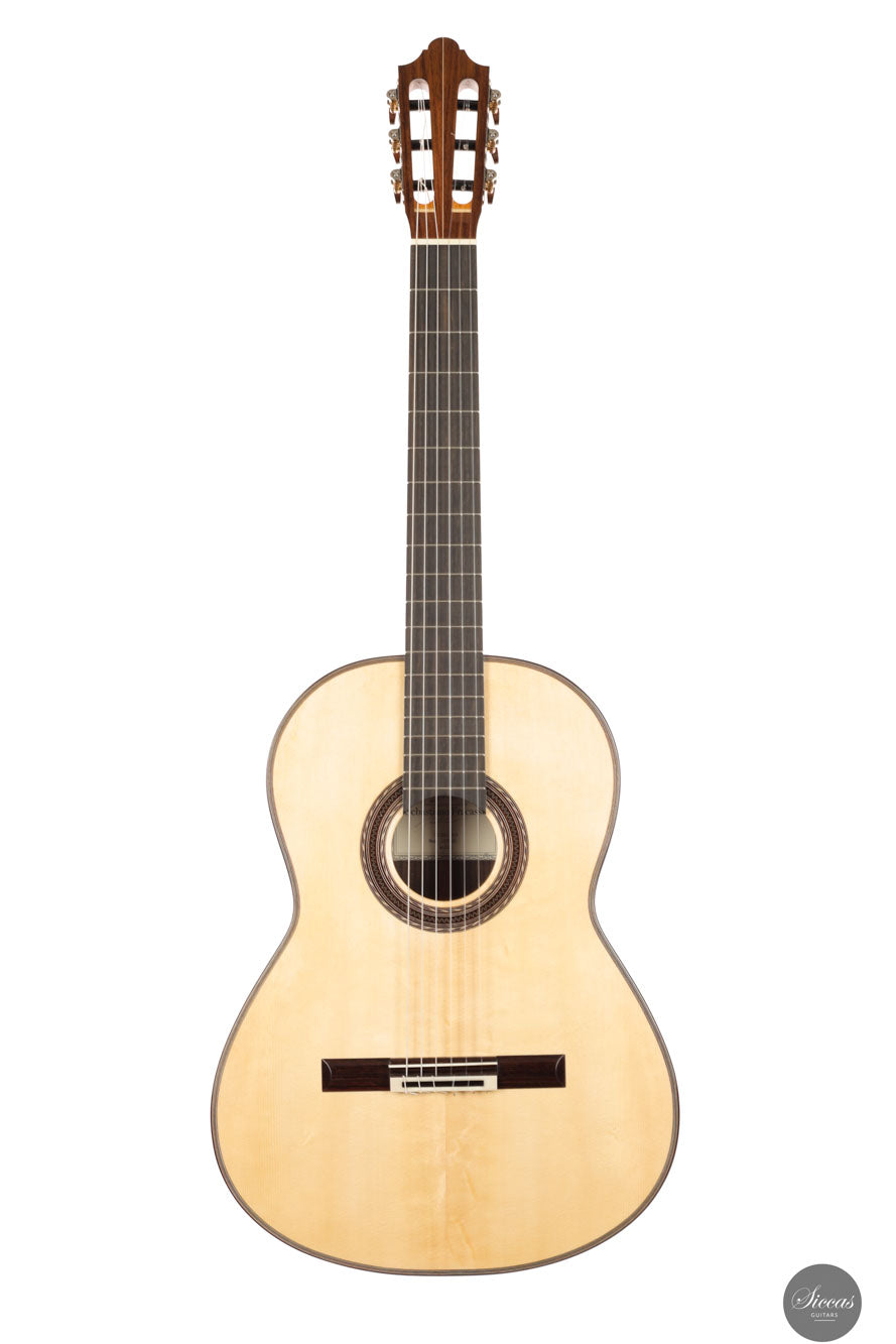 Aesthetically, the guitar features a clean, elegant design that reflects simplicity and balance. The rosette is a personal homage to Enrique Garcia, inspired by his mosaic motif resembling an alpine mountain chain, and echoes Garcia’s focus on lightness and refined decoration. This guitar also incorporates lessons and techniques from the luthier’s collaborations with European masters: the plantilla is derived from a 1964 Friedrich studied with Ennio, while the five-strut bracing pattern takes inspiration from a Bouchet built alongside Roberto De Miranda. Combining traditional craftsmanship with innovative ideas, this instrument is the result of the luthier’s dedication to creating a guitar that bridges the past and present, offering superb tonal quality, projection, and playability.