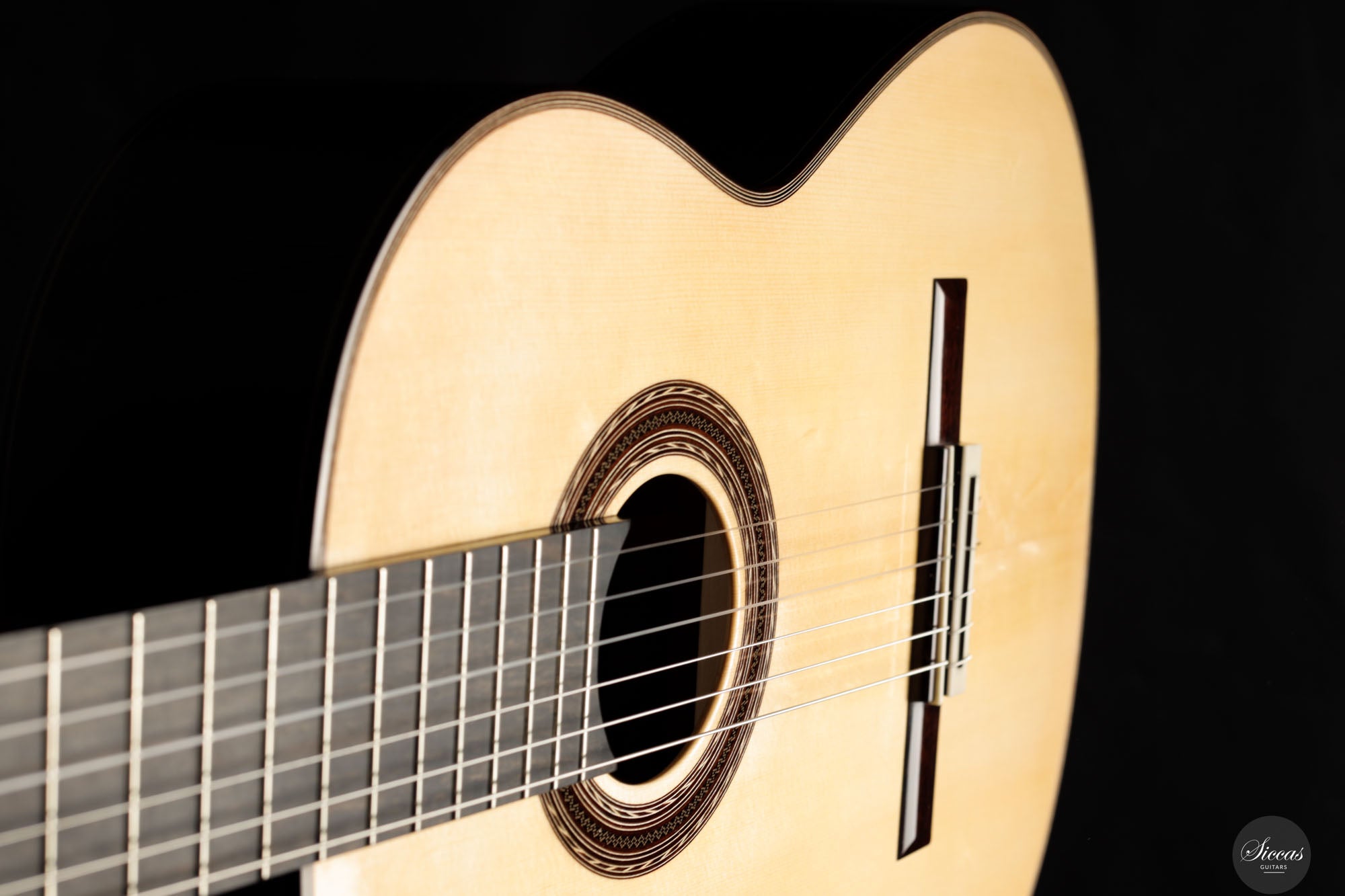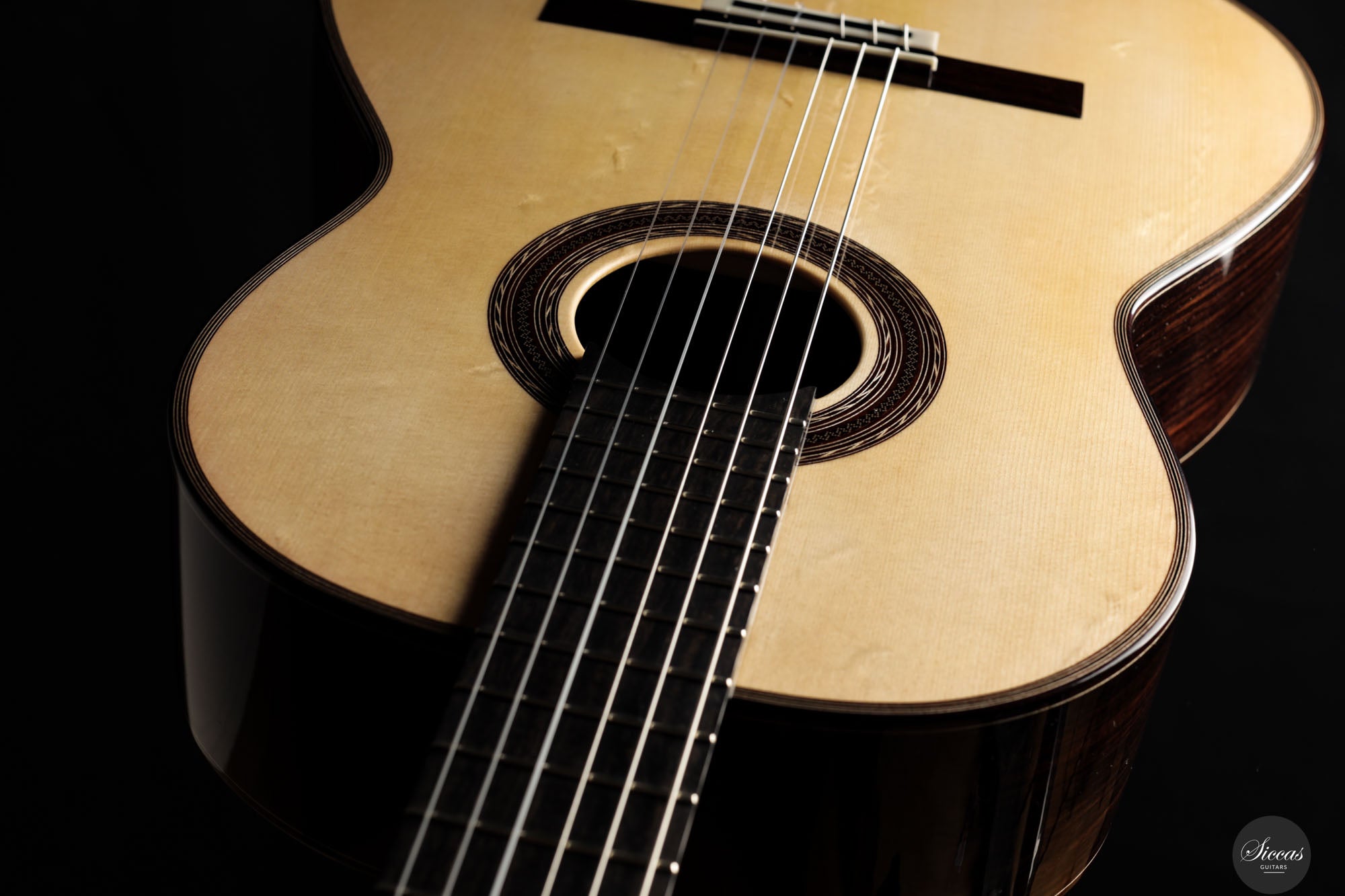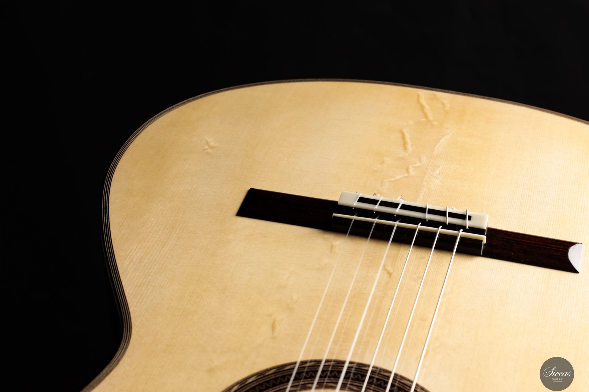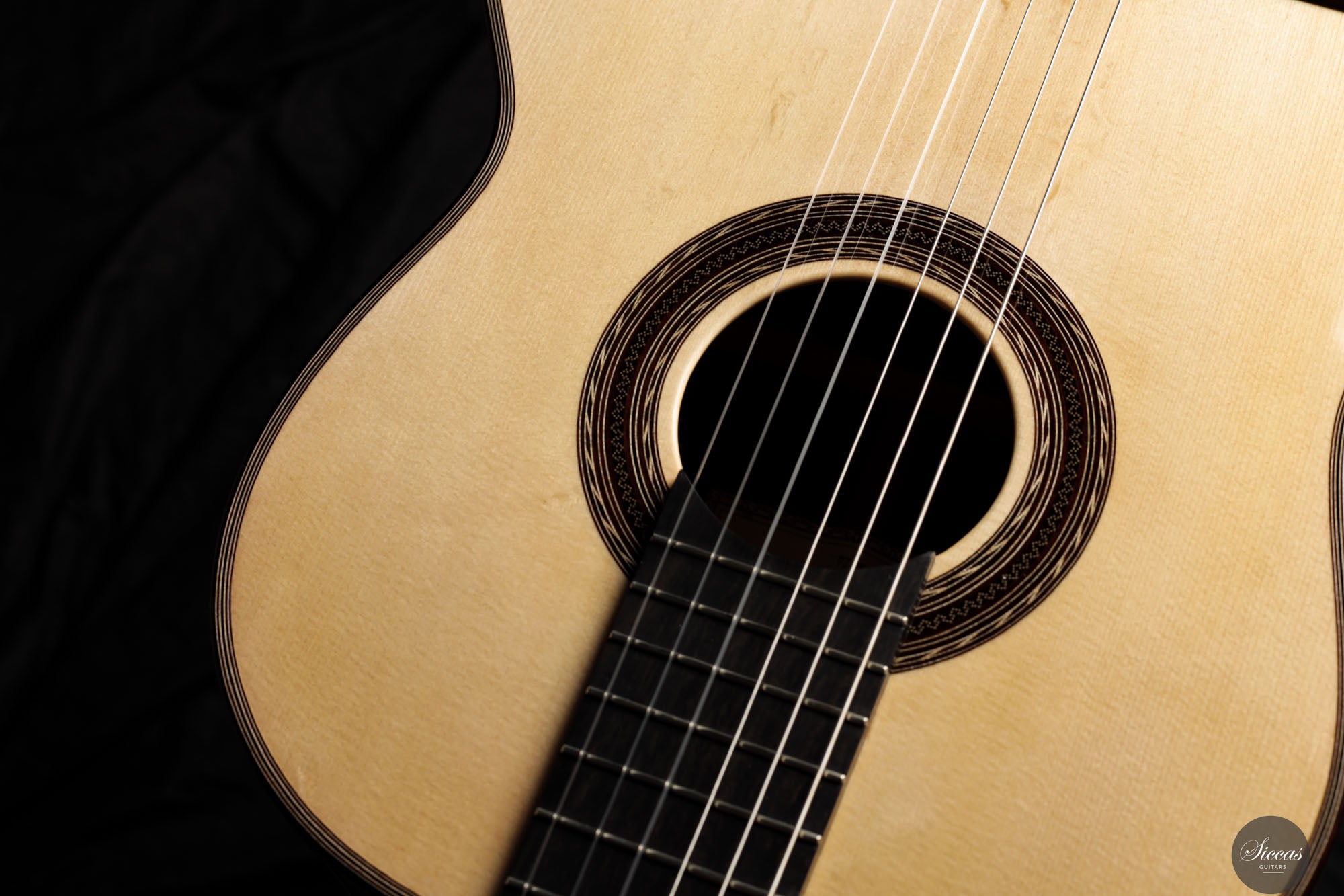 This guitar is crafted with the goal of being lightweight and highly projecting, designed to fill the vast silence of a theater while delivering the tonal quality, colors, and richness sought by both guitarists and listeners. The Alpine spruce soundboard, sourced from Val di Fiemme, is both light and stiff, making it ideal for producing a deep, satisfying sound. Its construction features a five-strut reinforcement system that allows the top exceptional freedom of movement while controlling vibrations with a fan brace system, a thin bridge plate, and a small cedar "supportive bar." This combination enhances projection and creates a resonant, full-sounding top. The back and sides, made from dark and stiff Indian rosewood, are meticulously braced and adjusted to match each panel’s density and dimensions, while the thin, reinforced sides form a rigid yet lightweight structure, ensuring a resonant box that complements the top. The neck, carved in a comfortable C shape, is crafted with attention to wood density and grain direction, offering excellent playability and ergonomic comfort.