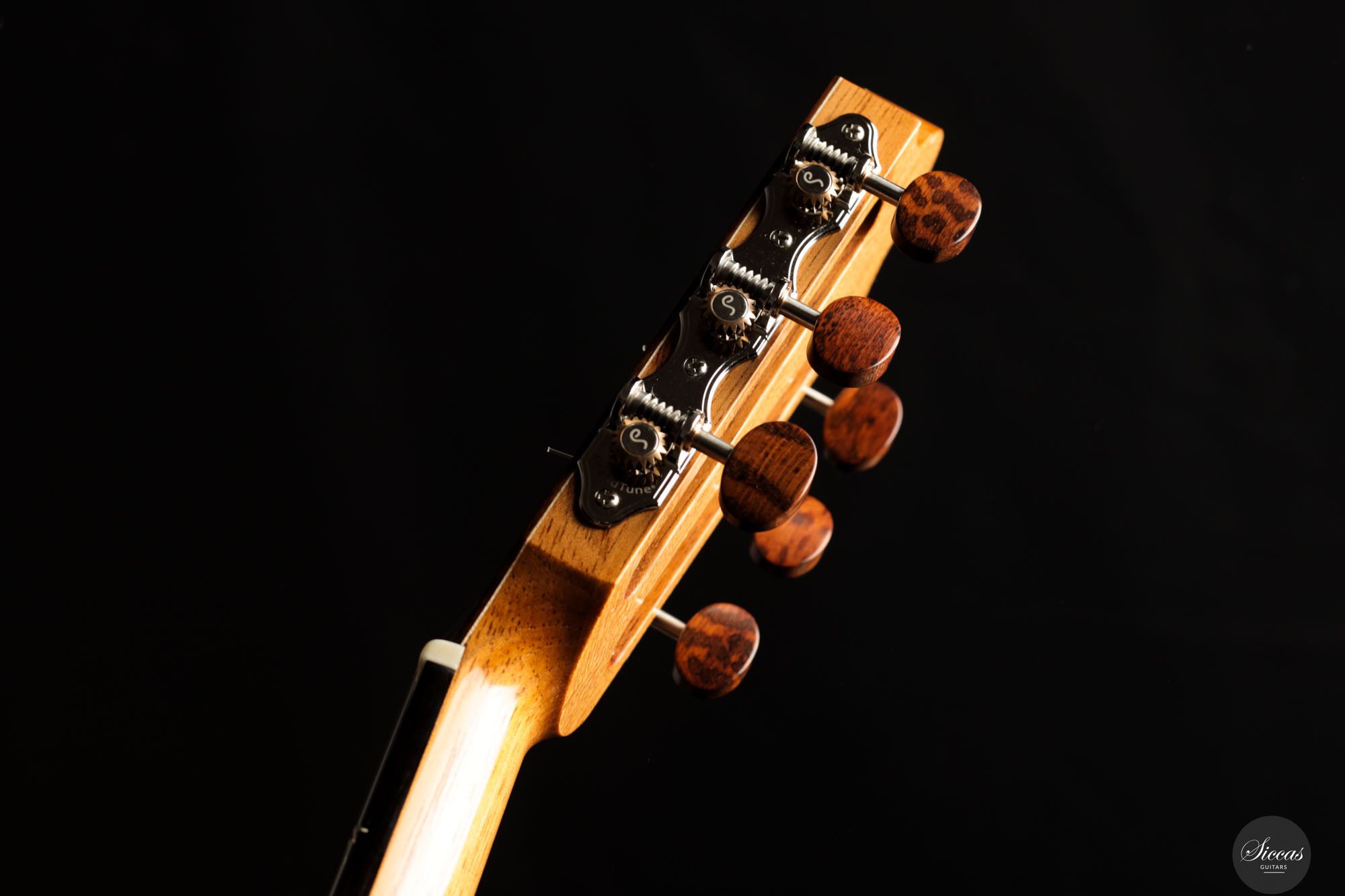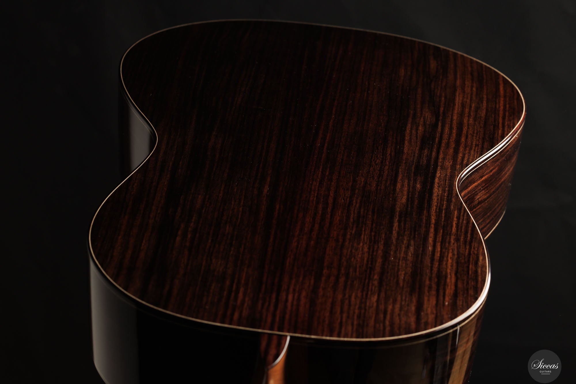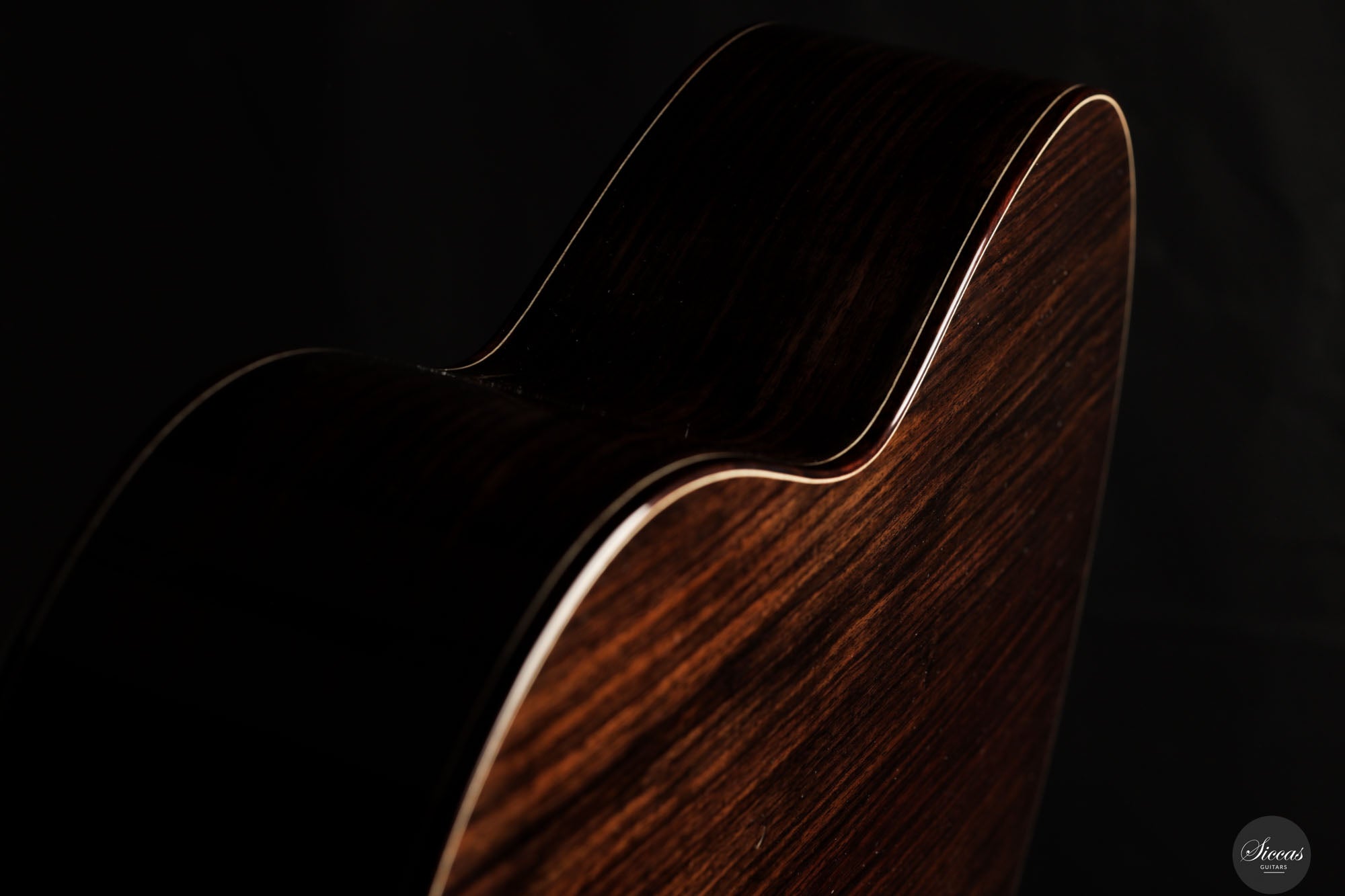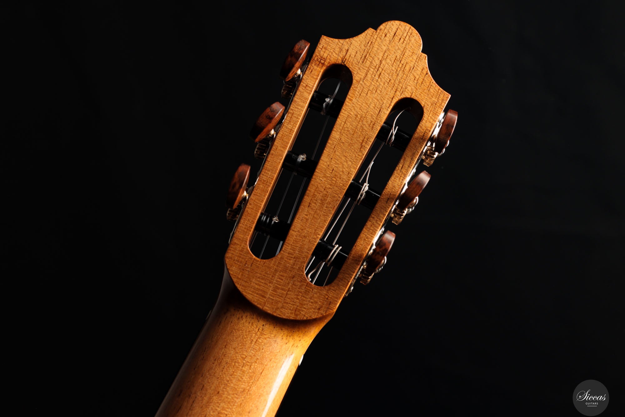 This guitar is crafted with the goal of being lightweight and highly projecting, designed to fill the vast silence of a theater while delivering the tonal quality, colors, and richness sought by both guitarists and listeners. The Alpine spruce soundboard, sourced from Val di Fiemme, is both light and stiff, making it ideal for producing a deep, satisfying sound. Its construction features a five-strut reinforcement system that allows the top exceptional freedom of movement while controlling vibrations with a fan brace system, a thin bridge plate, and a small cedar "supportive bar." This combination enhances projection and creates a resonant, full-sounding top. The back and sides, made from dark and stiff Indian rosewood, are meticulously braced and adjusted to match each panel’s density and dimensions, while the thin, reinforced sides form a rigid yet lightweight structure, ensuring a resonant box that complements the top. The neck, carved in a comfortable C shape, is crafted with attention to wood density and grain direction, offering excellent playability and ergonomic comfort.