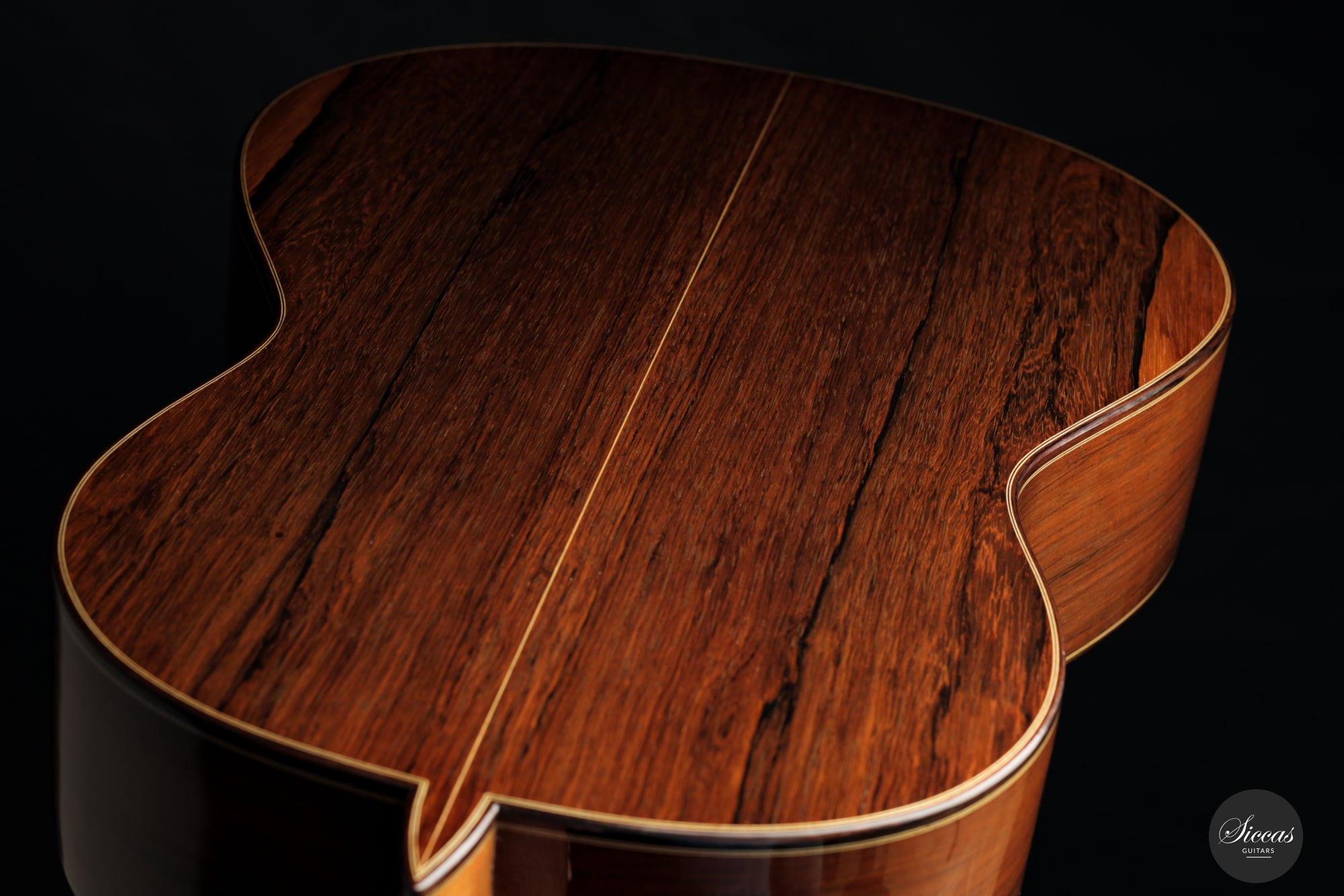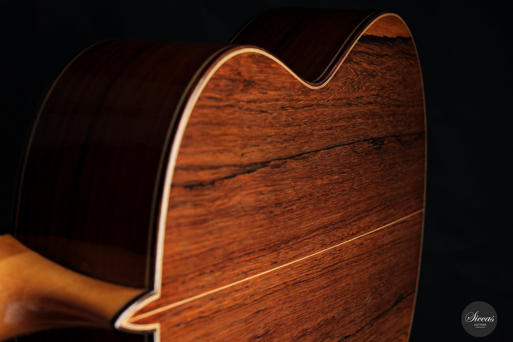 Die Kombination aus mit Kunstlack versiegeltem Boden und Zargen und der mit Schallack handpolierten Decke ist sowohl zweckmäßig als auch ästhetisch ansprechend. Die Lackierung des Bodens und der Zargen bietet Haltbarkeit und Schutz, so dass sie für einen intensiven Gebrauch geeignet ist. Andererseits unterstützt die Schellackpolitur der Decke die natürliche Resonanz des Holzes und trägt so zum vollen und ausdrucksstarken Klang der Gitarre bei.