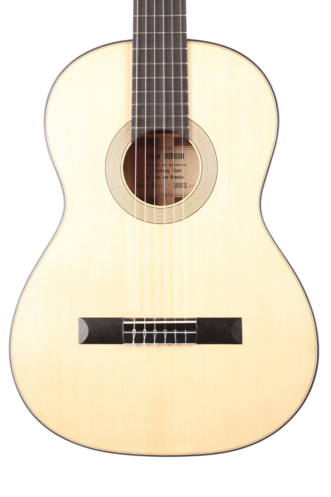 Simon Burgun studierte Gitarrenbau in Belgien am "Center voor Muziekinstrumentenbouw" bei Walter Verreydt und Karel Dedain. Er wurde mit dem "De Gouden Bootschaaft" Preis für die Qualität seiner Arbeit ausgezeichnet. Simon hat sich auf den Nachbau historischer Instrumente spezialisiert, wie z.B. romantischer Gitarren aus Frankreich, oder Wiener Modellen. Außerdem hat er sich auf die Restaurierung von Instrumenten fokussiert. Sein Atelier hat er in Straßburg eröffnet.