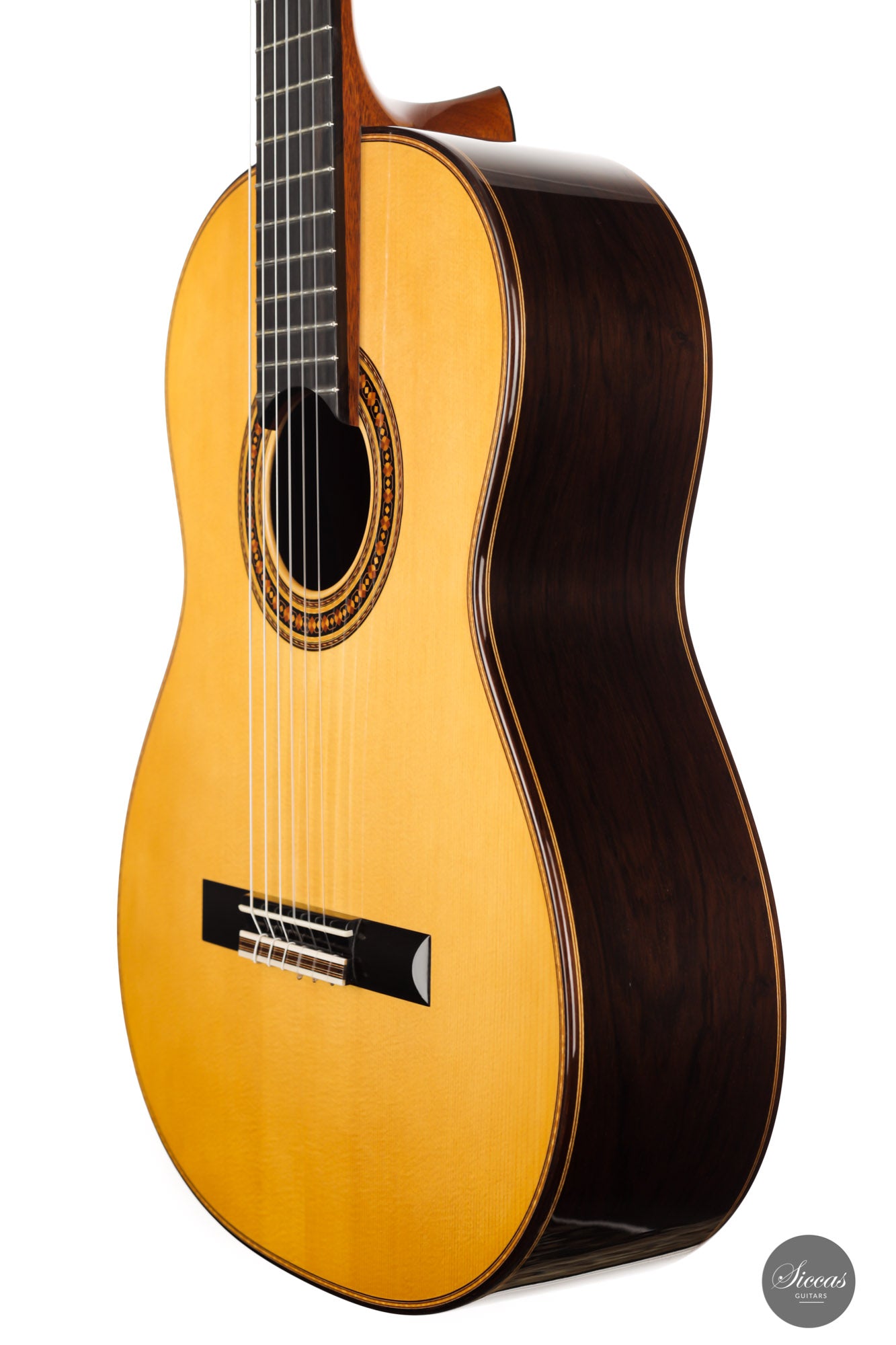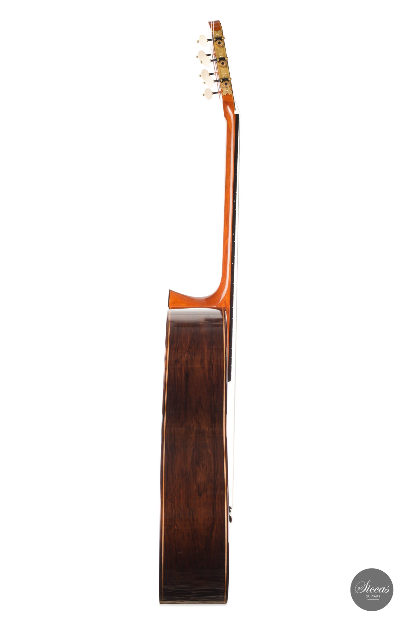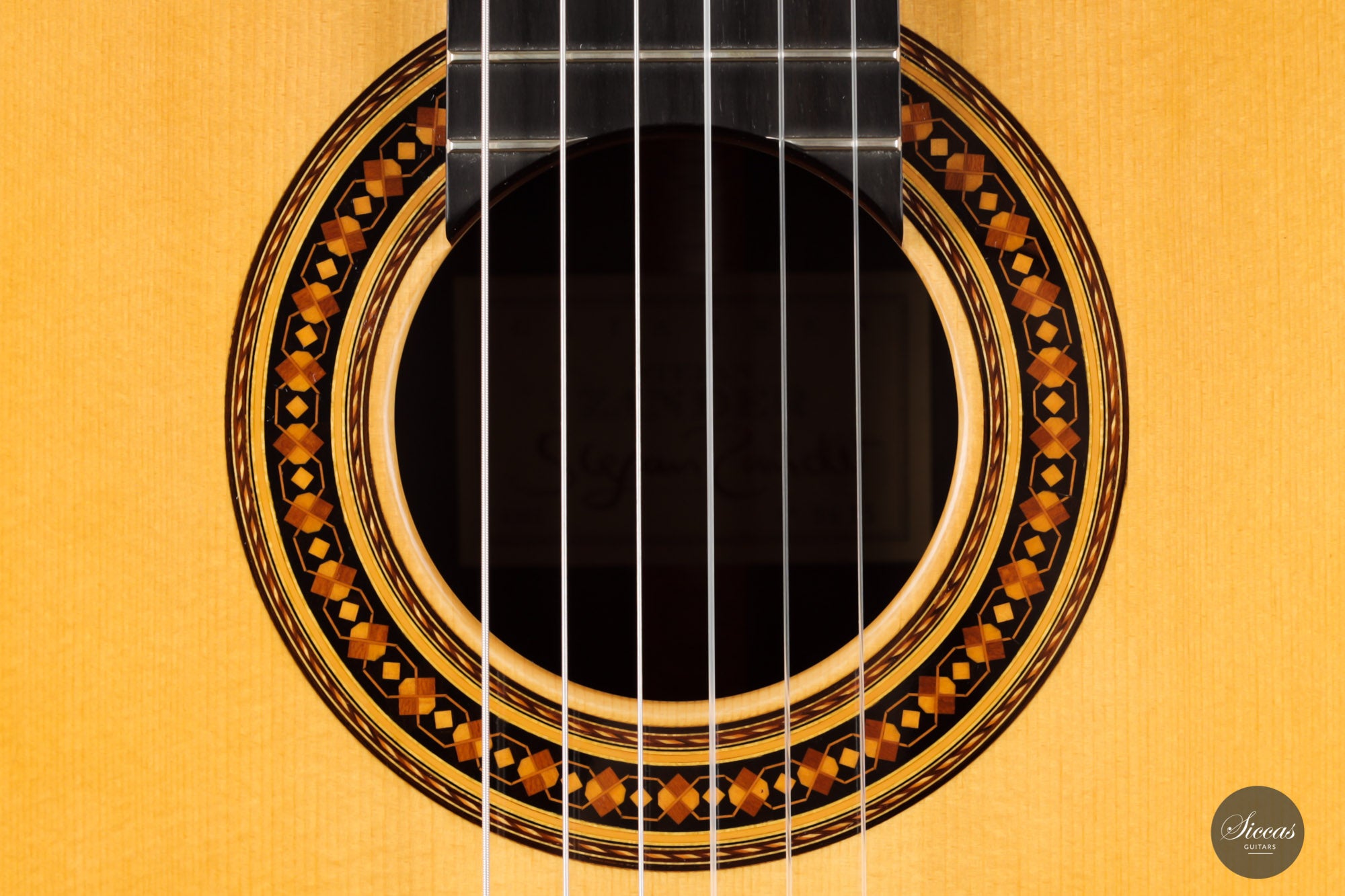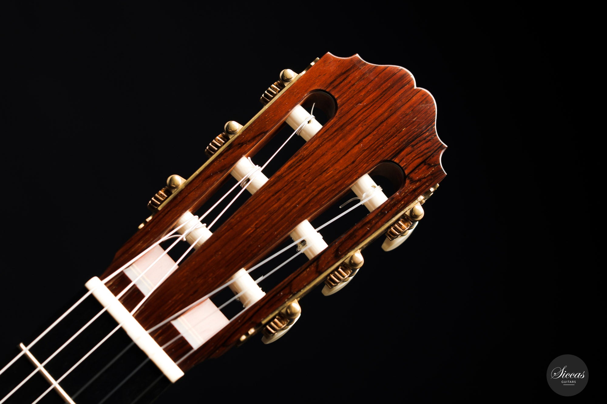 This wonderful guitar is an absolute powerhouse, built with a spruce top and a fine CITES-certified Rio rosewood for the back and sides. The traditional fan bracing is composed of spruce and cedar bracing arranged in a unique way to optimize sound production. As a result, this instrument offers generous harmonic resonance, a full sound, and excellent dynamic capabilities. It is in very nice condition with only a few playing marks. The stylefully engraved Scheller tuners underline furthermore the classy character of this concert guitar of the highest quality.