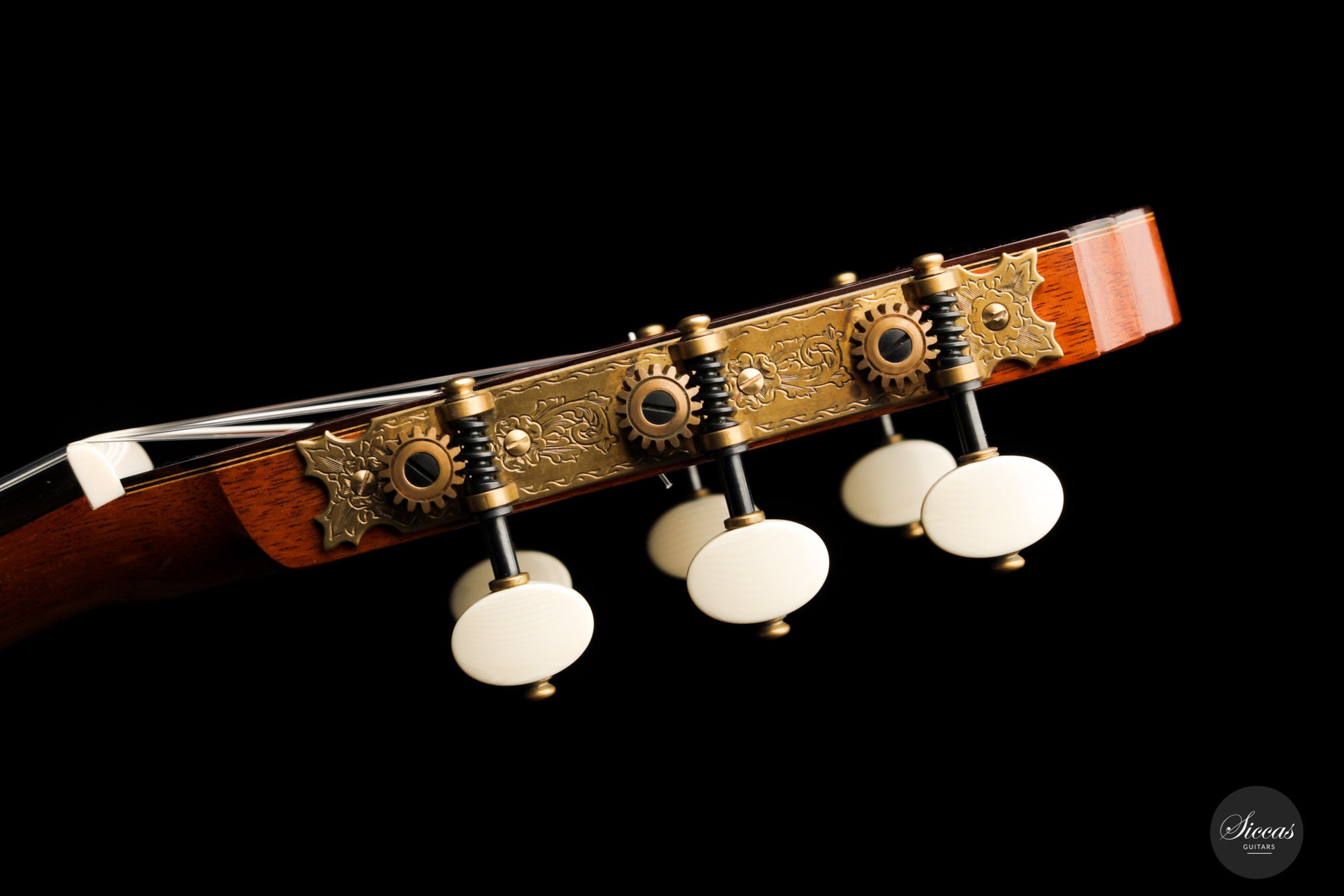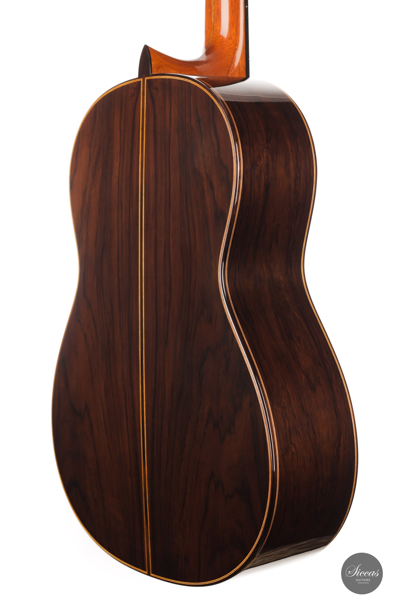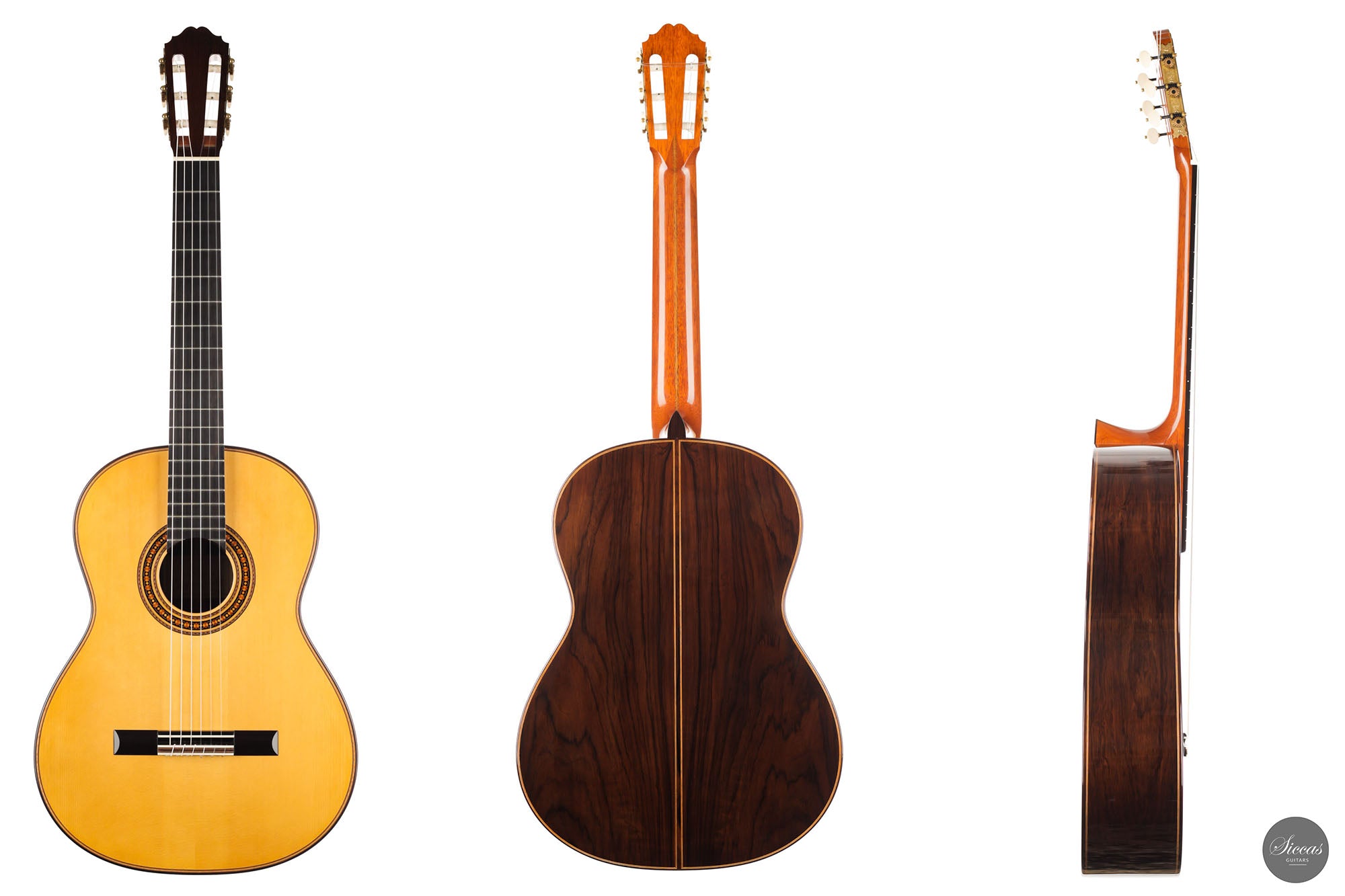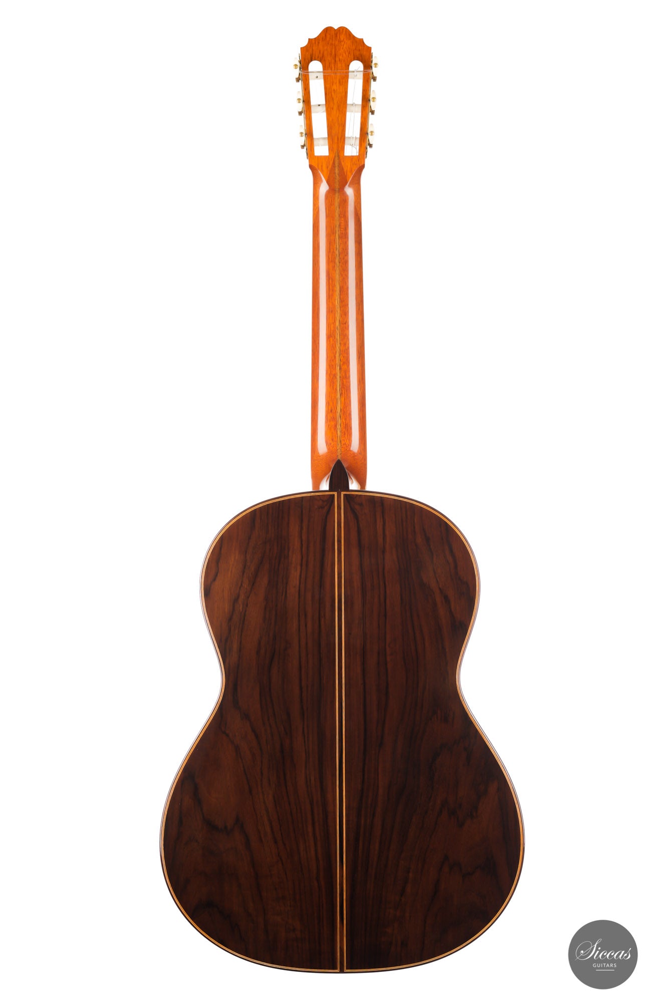 This wonderful guitar is an absolute powerhouse, built with a spruce top and a fine CITES-certified Rio rosewood for the back and sides. The traditional fan bracing is composed of spruce and cedar bracing arranged in a unique way to optimize sound production. As a result, this instrument offers generous harmonic resonance, a full sound, and excellent dynamic capabilities. It is in very nice condition with only a few playing marks. The stylefully engraved Scheller tuners underline furthermore the classy character of this concert guitar of the highest quality.