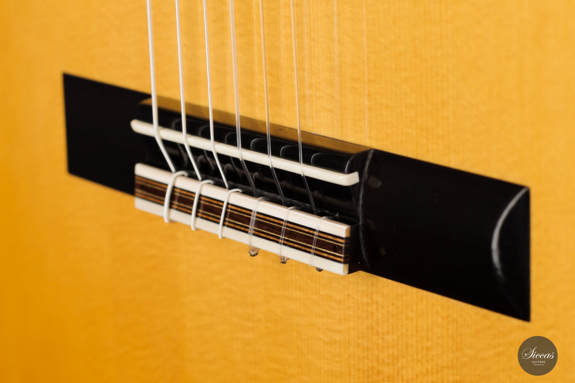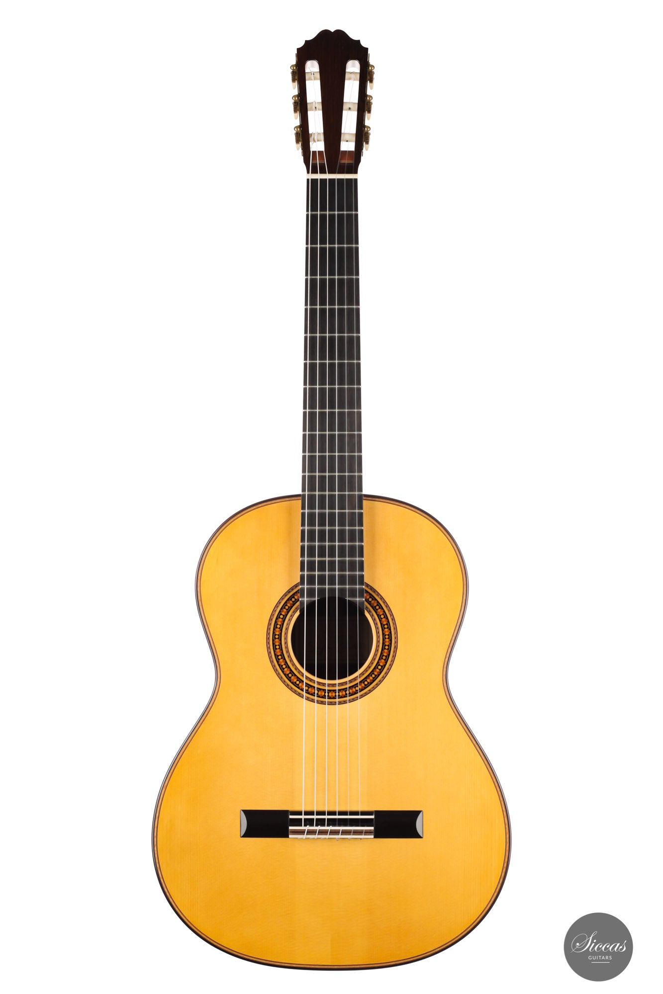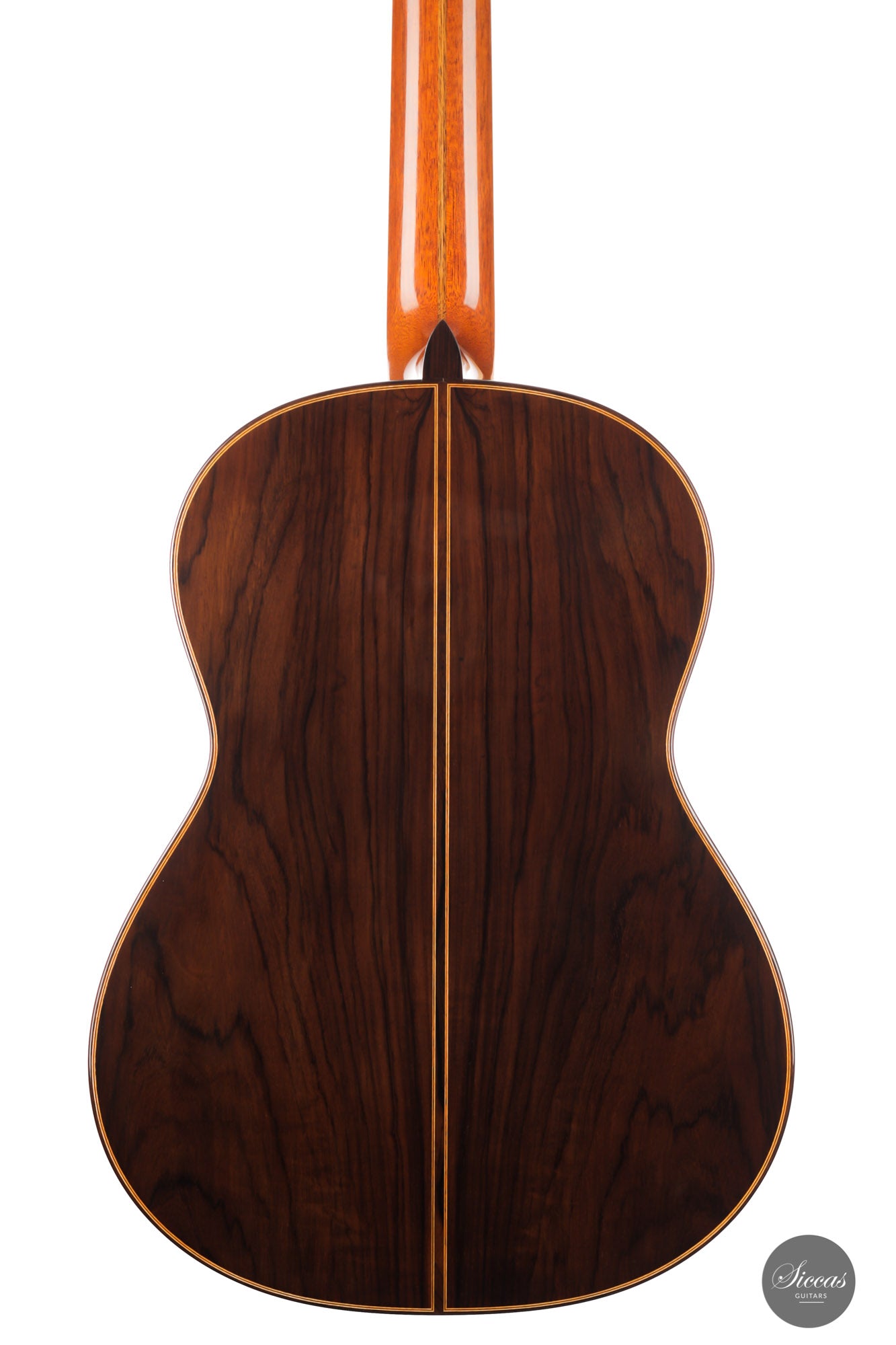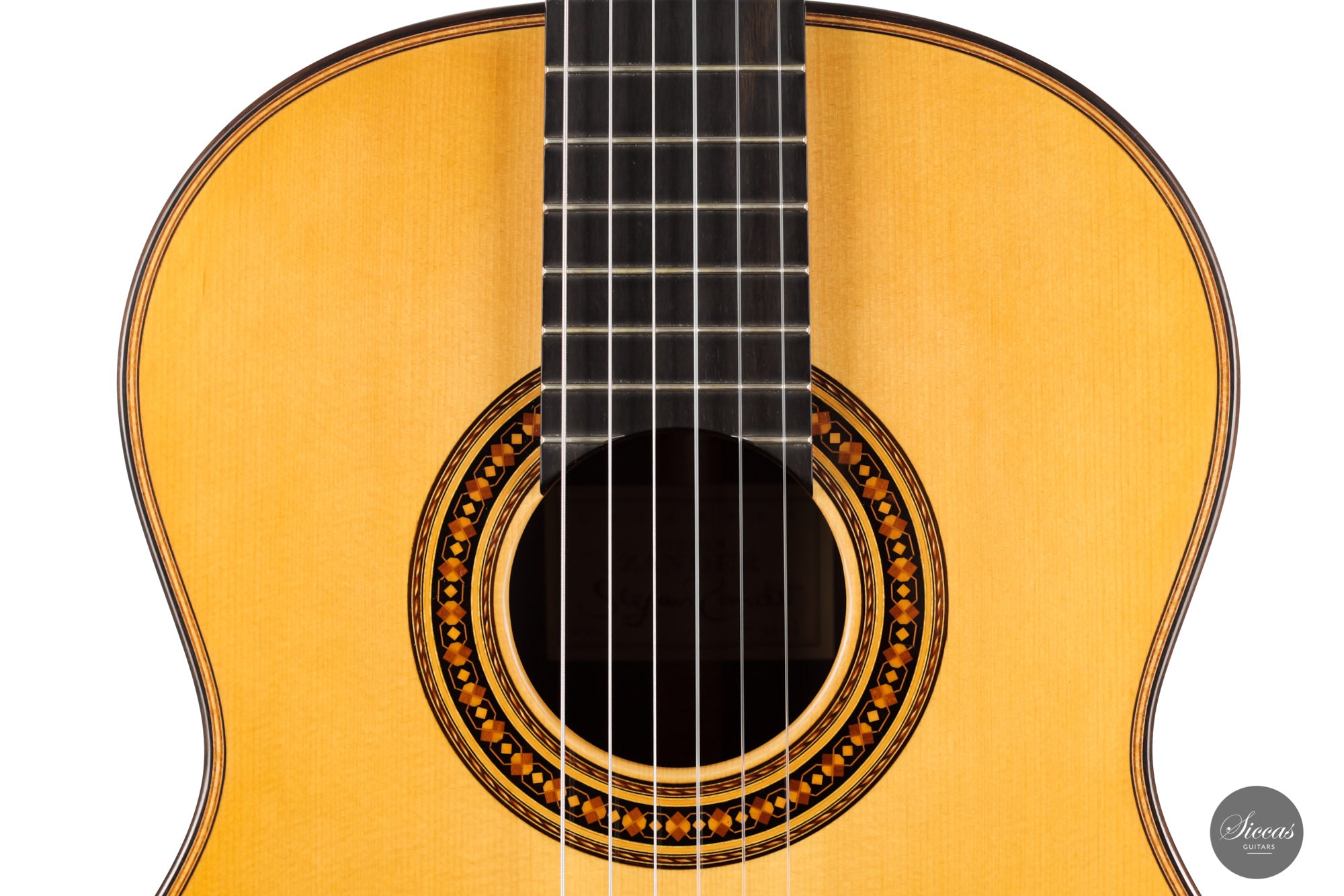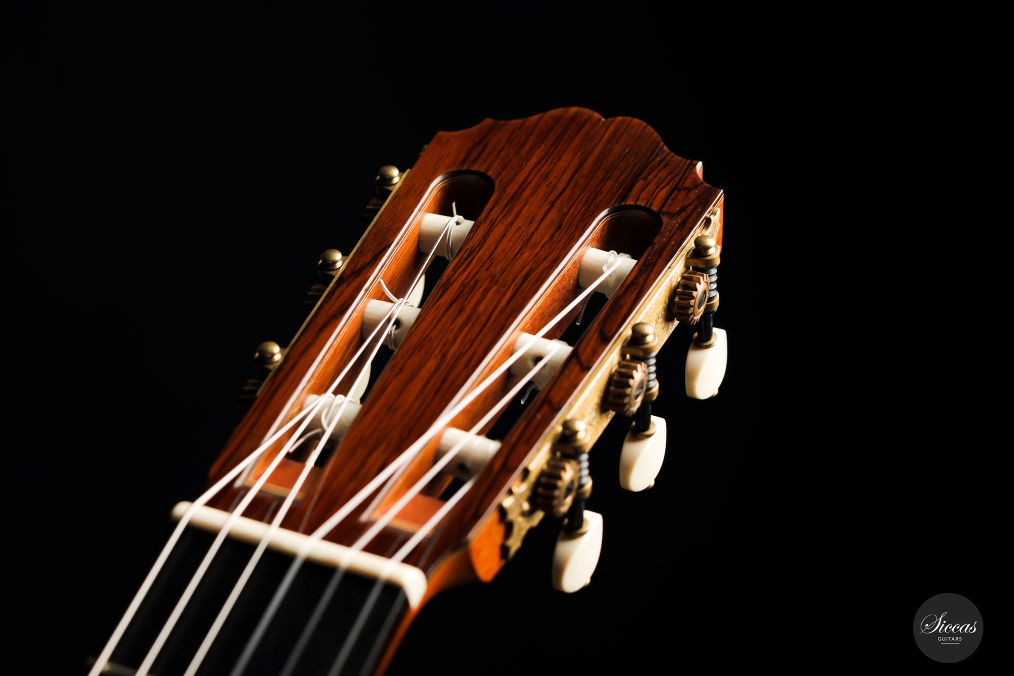This wonderful guitar is an absolute powerhouse, built with a spruce top and a fine CITES-certified Rio rosewood for the back and sides. The traditional fan bracing is composed of spruce and cedar bracing arranged in a unique way to optimize sound production. As a result, this instrument offers generous harmonic resonance, a full sound, and excellent dynamic capabilities. It is in very nice condition with only a few playing marks. The stylefully engraved Scheller tuners underline furthermore the classy character of this concert guitar of the highest quality.